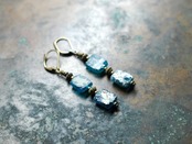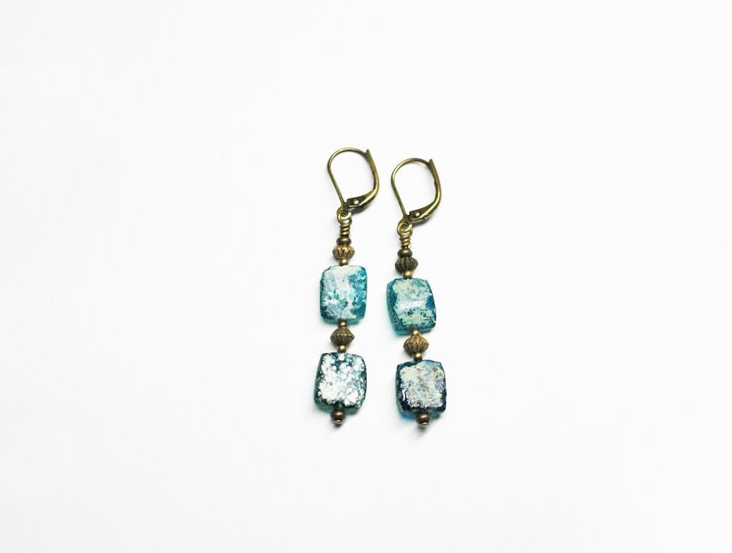 銀化ブルーブルーローマングラスと古い真鍮ビーズのピアス