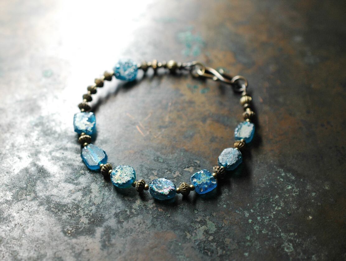 銀化ブルーブルーローマングラスと古い真鍮ビーズのブレス