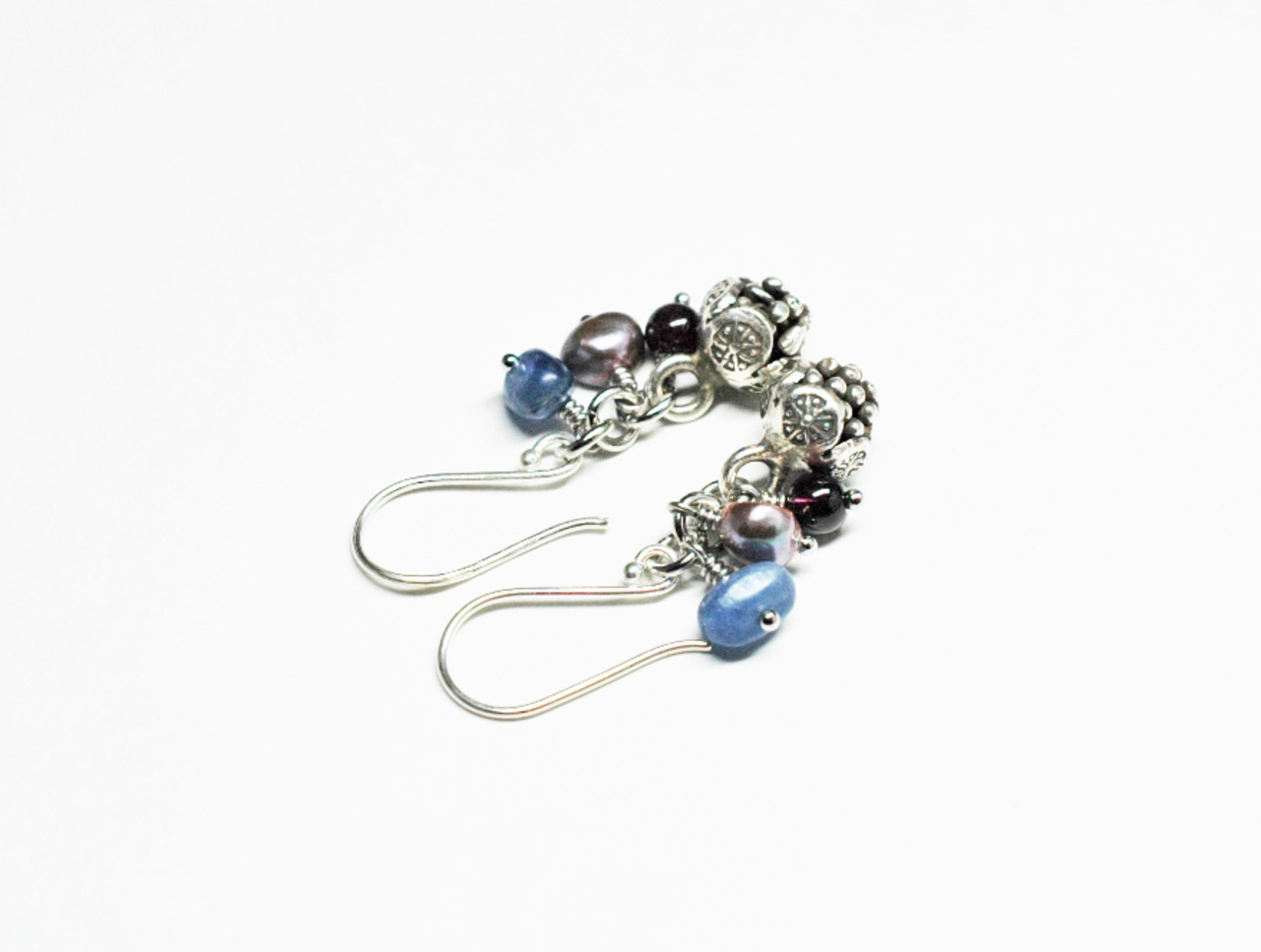 カイヤナイトとガーネット、バロックパールとカレンシルバーチャームを繋いだピアスです。