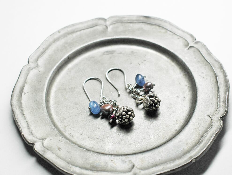 カイヤナイト、ガーネット、バロックパールとコロンと丸いカレンシルバーのお花ピアス