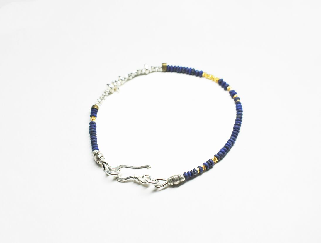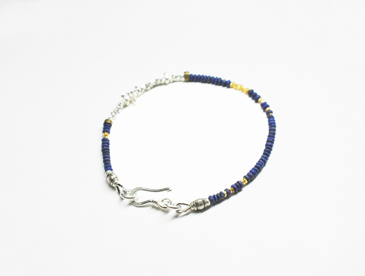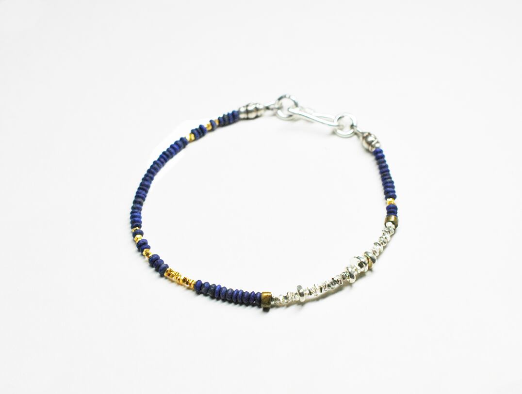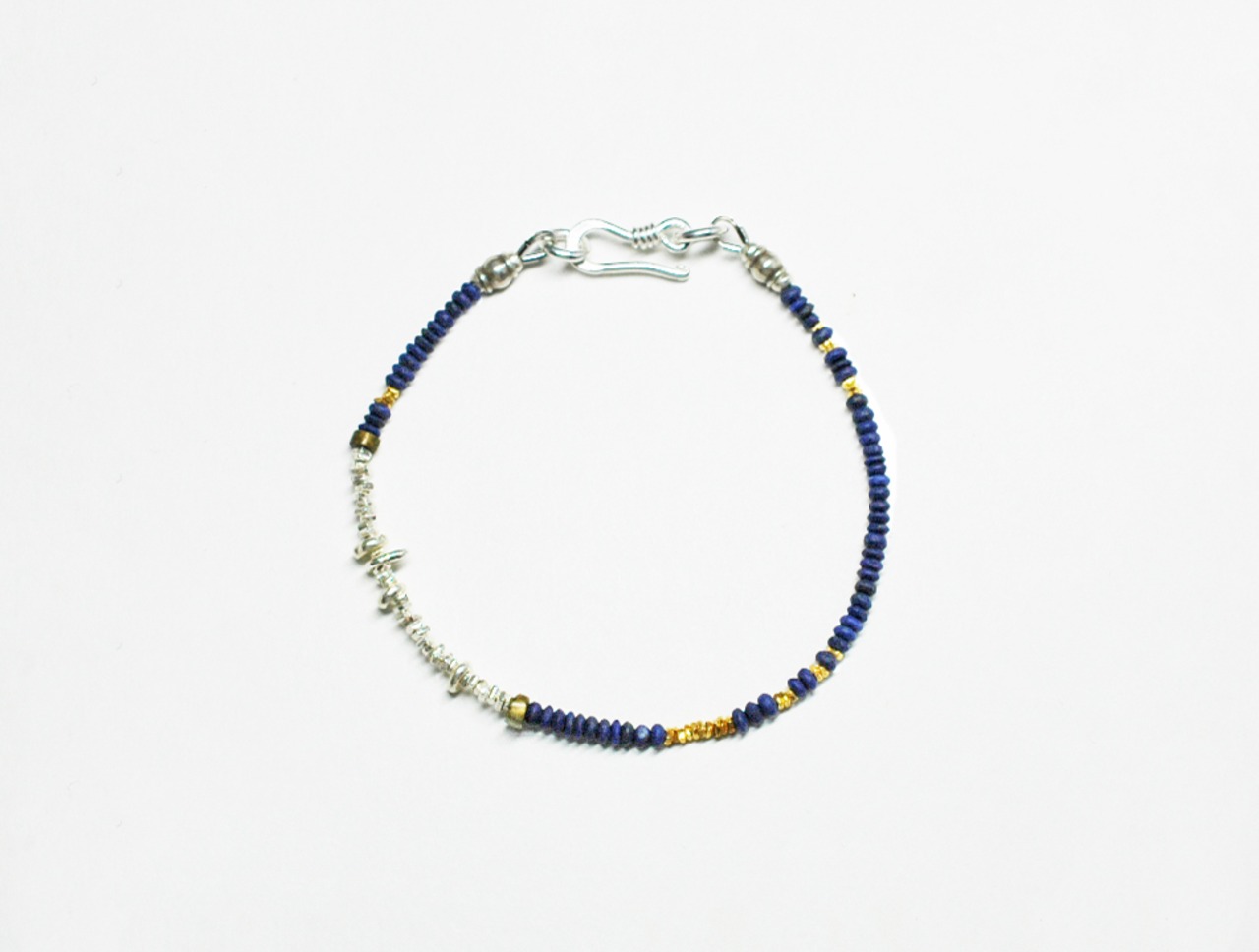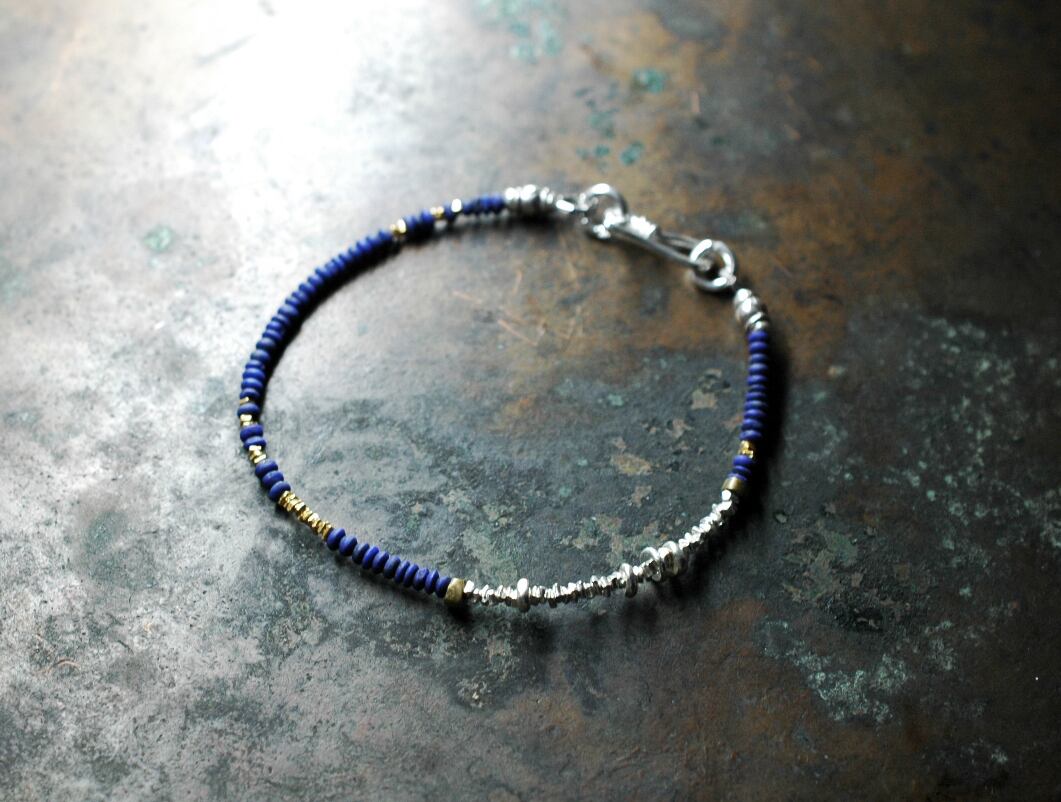 小さなラピスラズリと、さざれ型のカレンシルバービーズなどを繋げたブレスです。