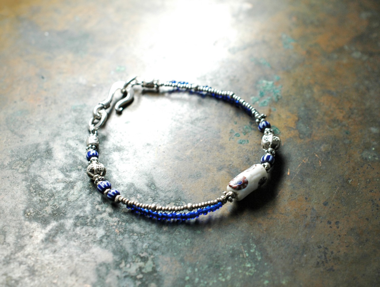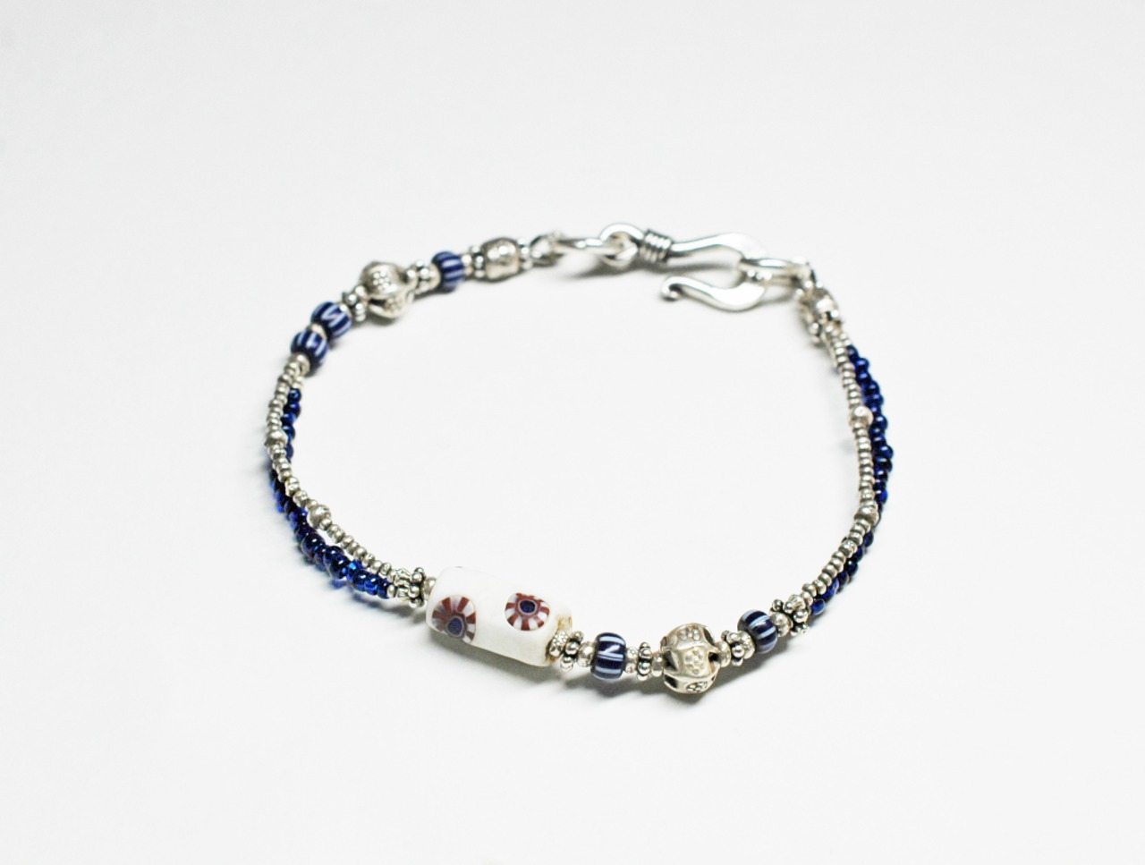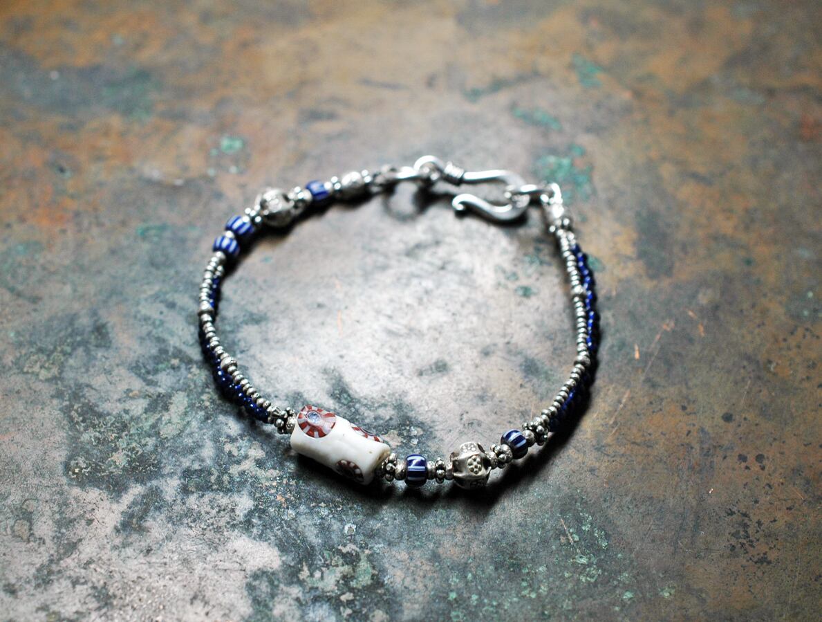 ホワイト&シルバー&ブルーの配色が爽やかですが、アンティークビーズの味わいもあるブレスです。