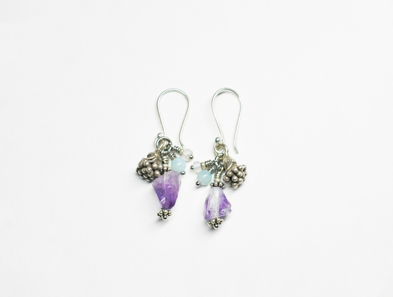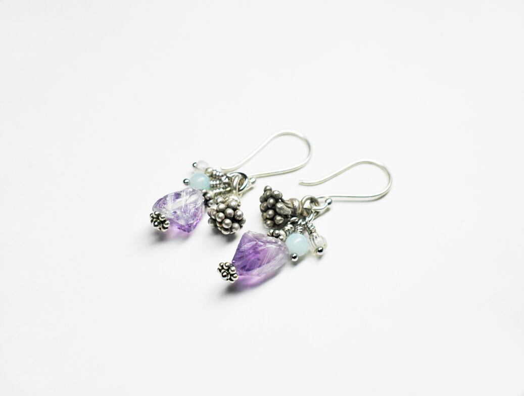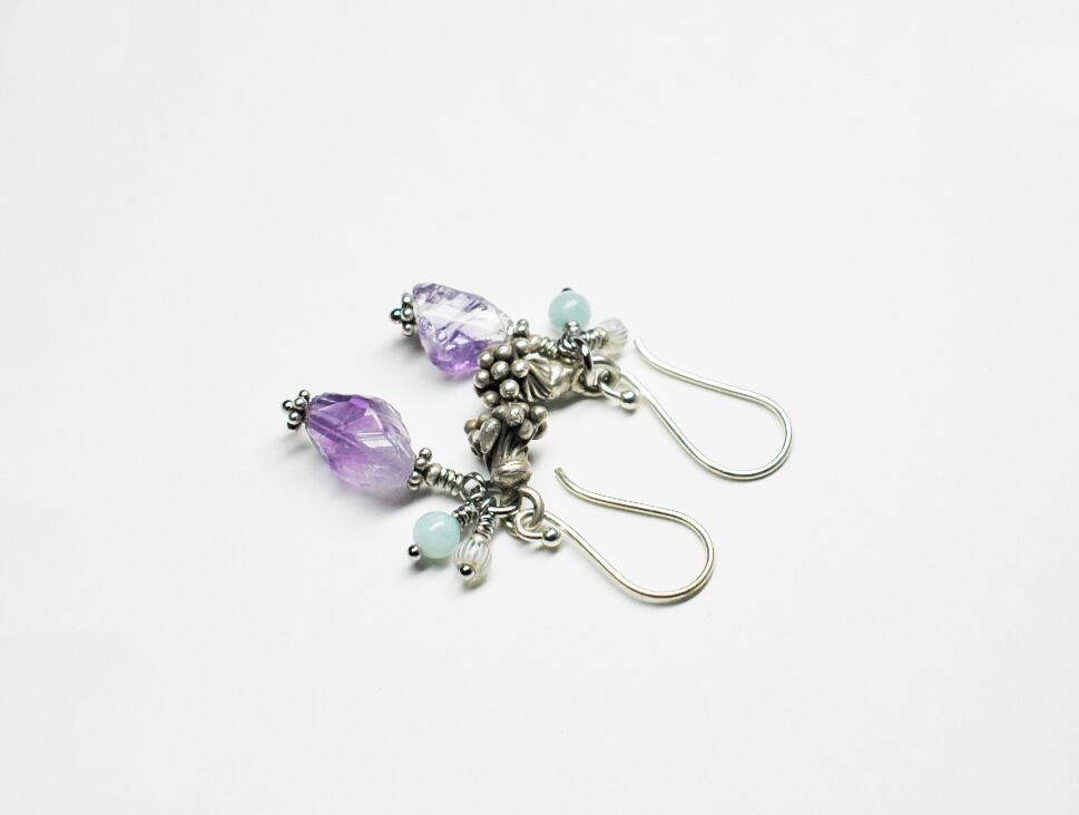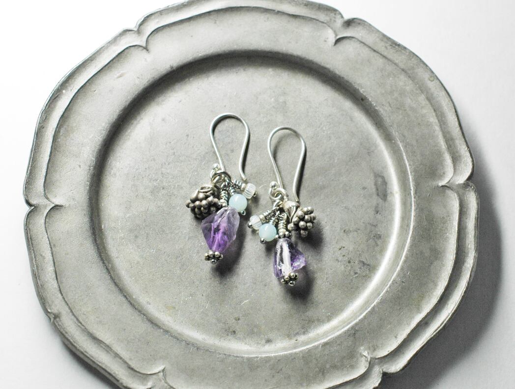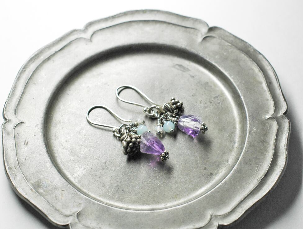 蕾のようなカレンシルバーと、アマゾナイト、アメジスト、アンティークビーズを繋いだピアスです。