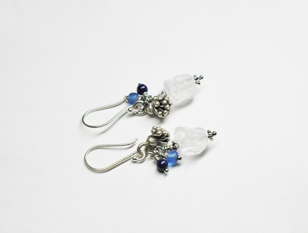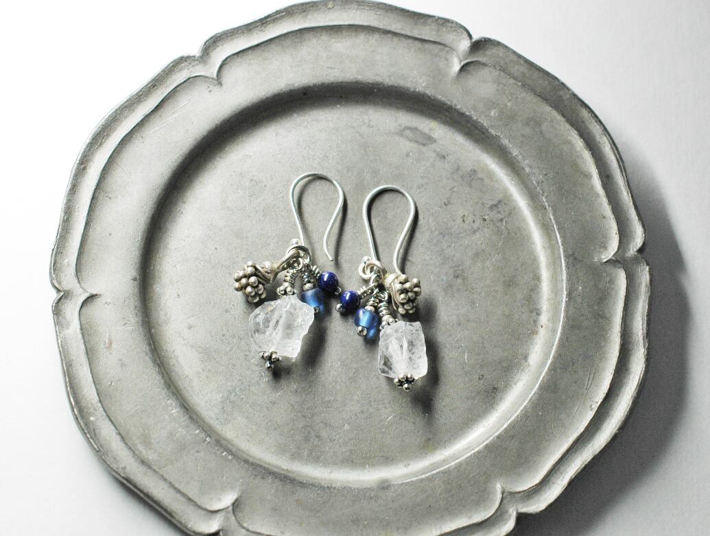 蕾のようなカレンシルバーと、ラフロック水晶、ラピスラズリ、アンティークビーズを繋いだピアスです。