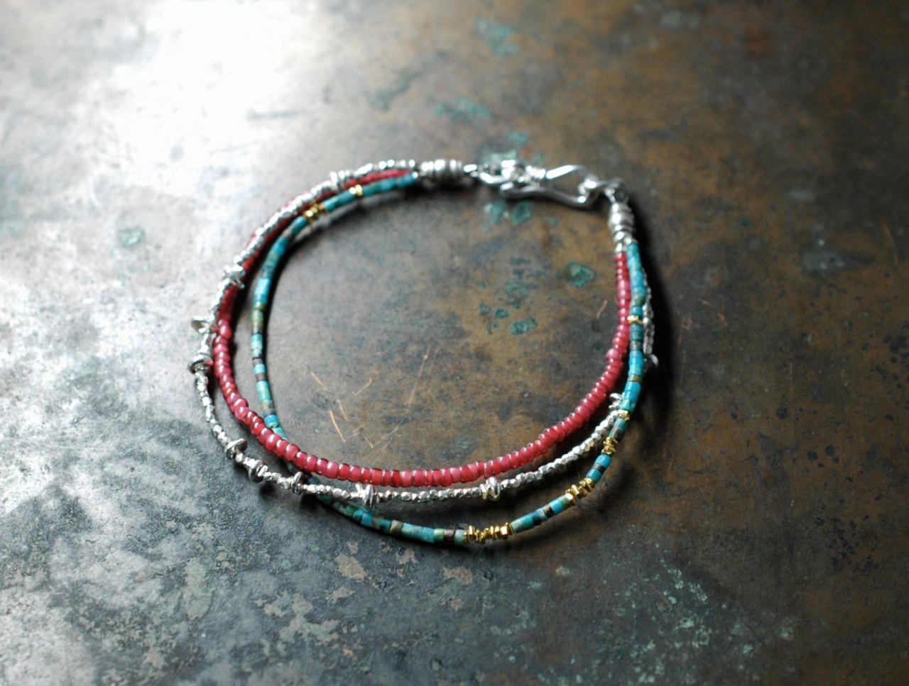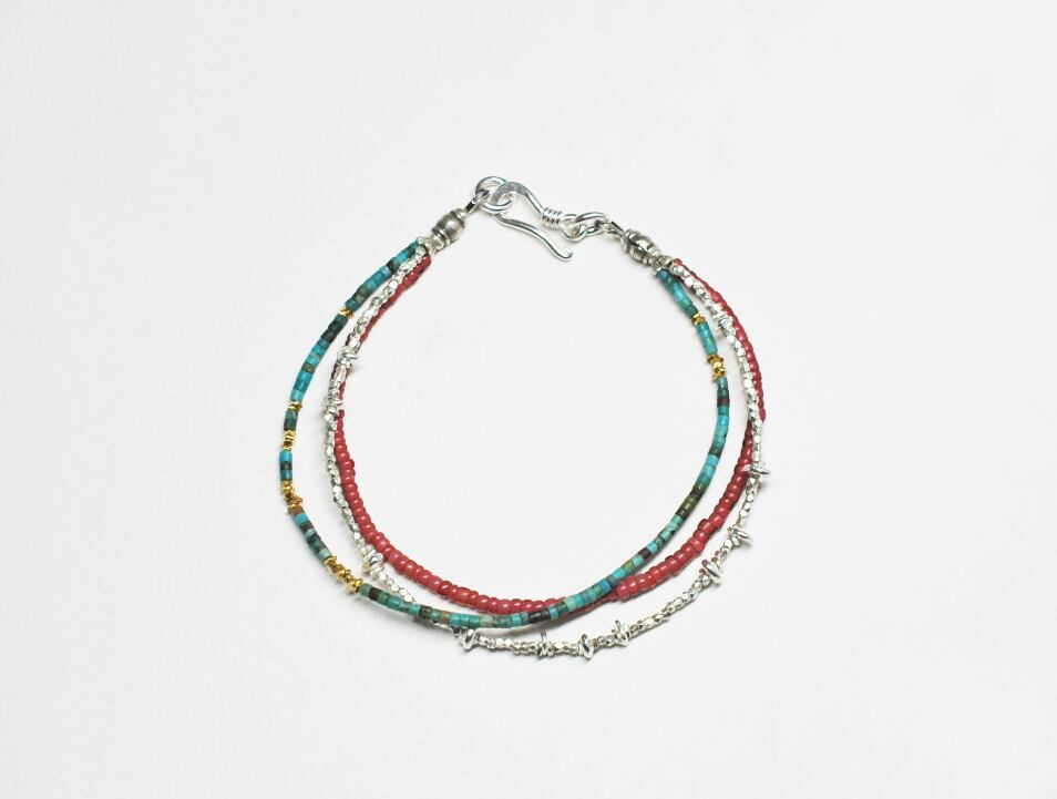 金赤ホワイトハーツ、小さなターコイズと煌めくカレンシルバーの3連ブレス