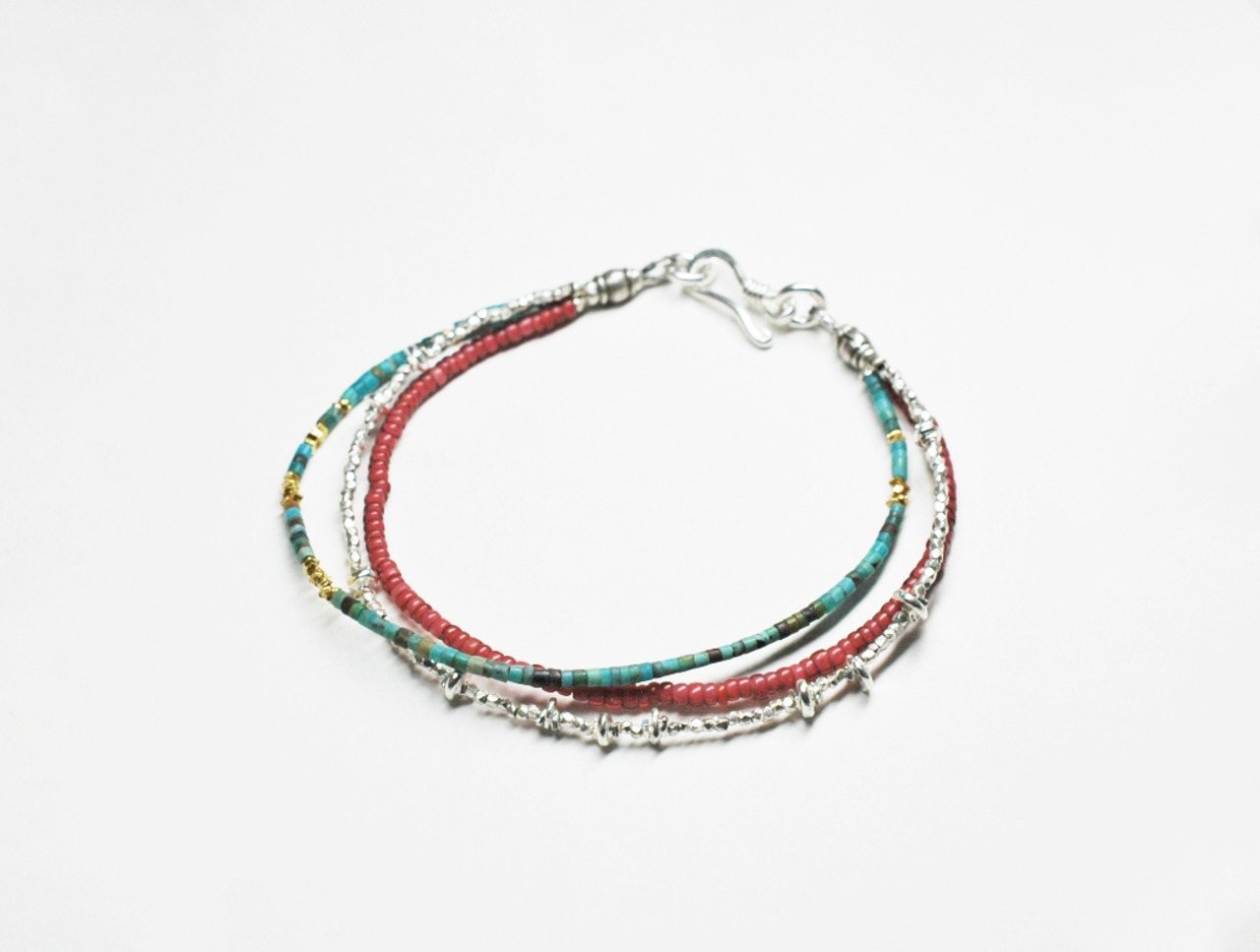 金赤のホワイトハーツと、とっても小さなターコイズと、カレンシルバービーズを繋げた3連のブレスです。