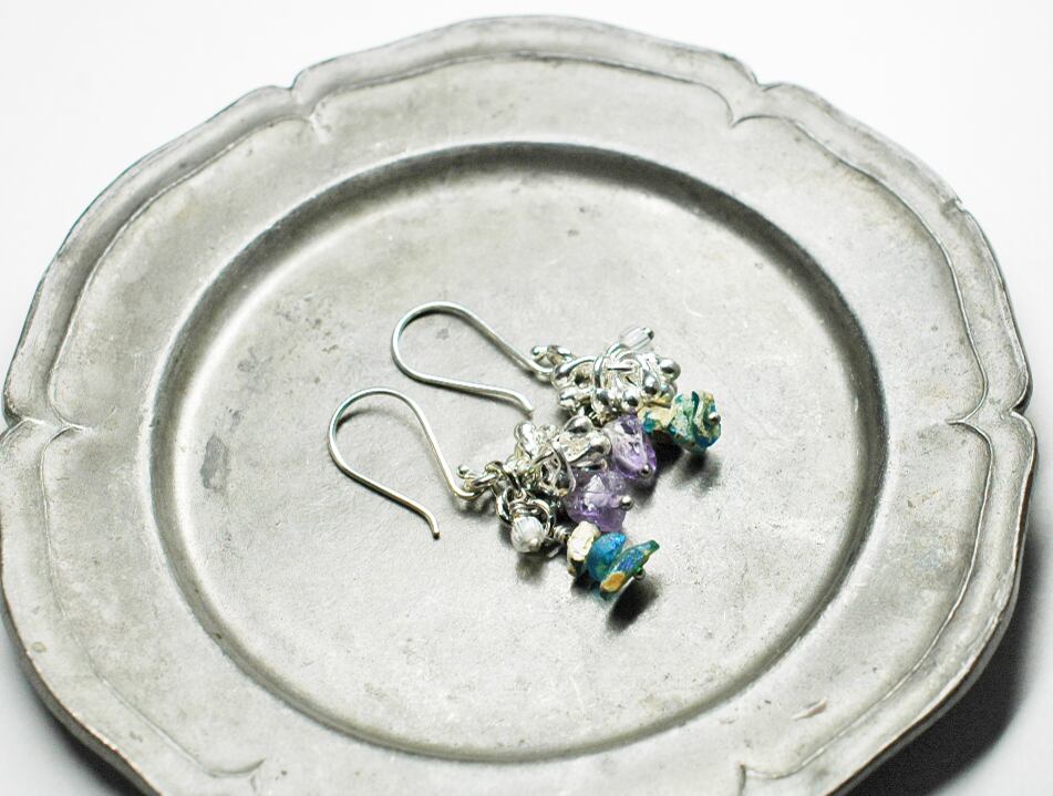 カレンシルバーチャームと、小さなローマングラス、アメジスト、グーズベリーを繋いだピアスです。
