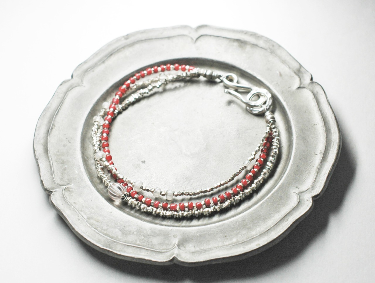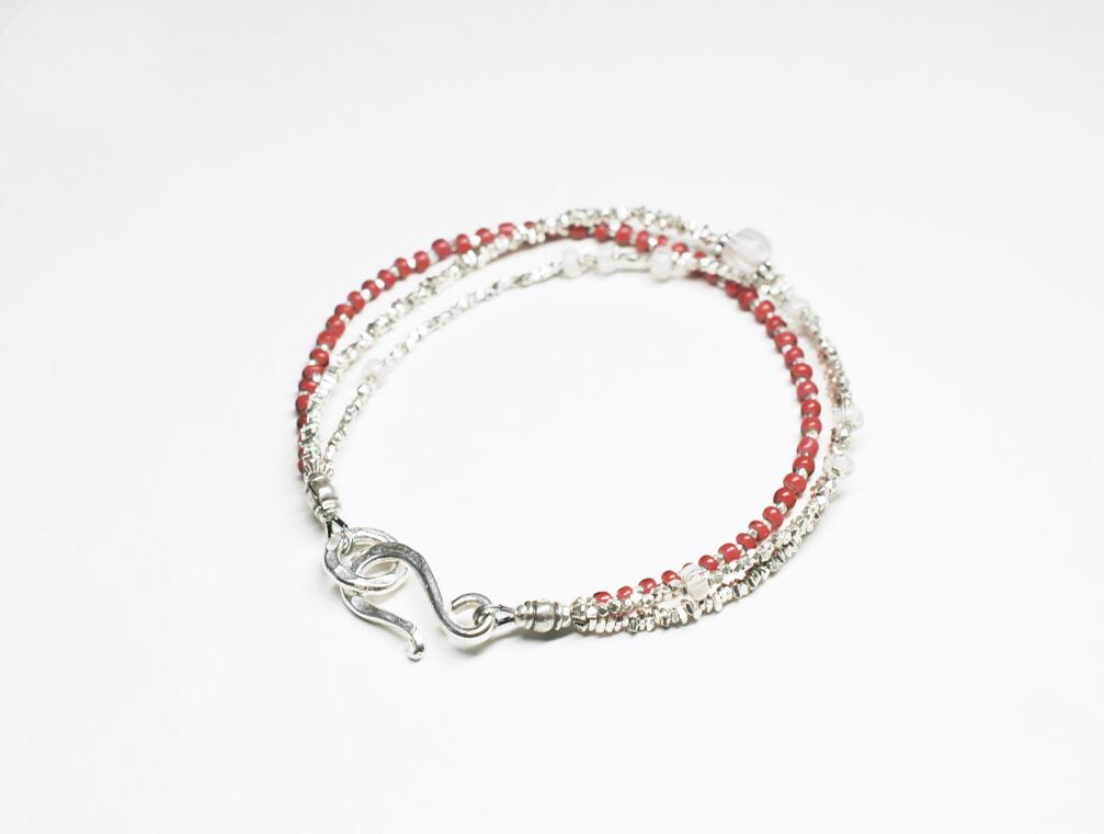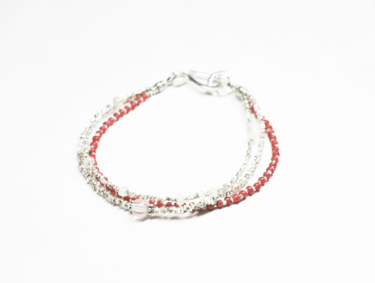 グーズベリーと金赤ホワイトハーツ、煌めくカレンシルバーの3連ブレス