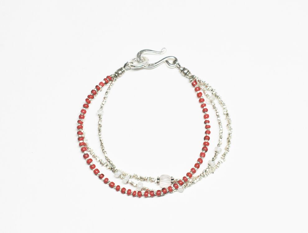 金赤のホワイトハーツと、カレンシルバービーズ、グーズベリーを繋げた3連のブレスです。