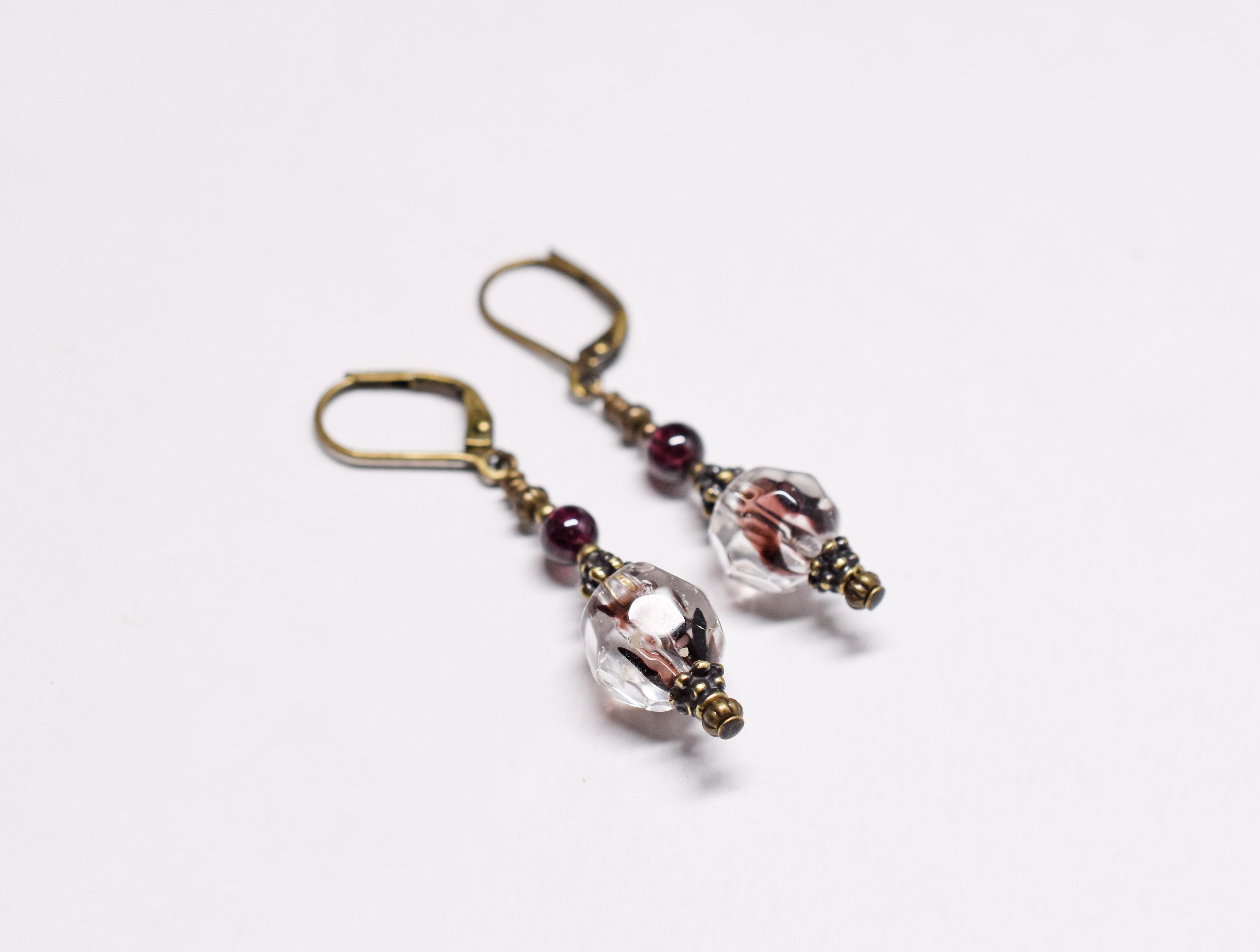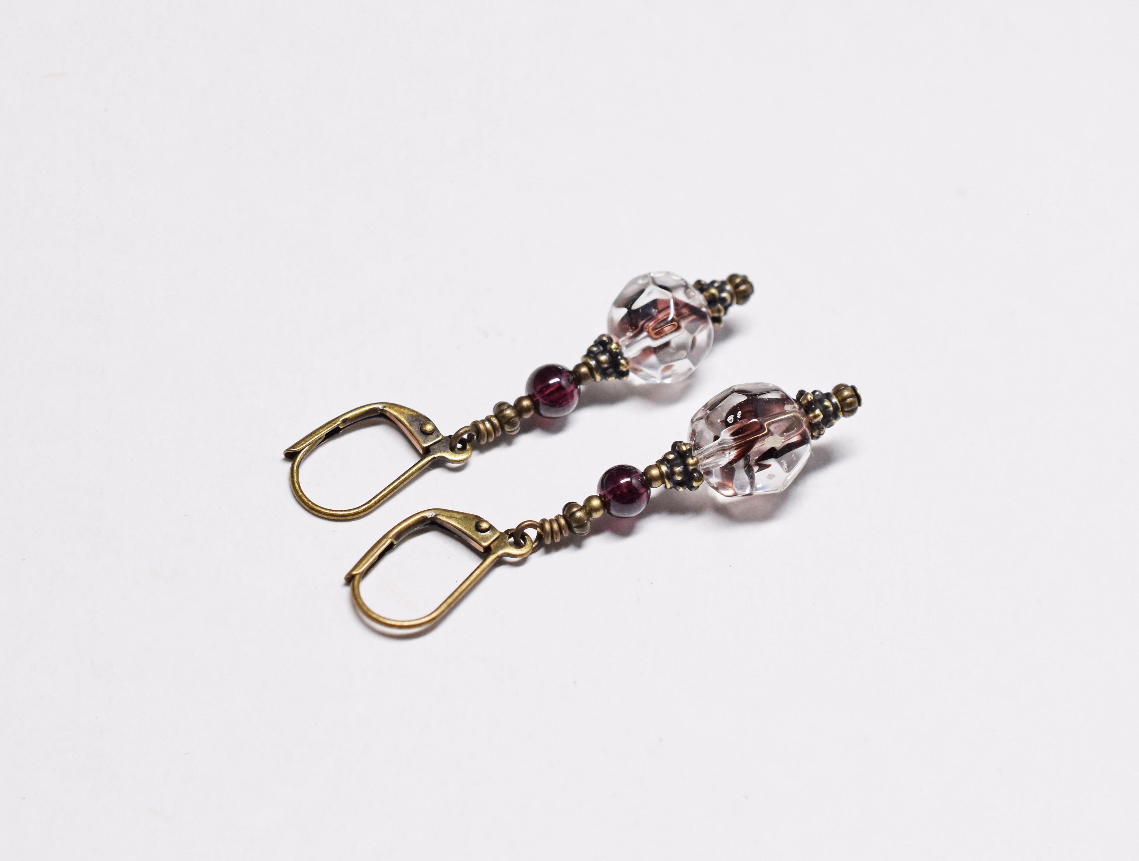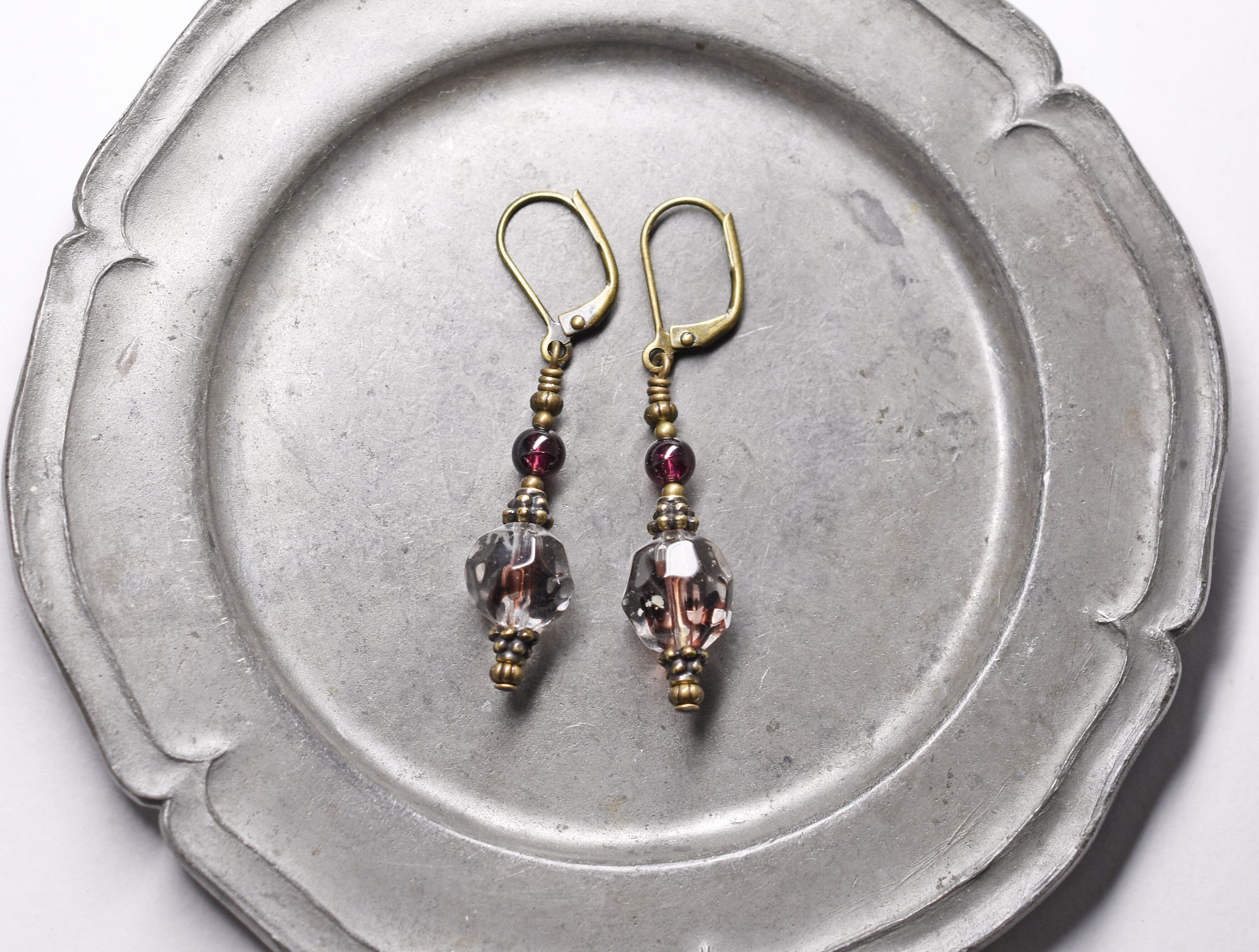 多面体のボヘミアビーズのカレンシルバービーズ、丸いガーネットを繋いだピアスです。
