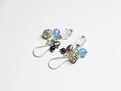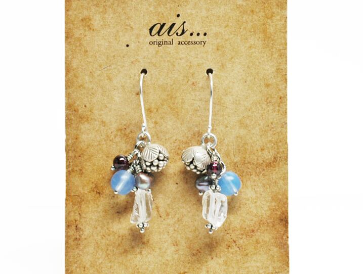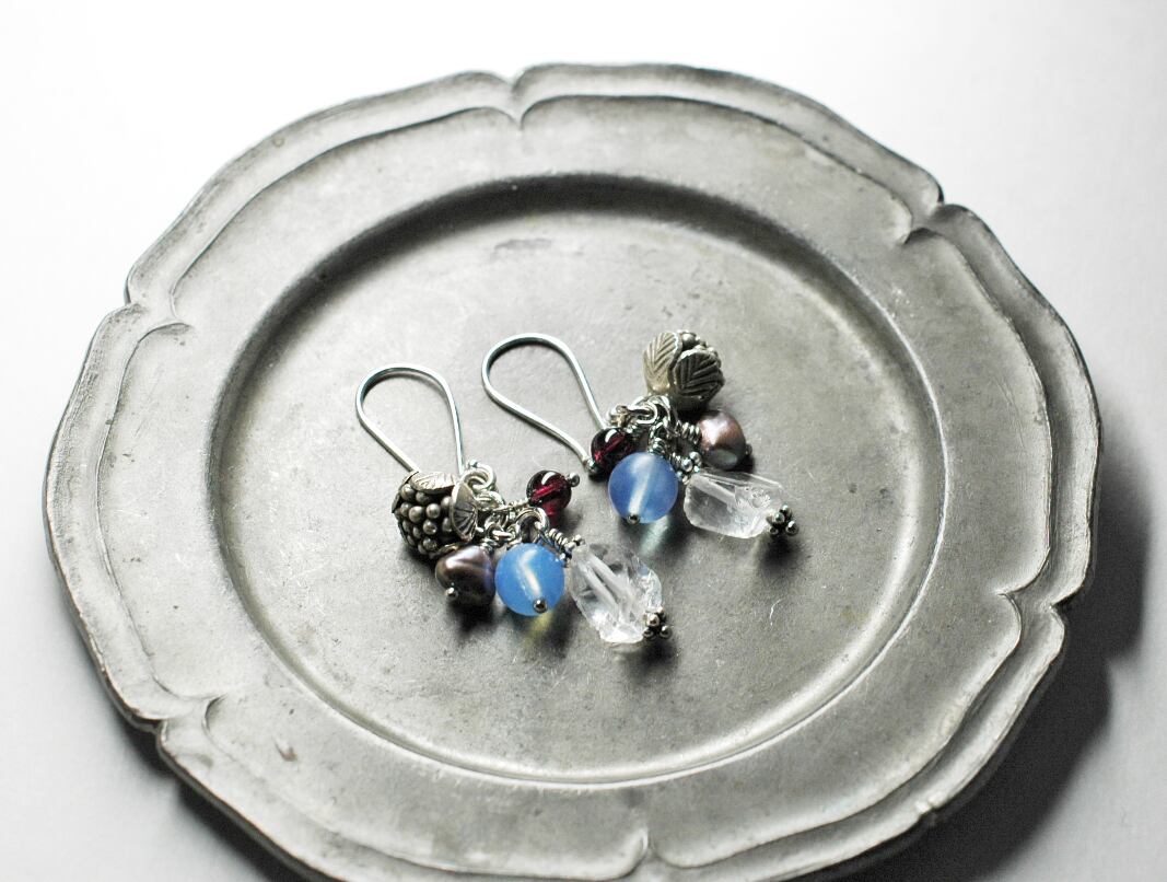 コロンと丸いカレンシルバーと、ラフロック水晶、ガーネット、バロックパール、アンティークビーズを繋いだピアスです。