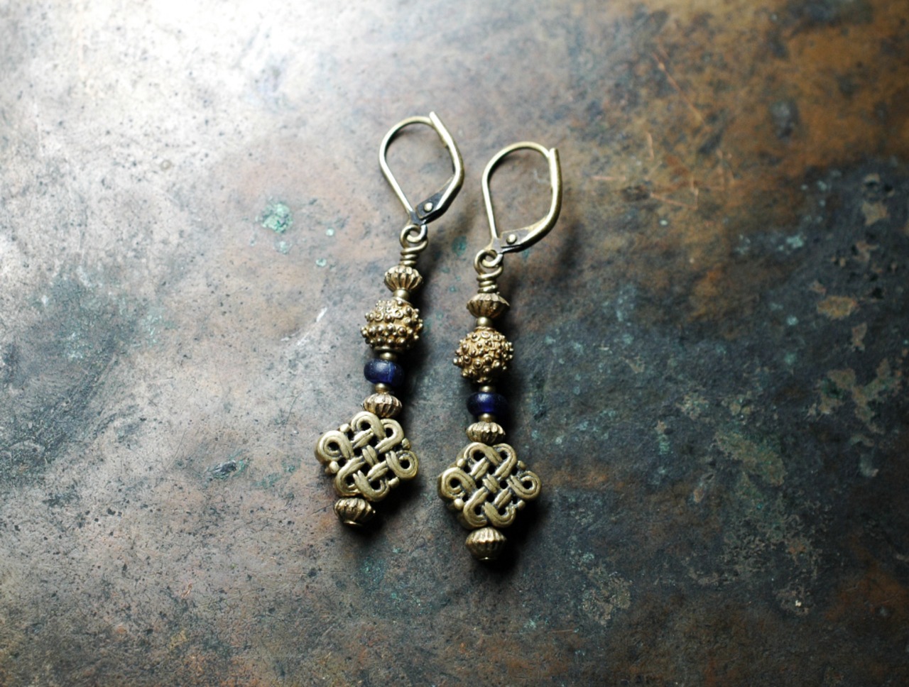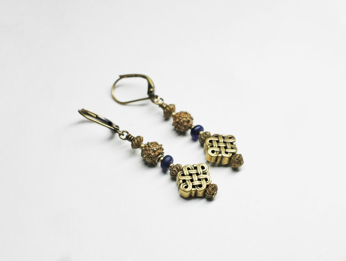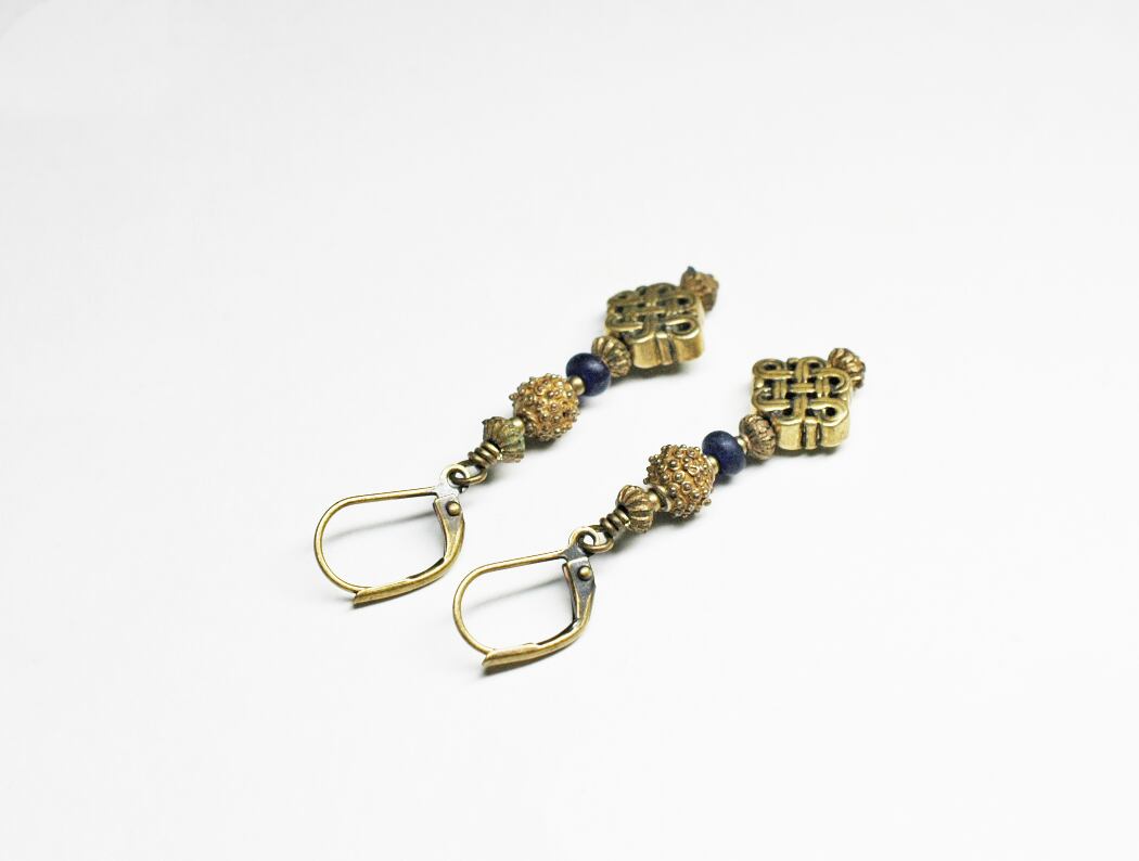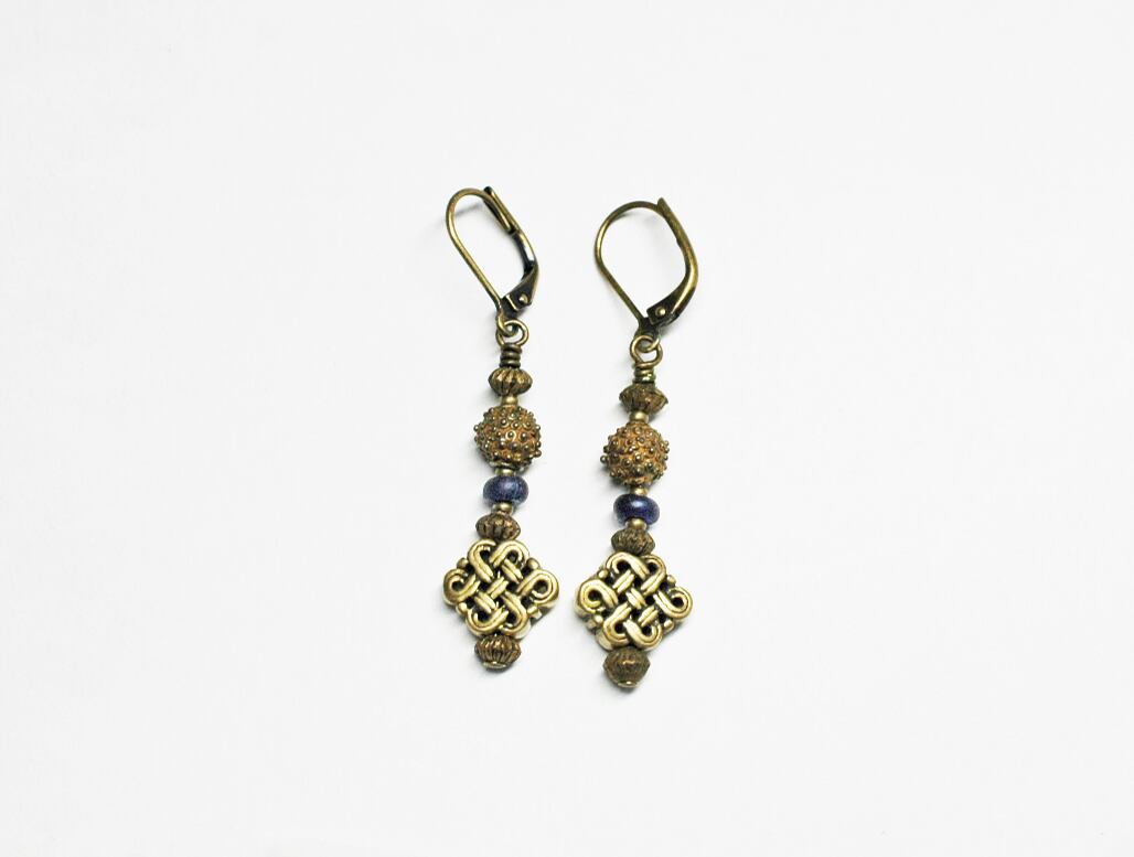 真鍮製のエンドレスノットと、ツブツブのoldビーズ、ブルーのアンティークビーズを繋いだピアスです。