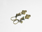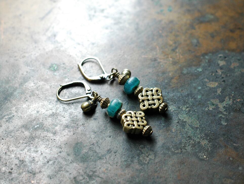 真鍮製のエンドレスノットと、出土ビーズ、民族の小さな鈴を繋いだピアスです。