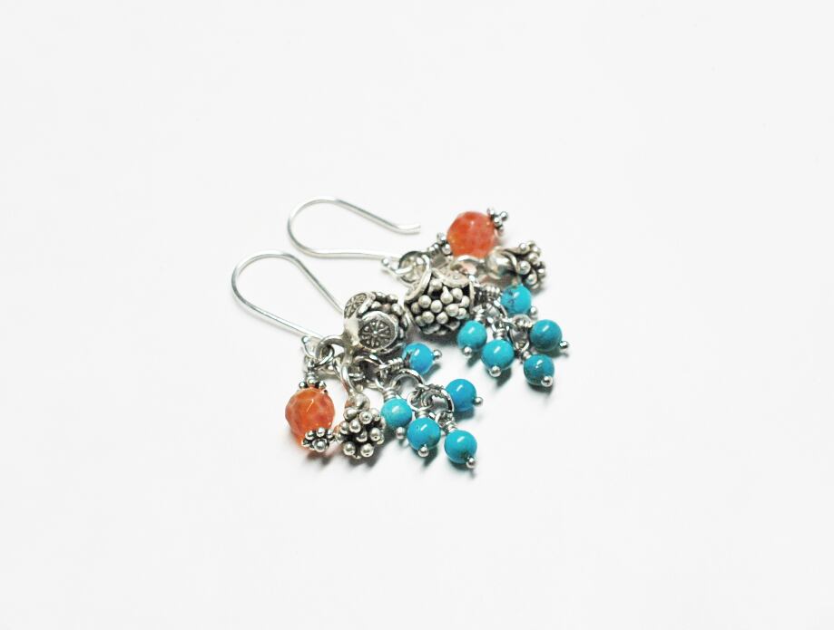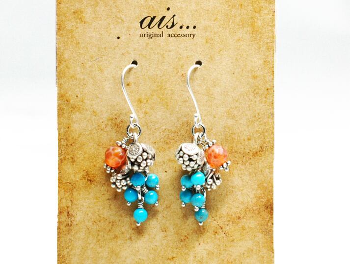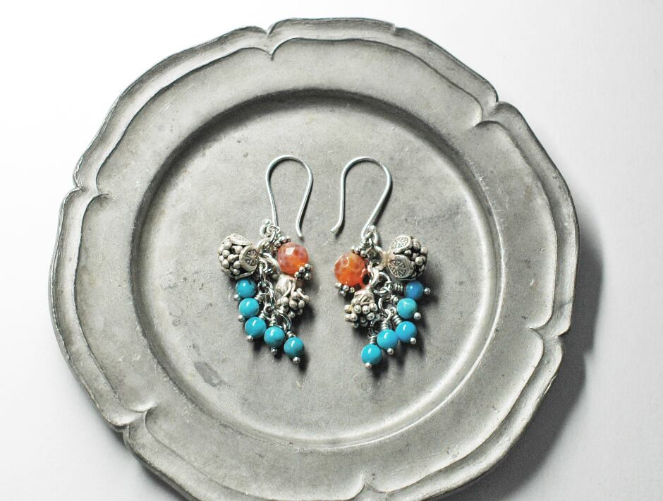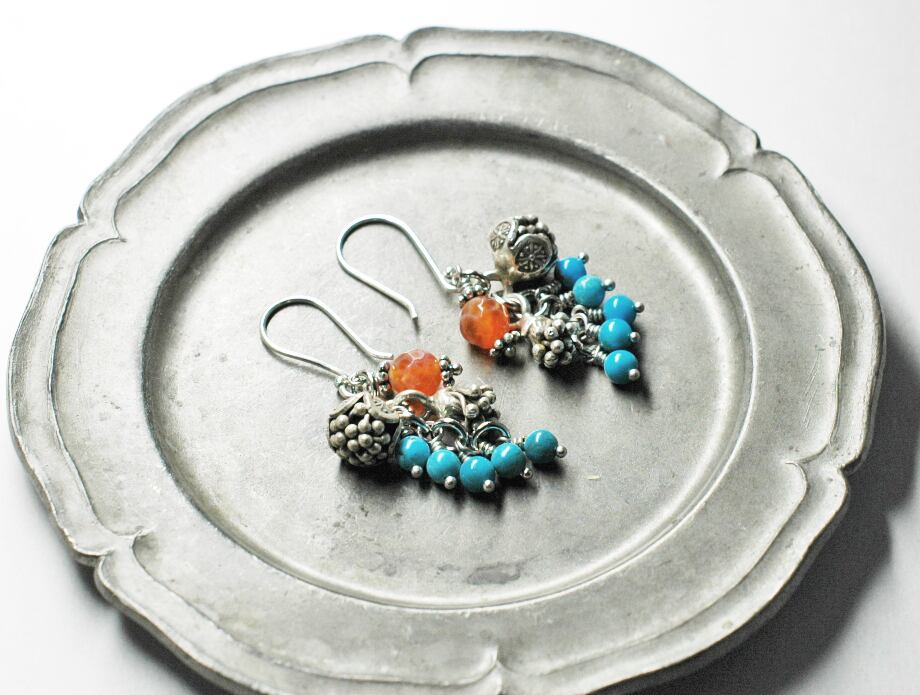 丸いお花とたわわなカレンシルバーと、ターコイズ、ファイアーアゲートを繋いだピアスです。