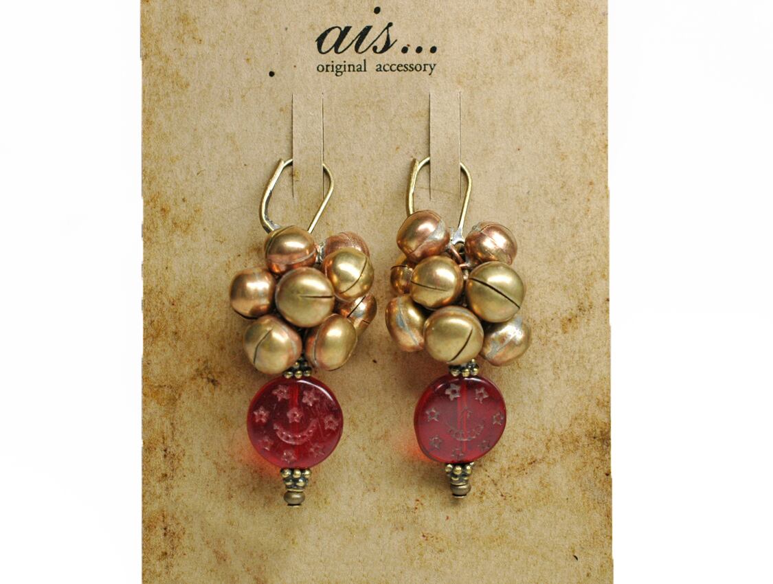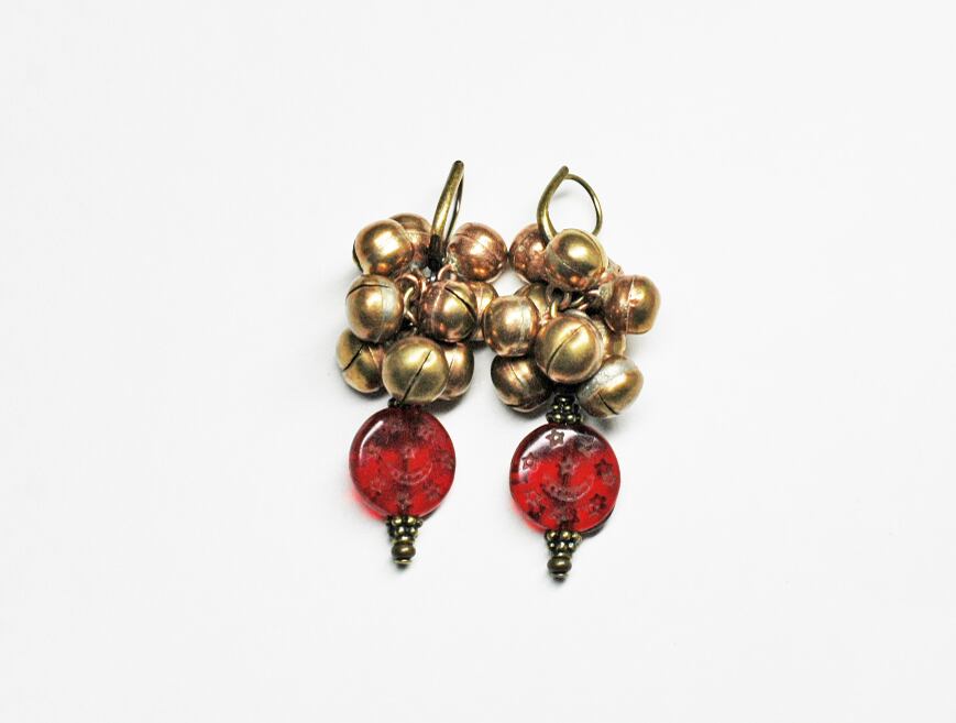 チェコ産のアンティークビーズに、鈴がたわわに実ったピアスです。