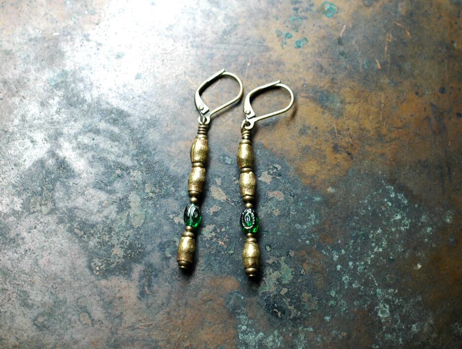 アフリカから届いたブラスビーズと、アンティークのボヘミアビーズを繋げたピアスです。