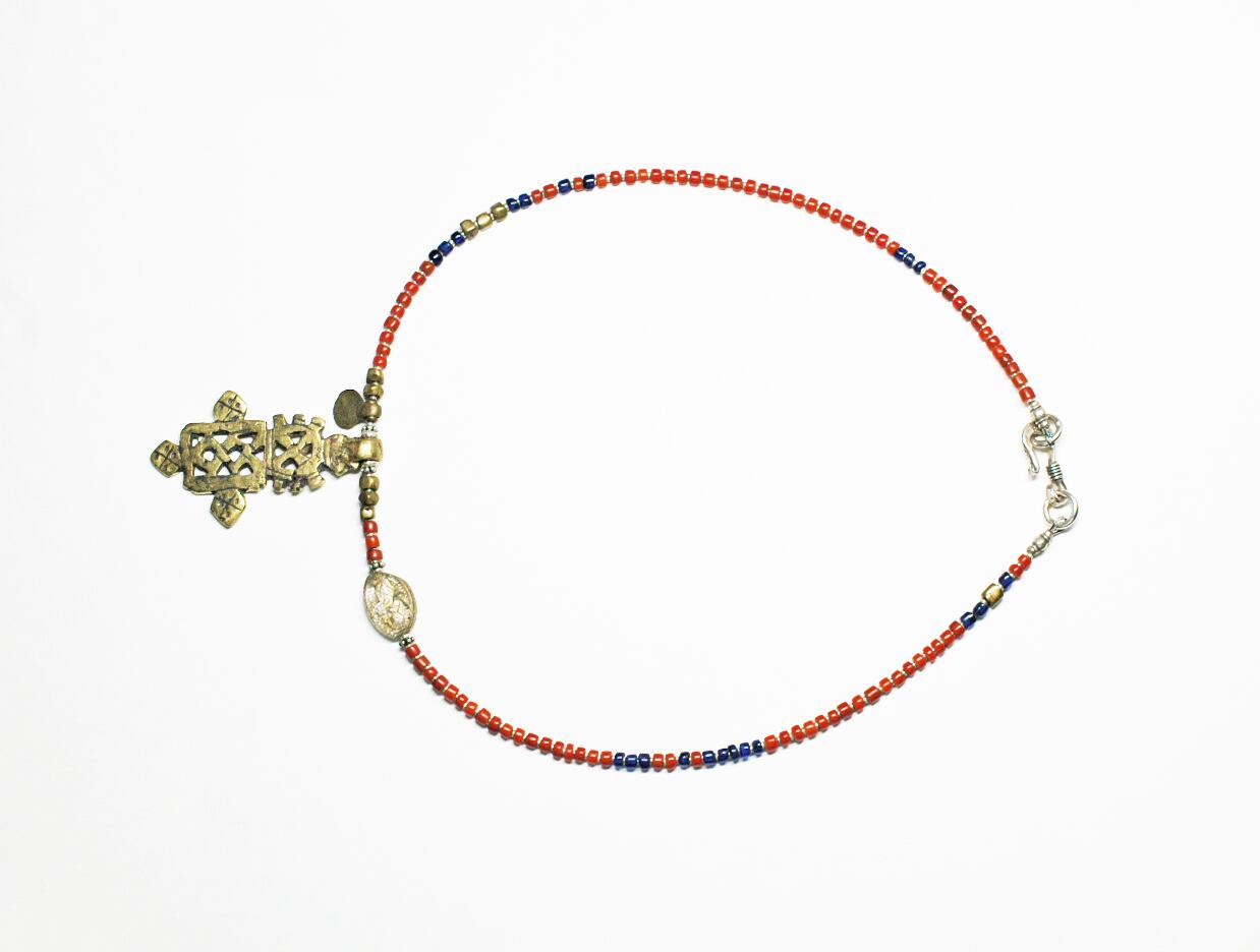 ブラス製のエチオピアンクロス、ロザリオパーツ、ホワイトハーツなどで繋いだネックレスです。