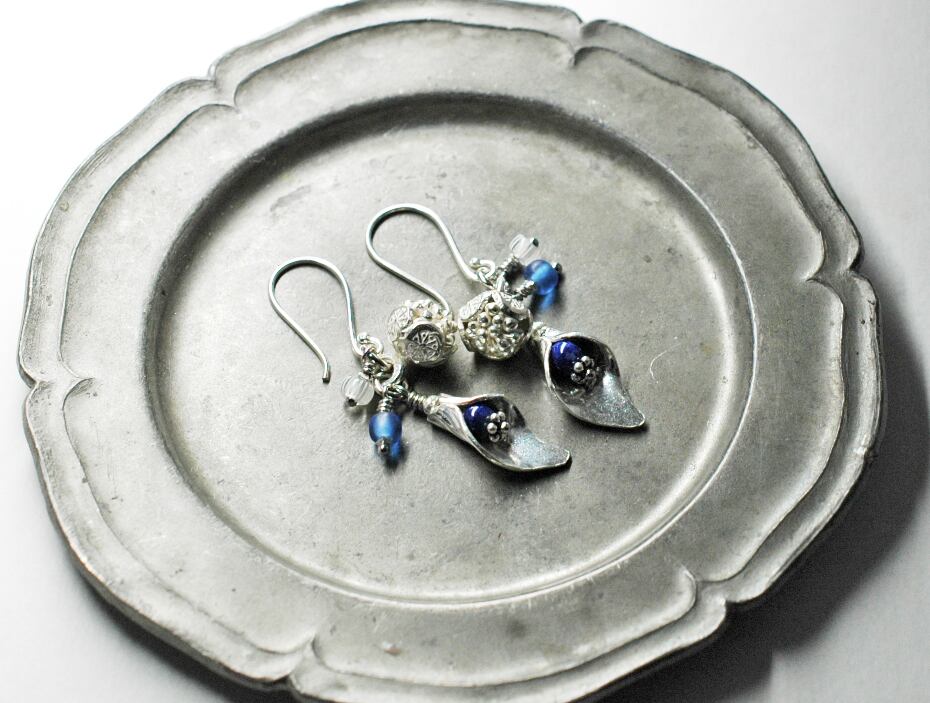 ラピスを入れたボタニカルカレンシルバーと、アンティークビーズのピアス