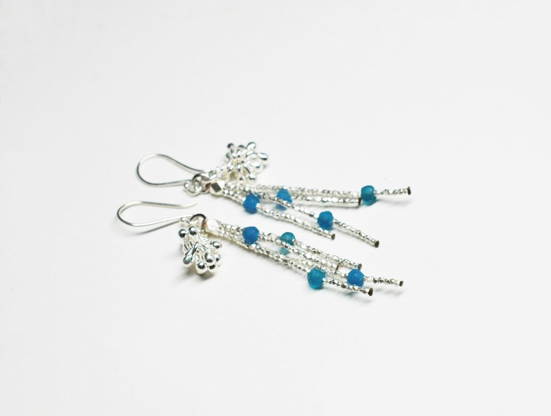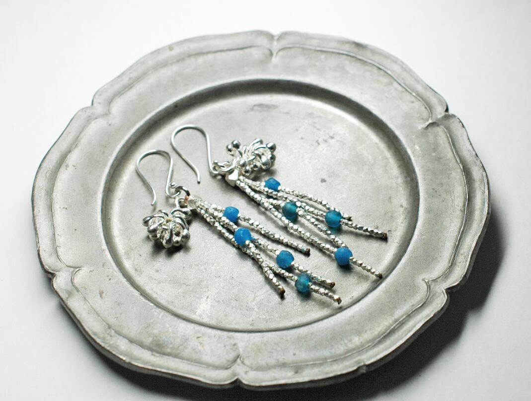 しゃらりととしたカレンシルバーチャームと、小さなカレンシルバービーズと、丸いローマングラスを繋げた4連のピアスです。