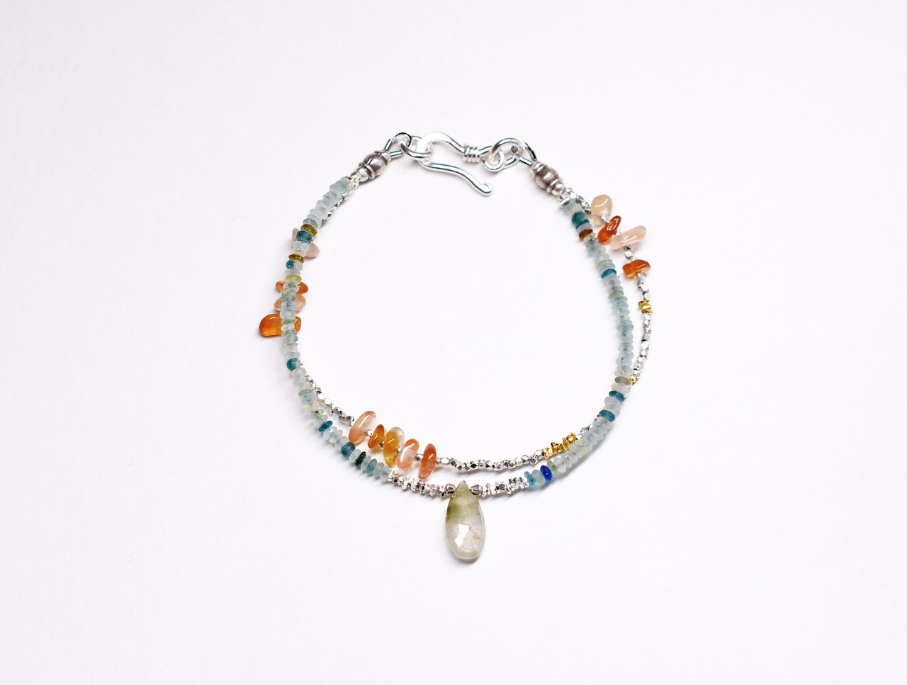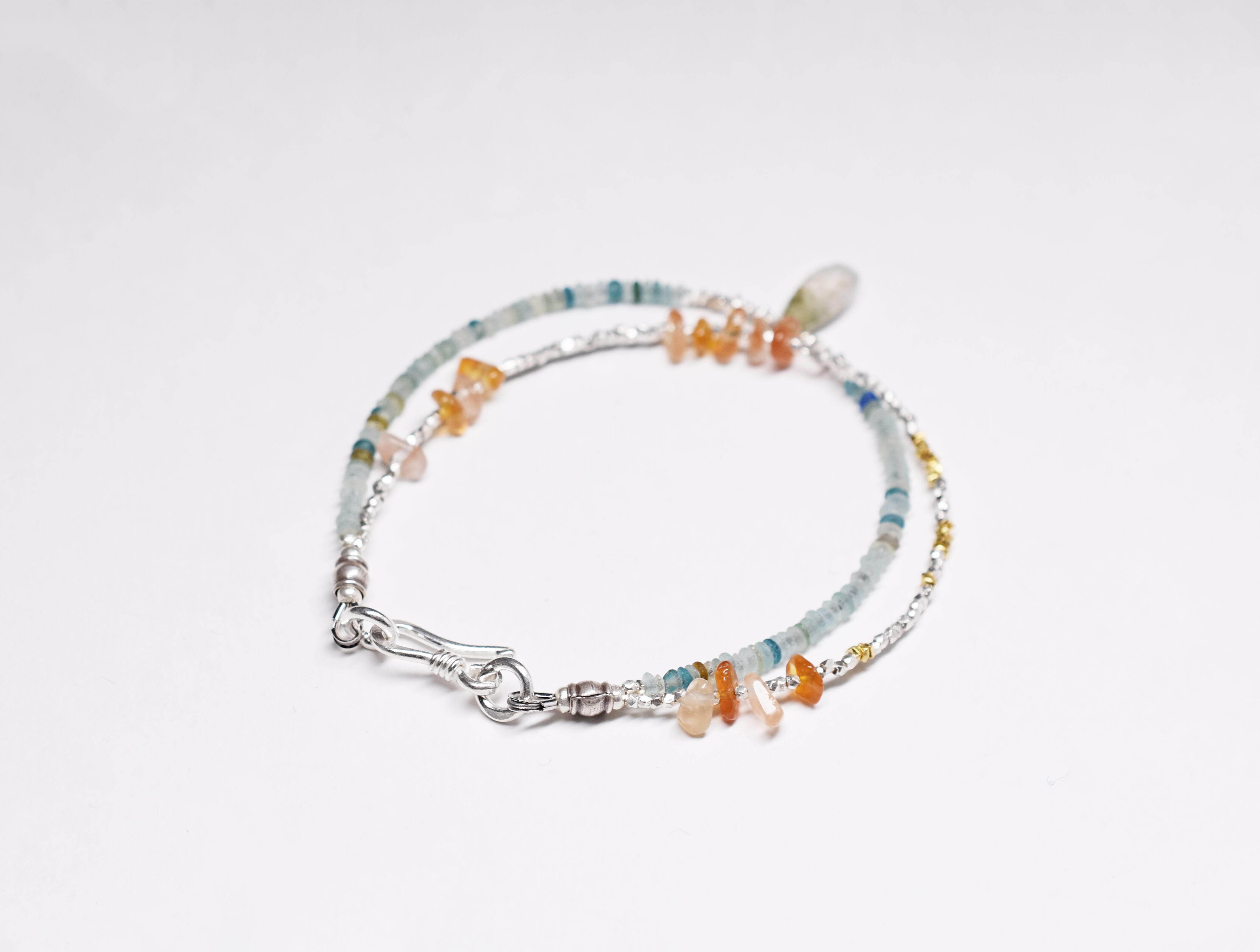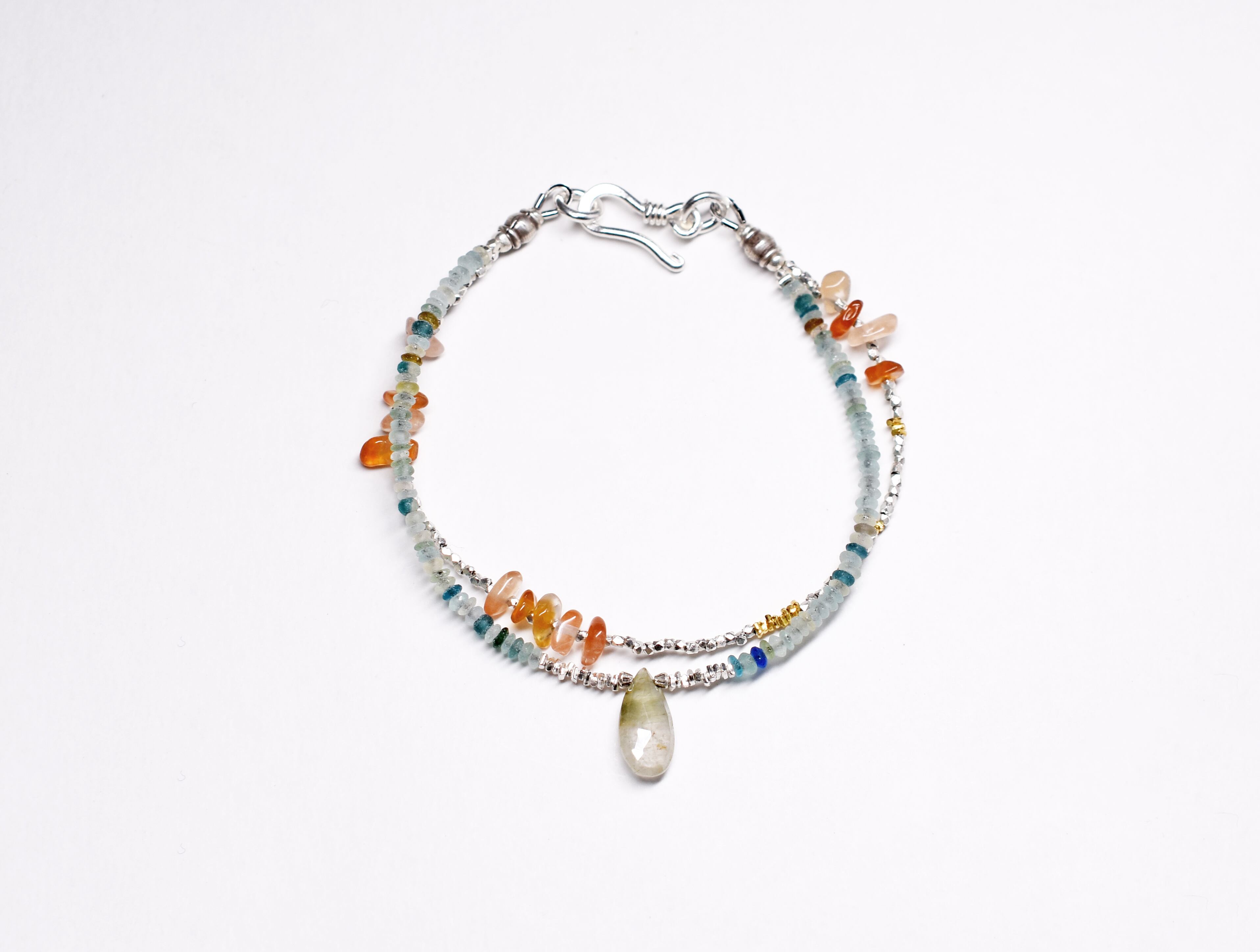 小さなローマングラスと内包物水晶、カレンシルバーとカーネリアンの2連ブレス