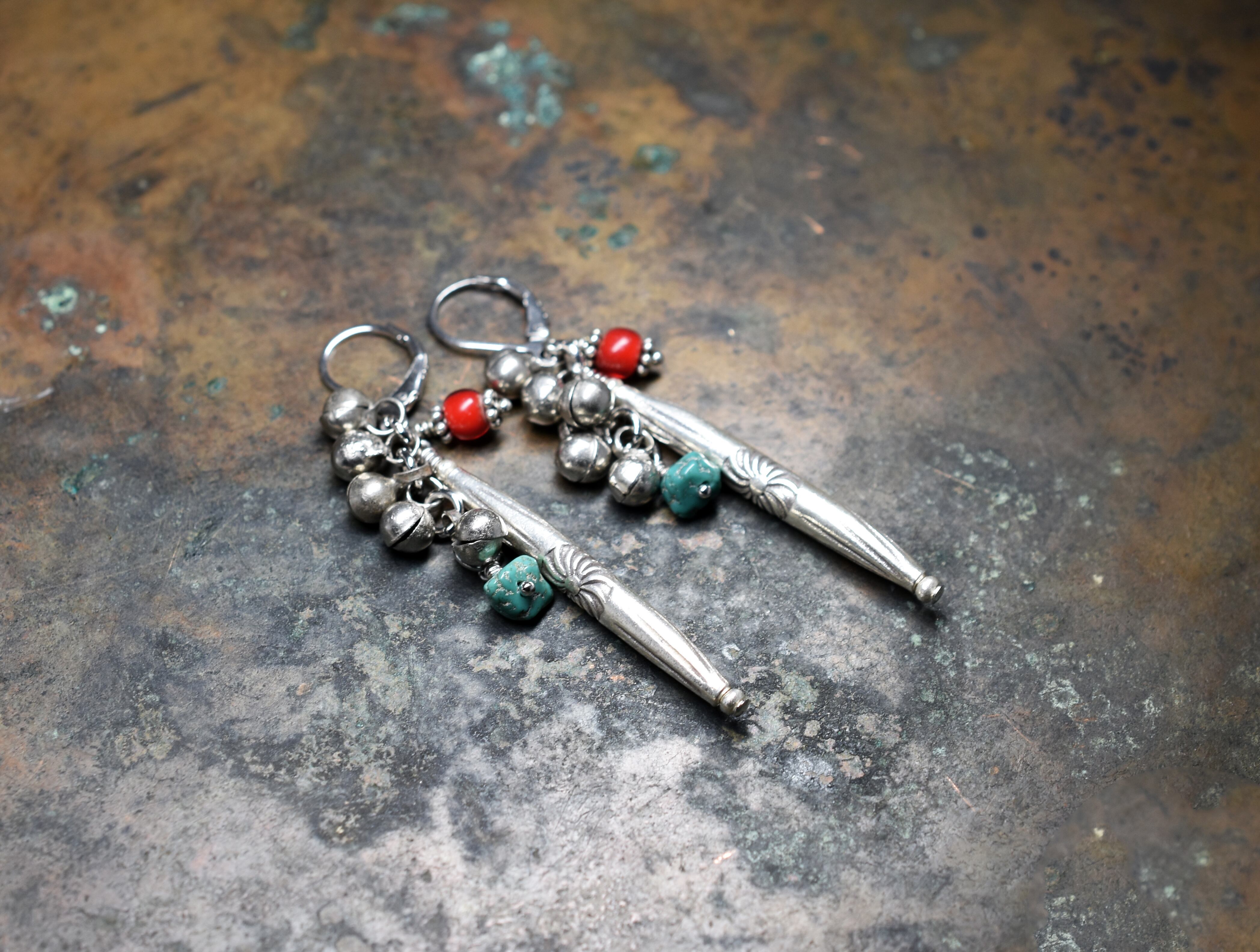 すらりとしたカレンシルバーと民族鈴、ターコイズとアンティークビーズのピアス