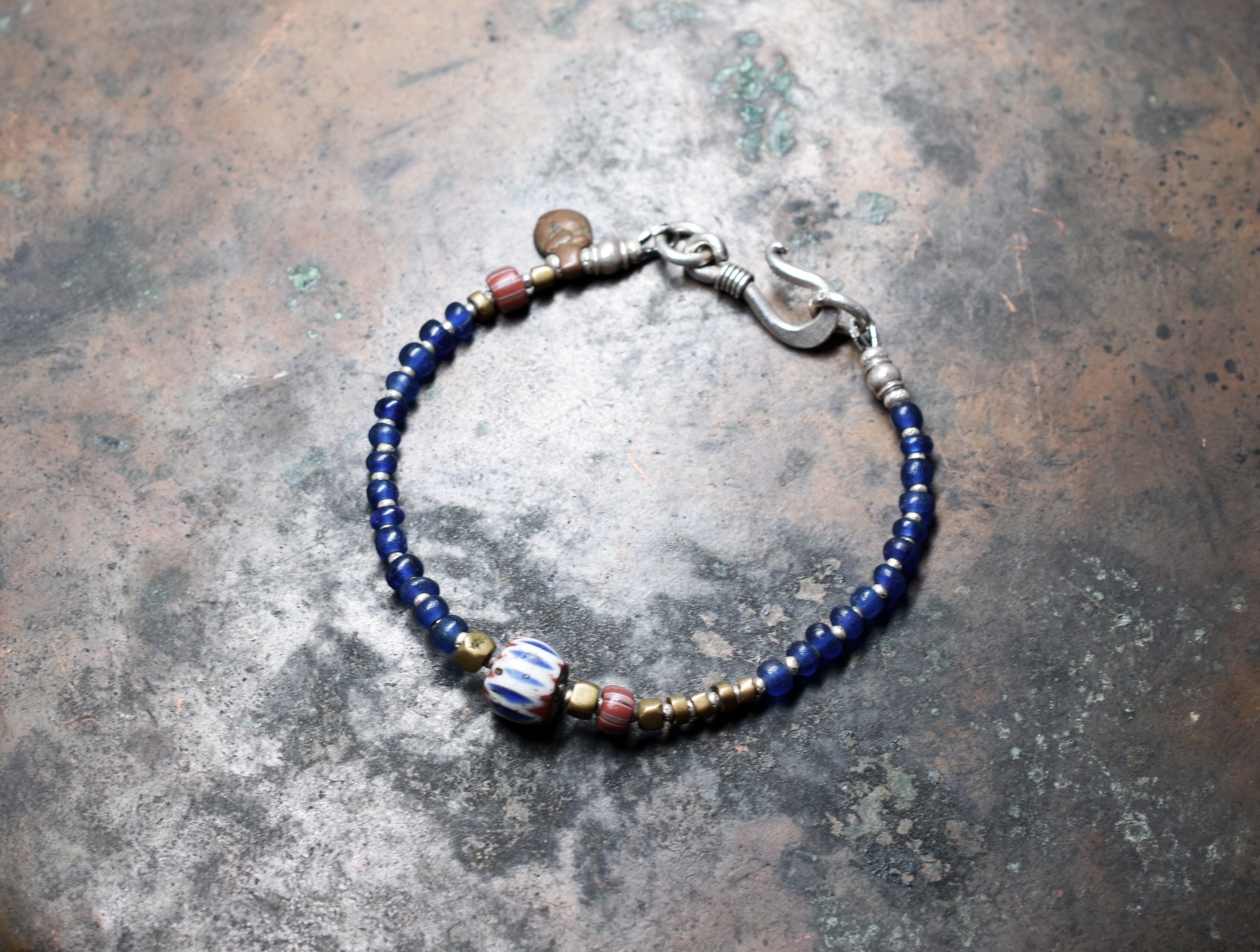 シェブロンと呼ばれる、ベネチアのアンティークビーズと、oldオリッサブラス、ブルーのアンティークビーズなどで繋いだブレスです。