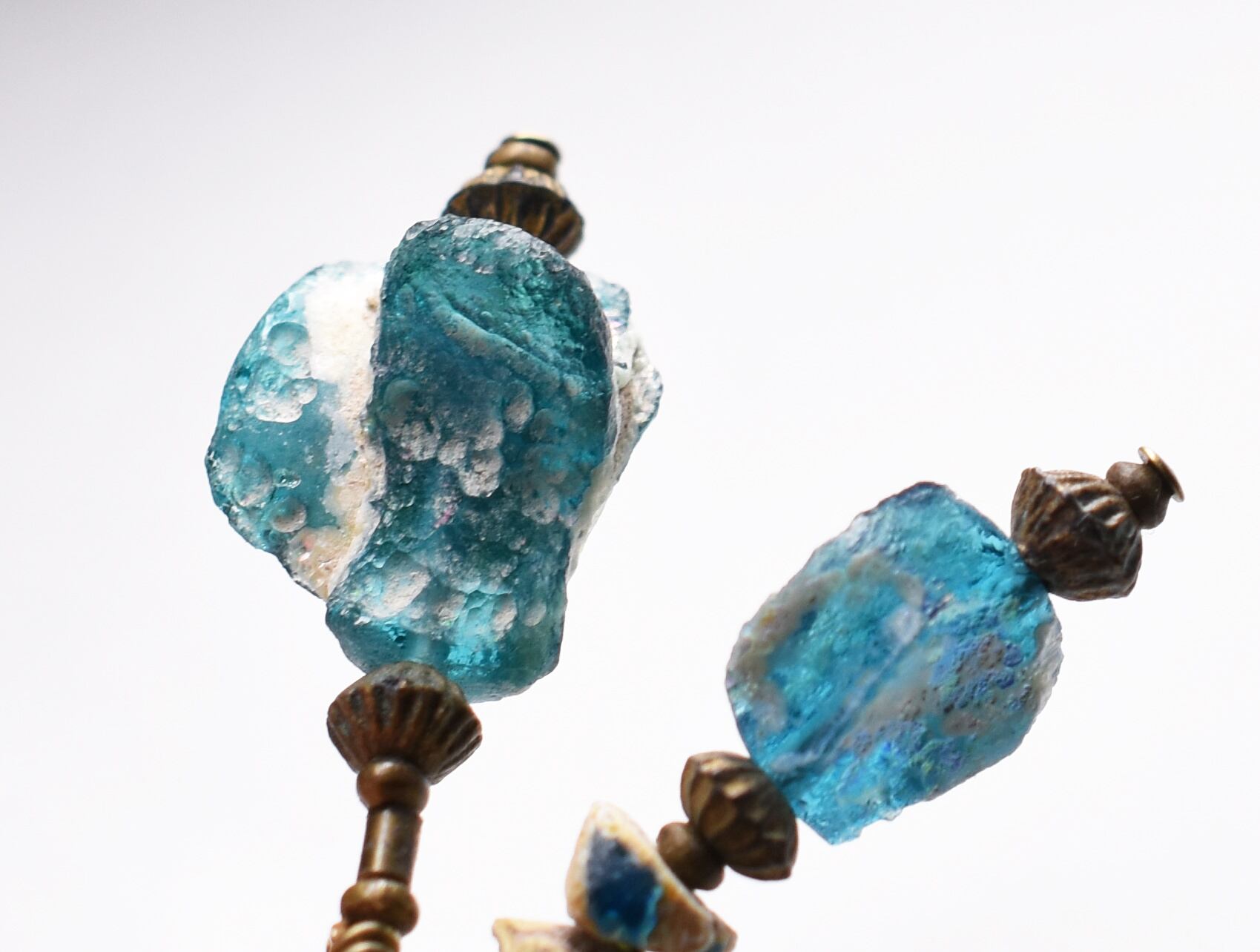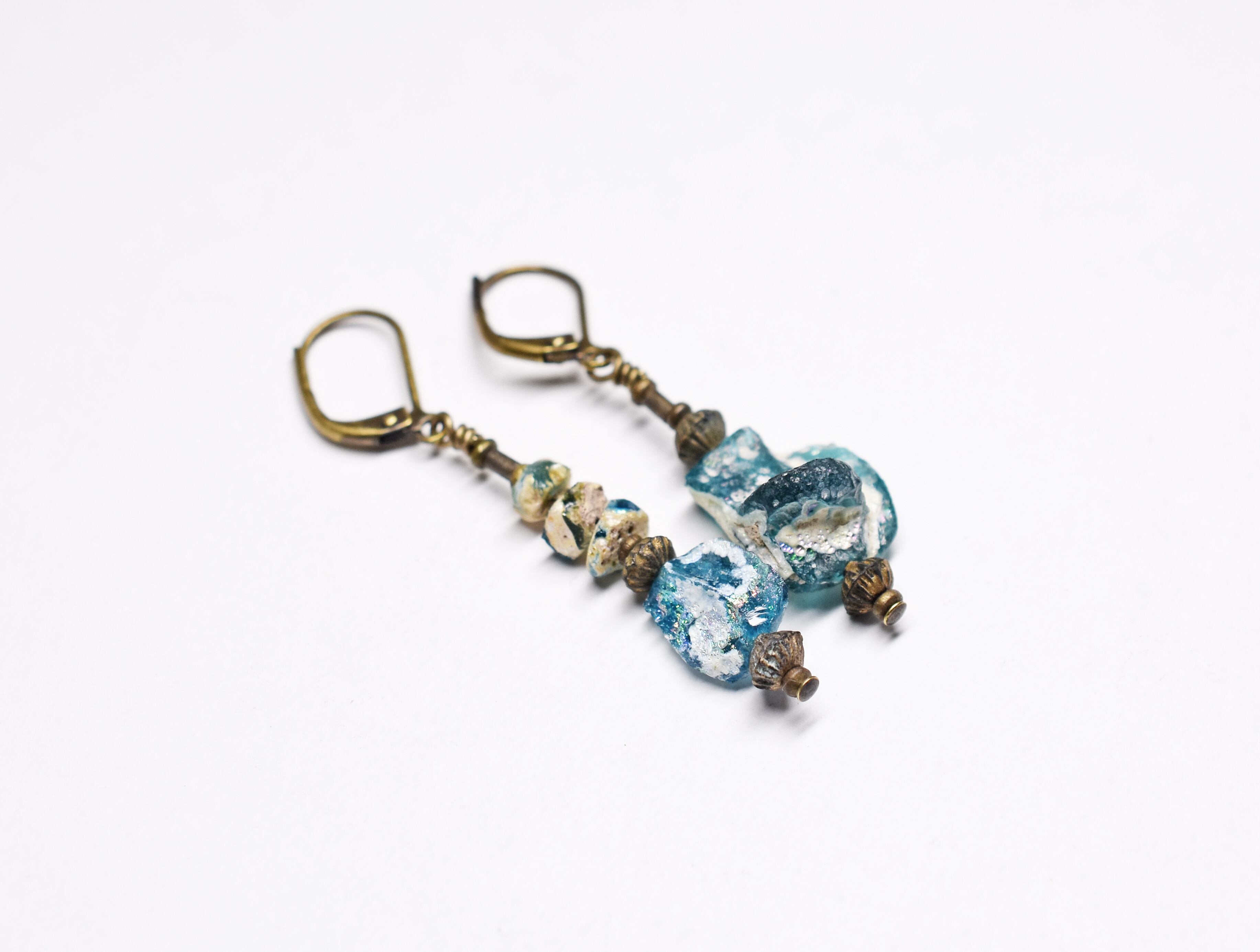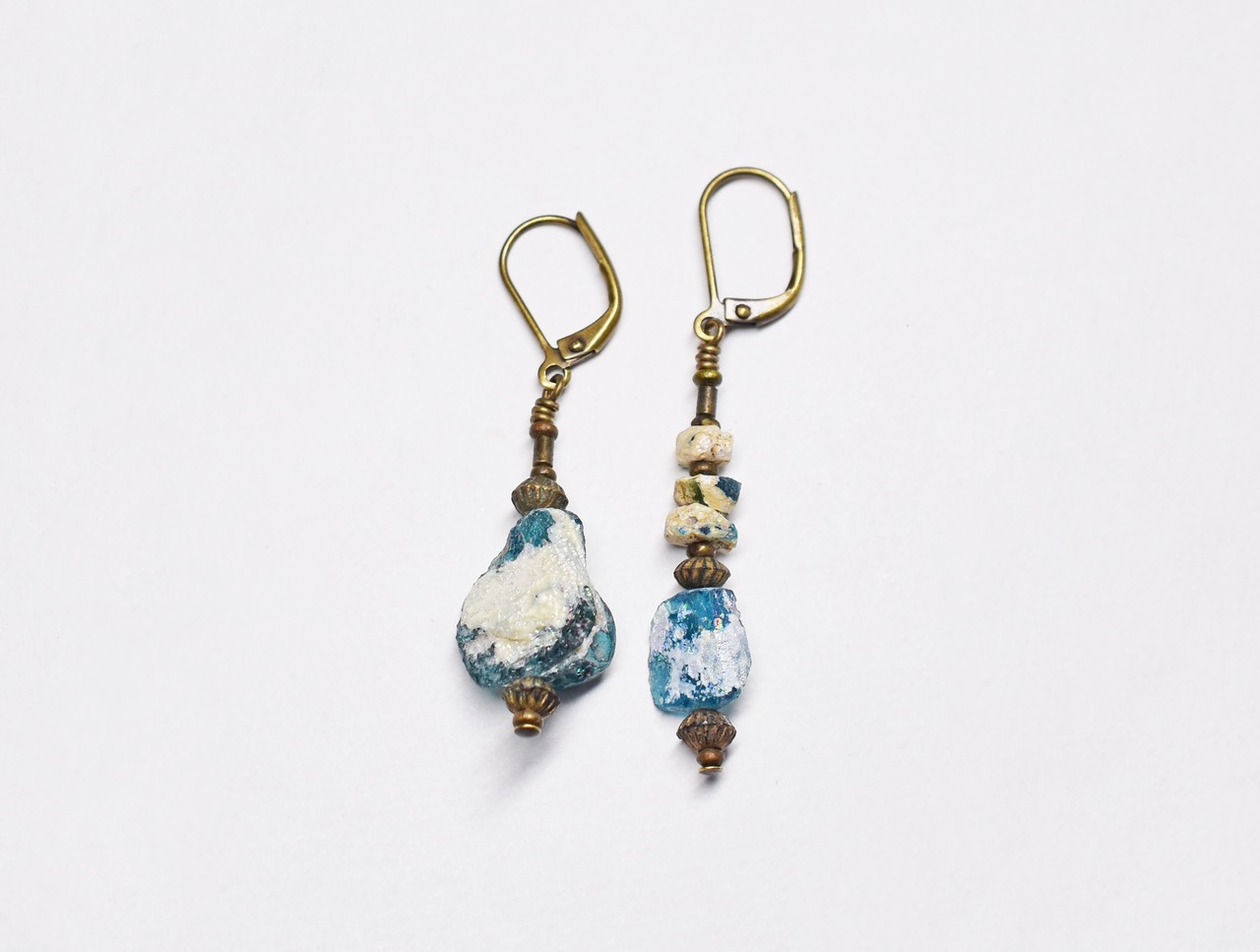 銀化ブルーローマングラスと古い真鍮ビーズのアンシメトリーピアス