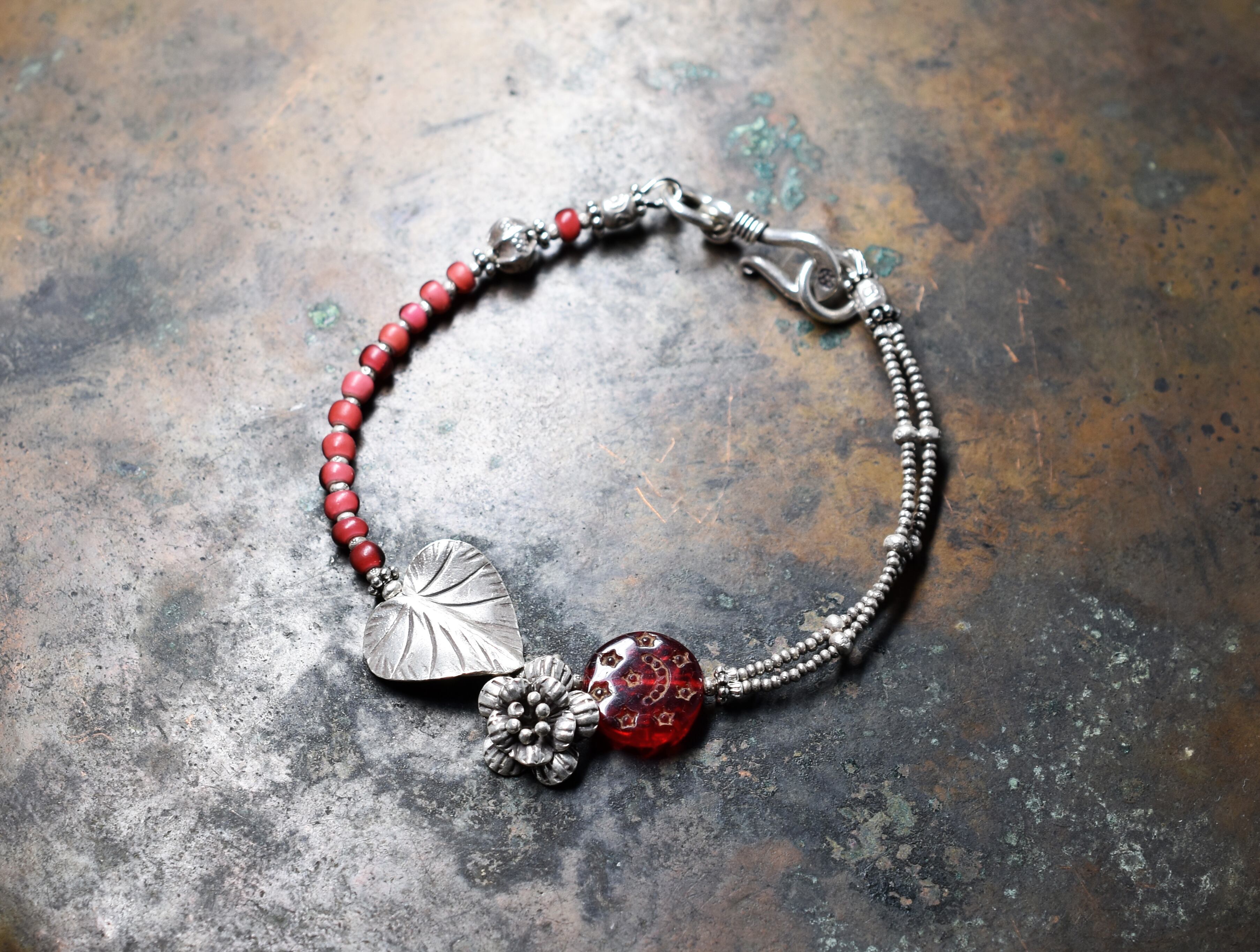 ボタニカルなカレンシルバーと、アンティークボヘミアビーズ、金赤のホワイトハーツで繋いだブレスです。