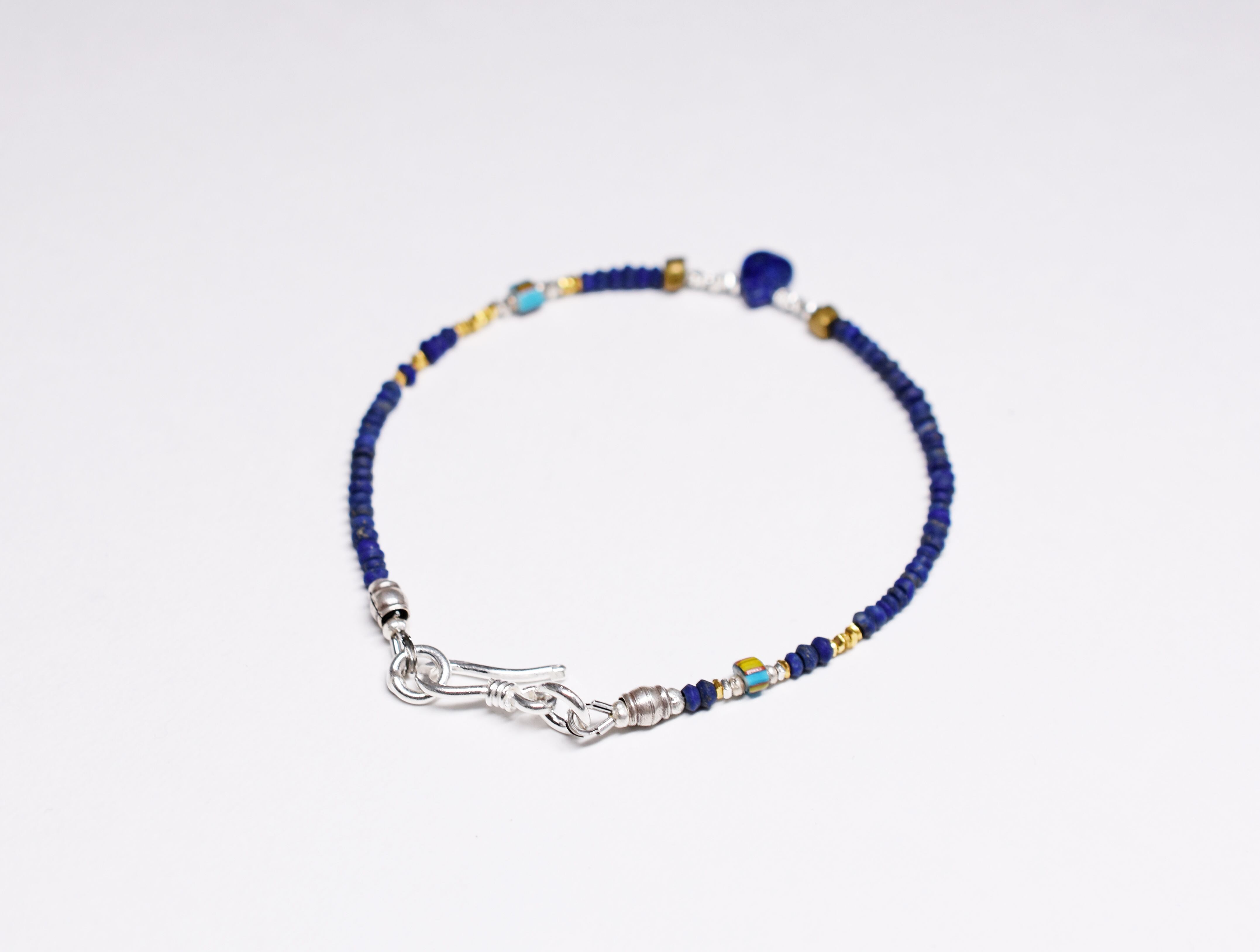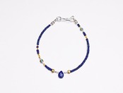 ラピスラズリのトップ、小さなラピスラズリと、ターコイズブルーホワイトハーツ、さざれ型のカレンシルバービーズを繋げたブレスです。