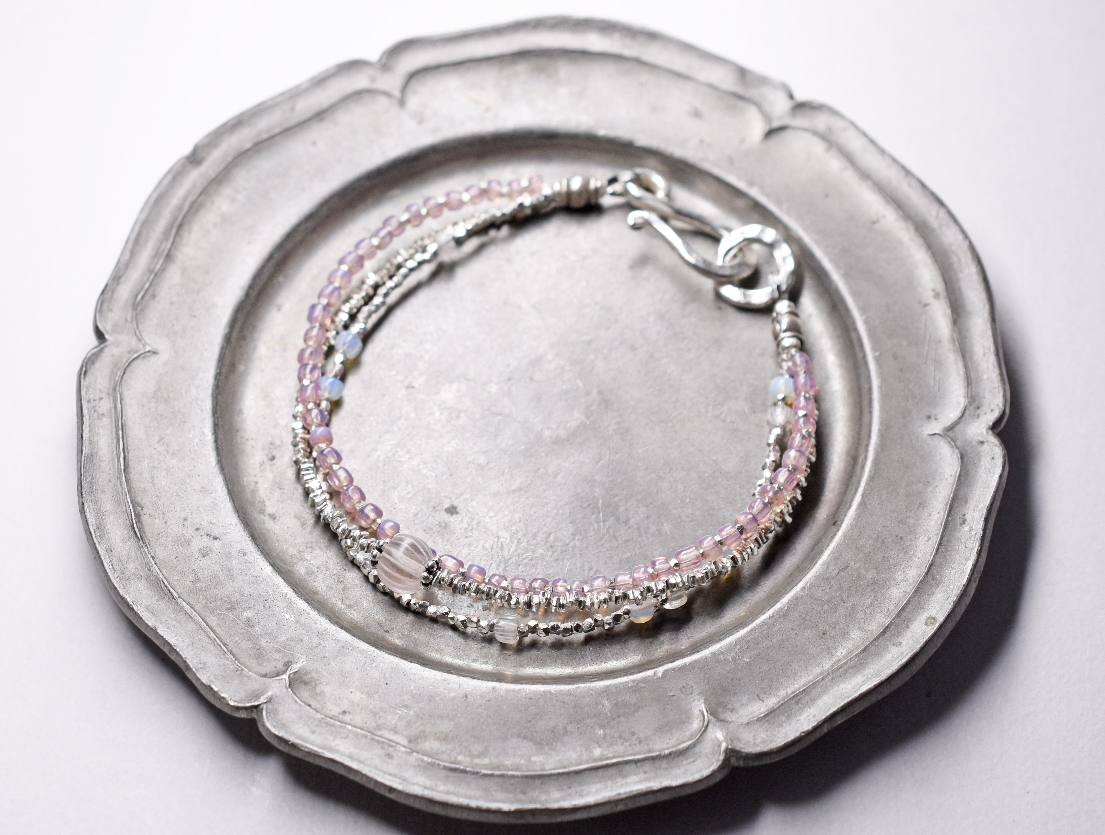 オパールピンクのアンティークビーズと、カレンシルバービーズ、グーズベリーを繋げた3連のブレスです。