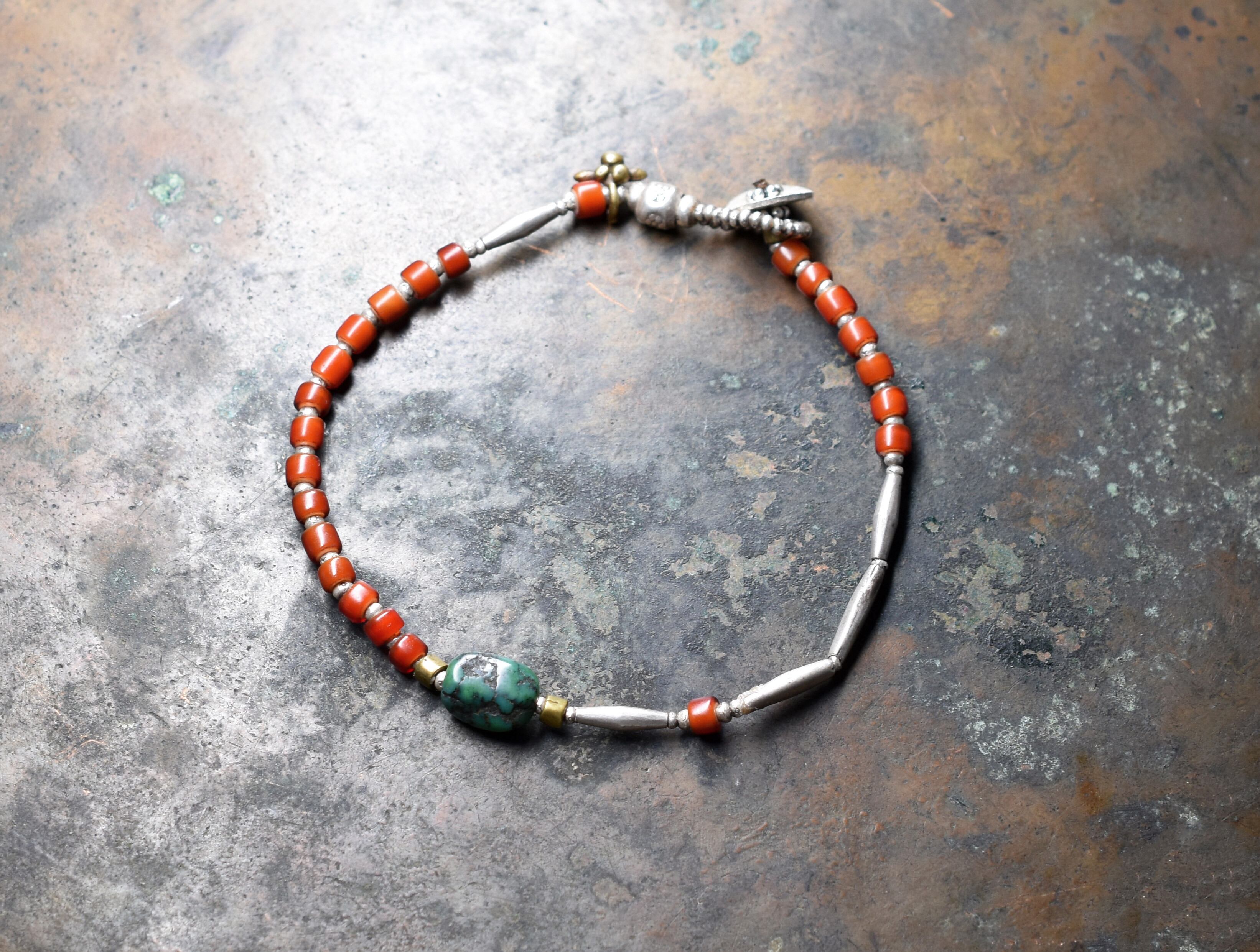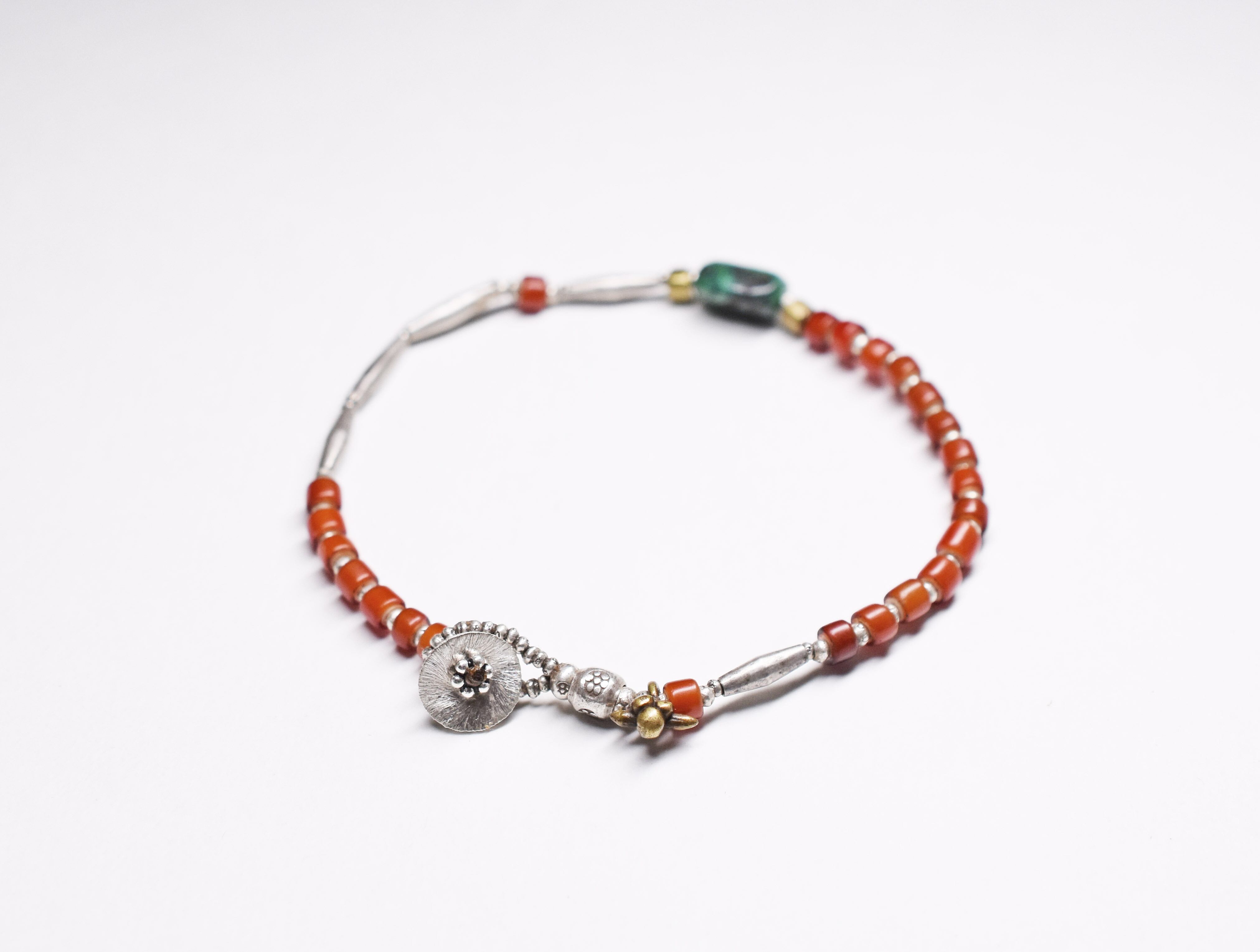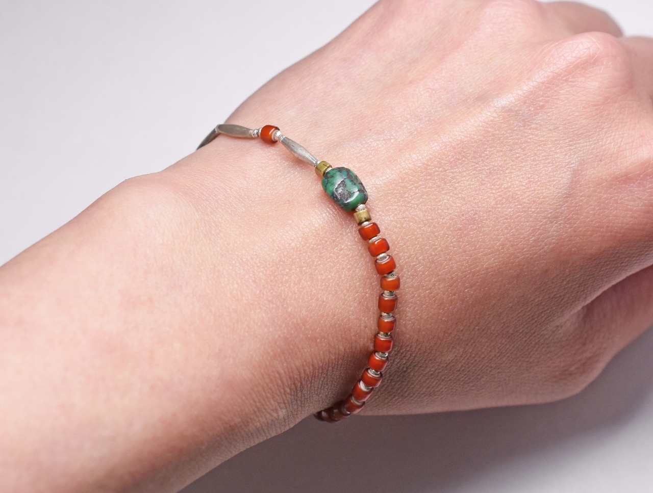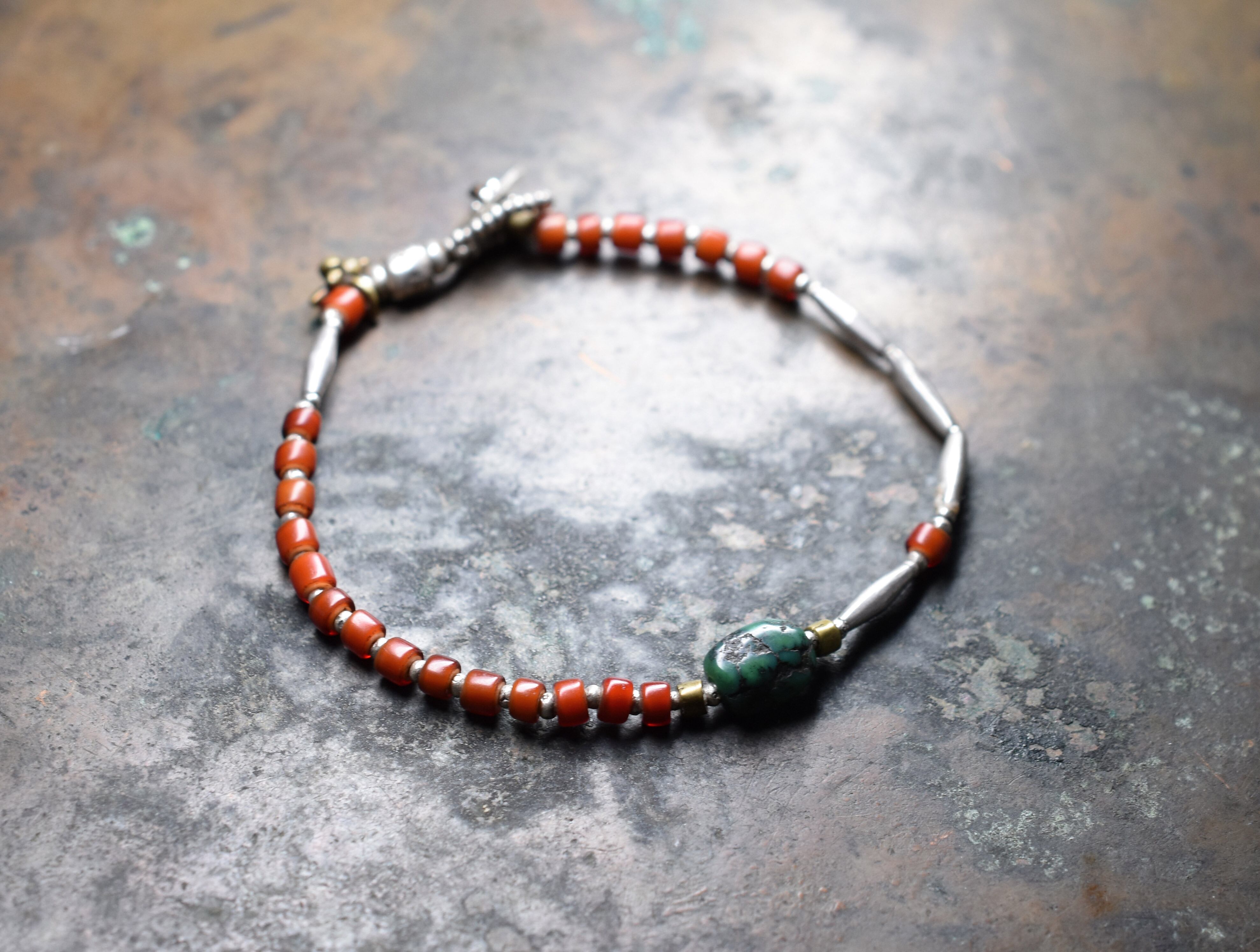 oldチベタンターコイズ、oldチンシルバー、ホワイトハーツ、oldオリッサブラスを、小さなカレンシルバーで繋いだブレスです。
