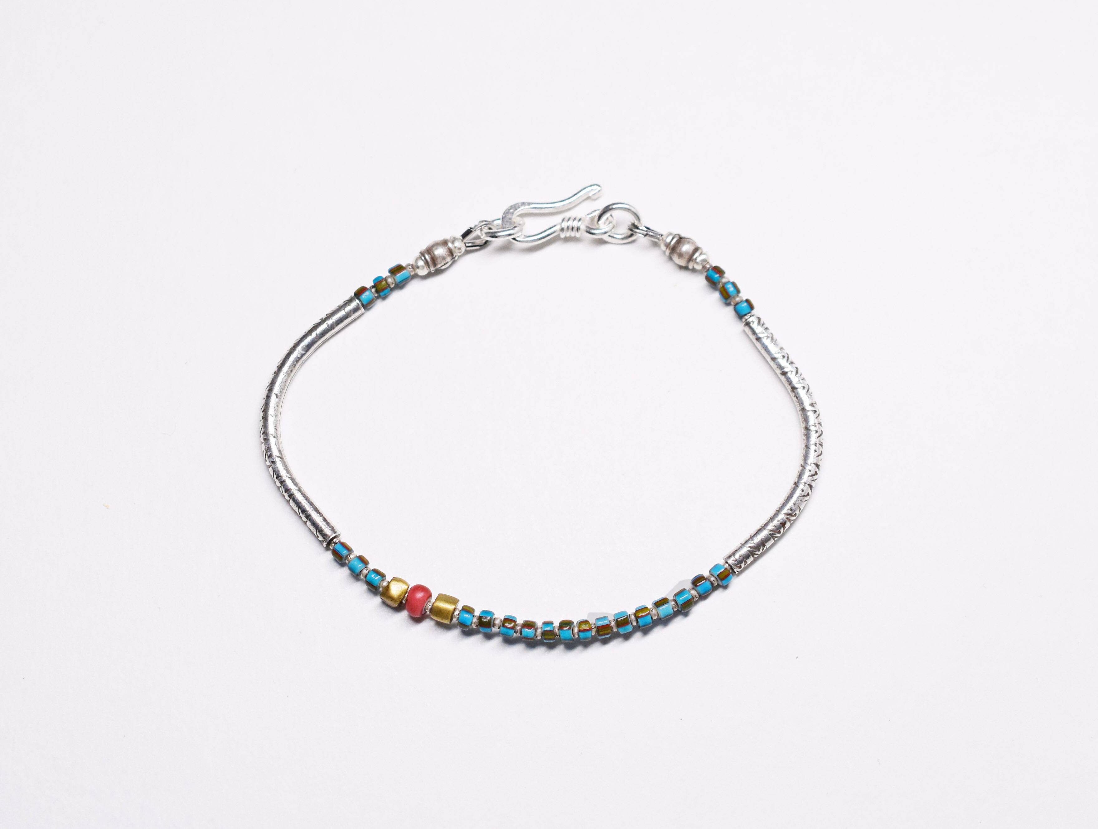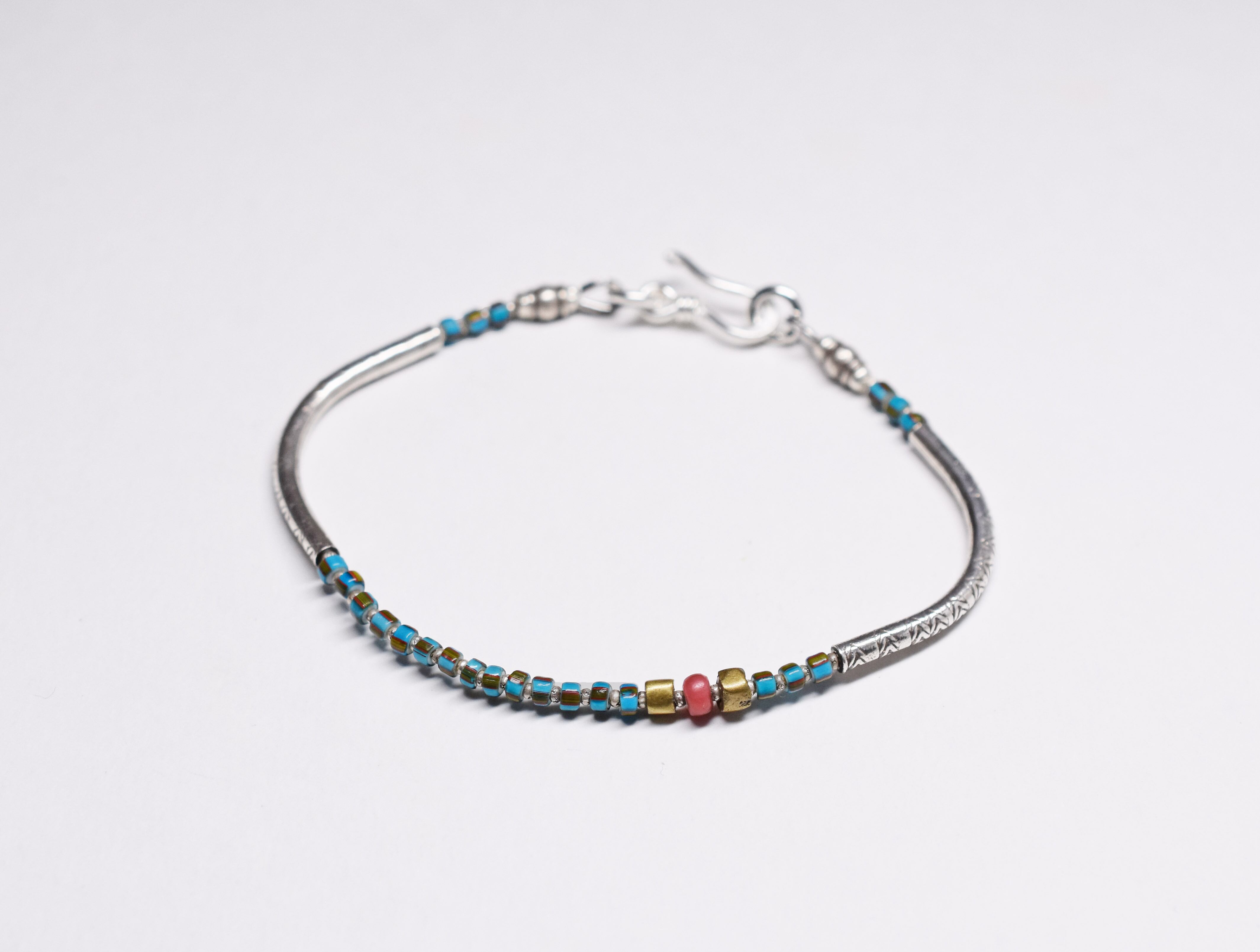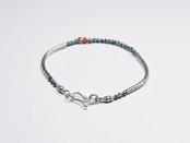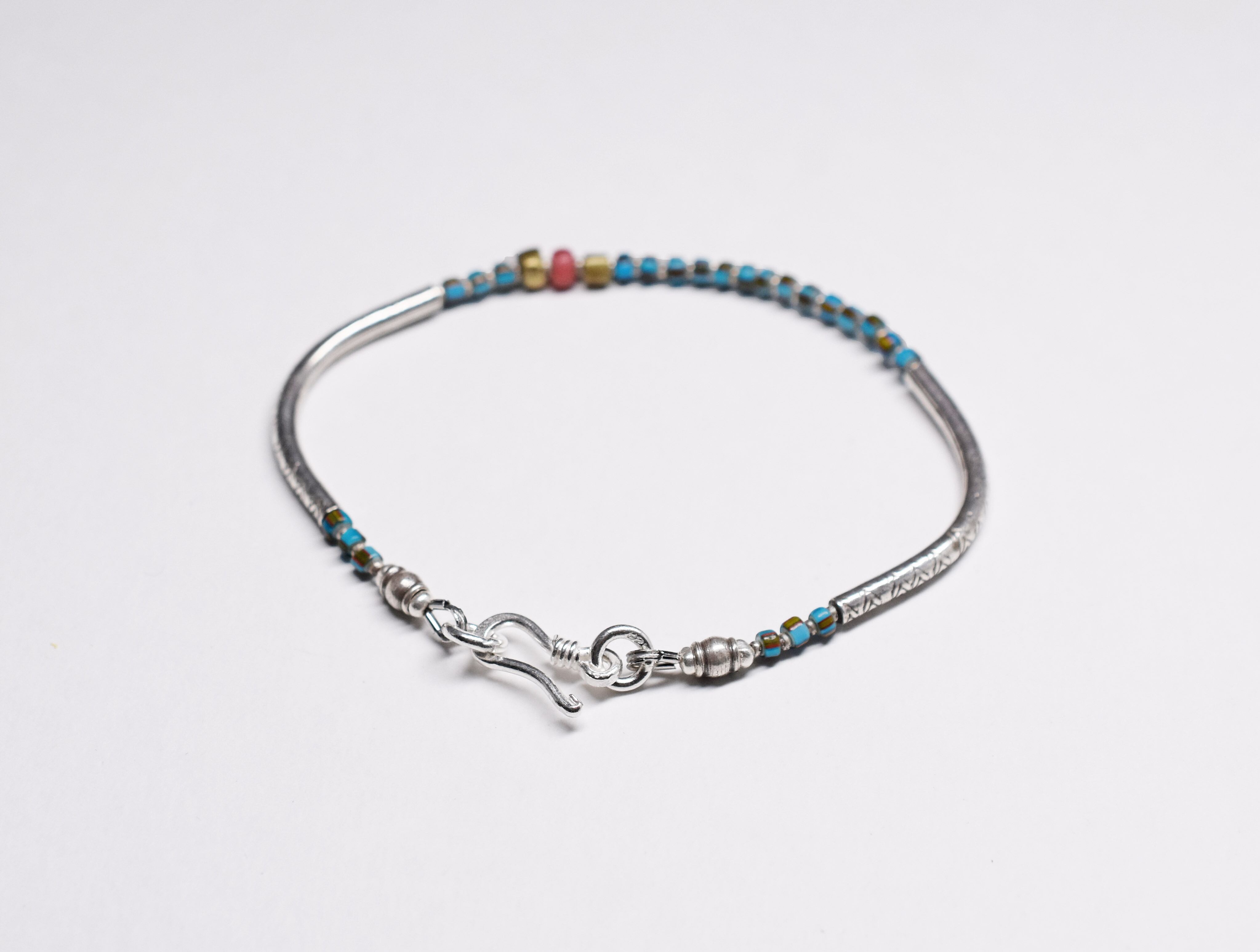 縞模様ターコイズブルーホワイトハーツと一粒金赤ホワイトハーツを入れたカレンシルバーの湾曲ブレス