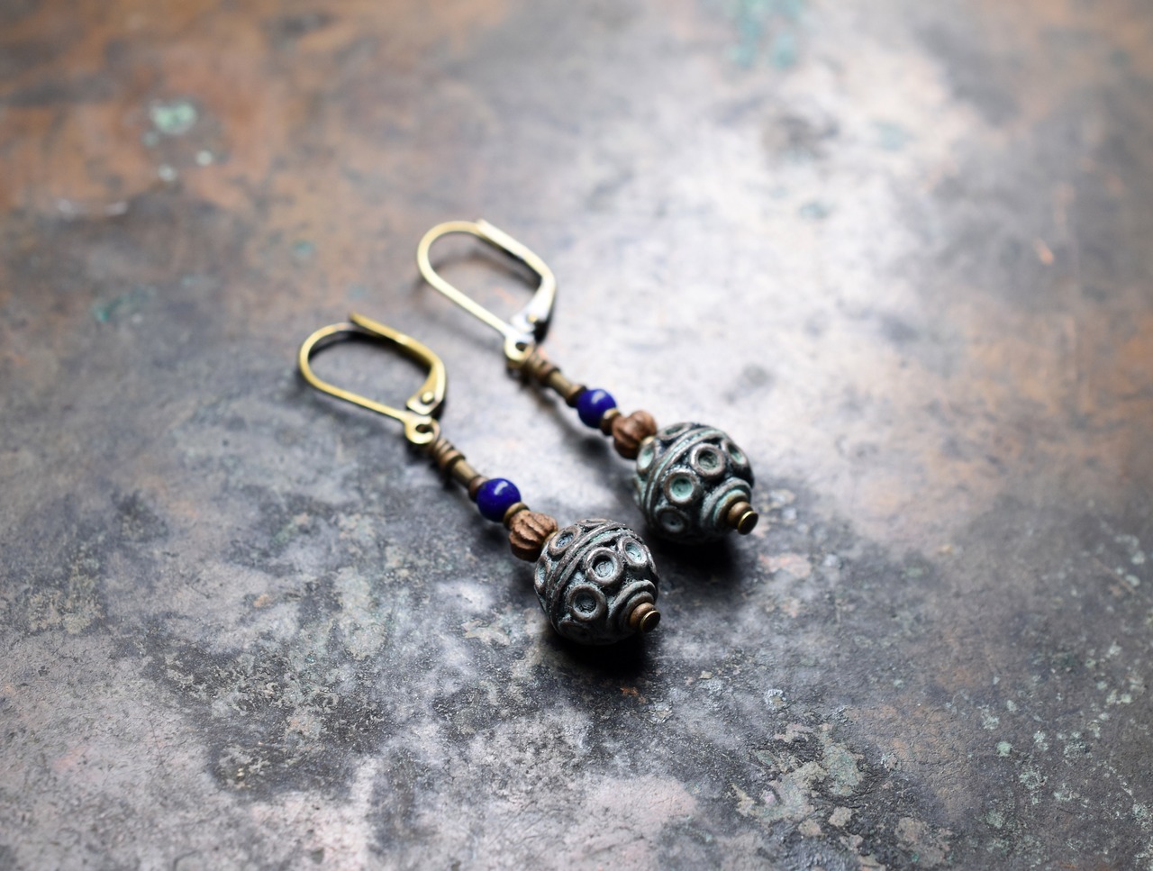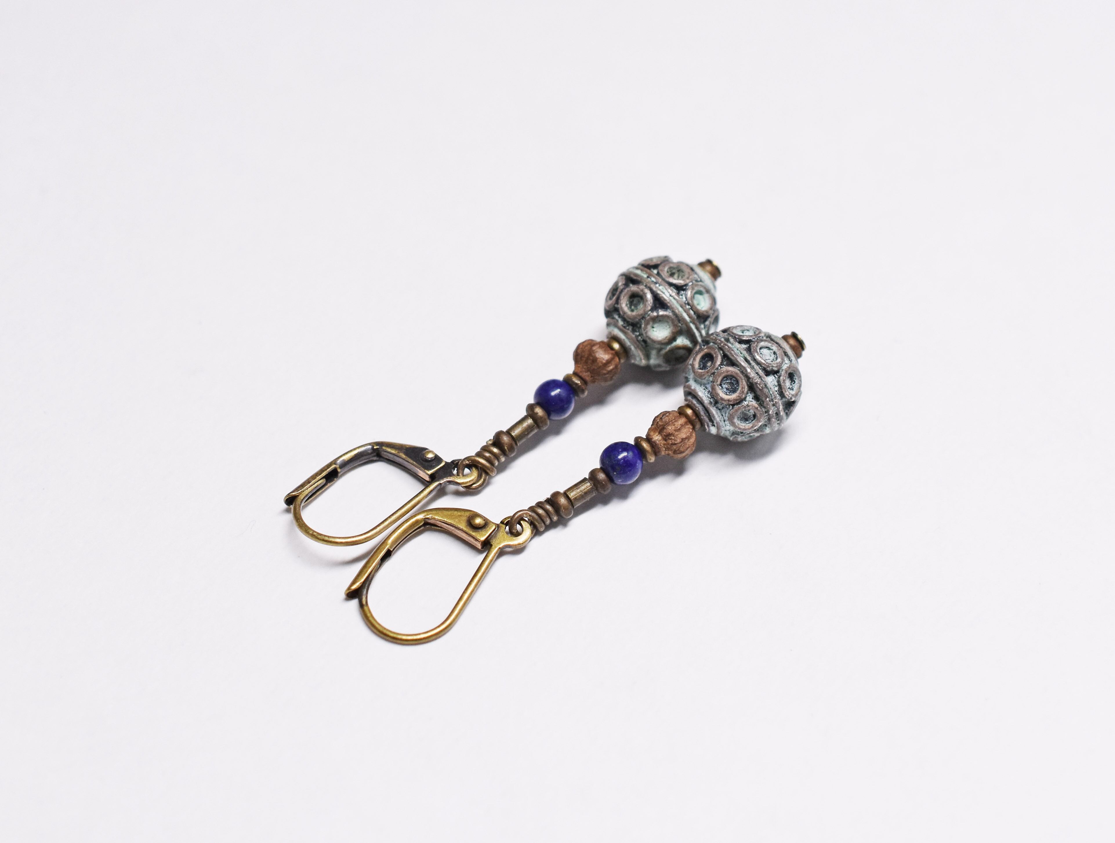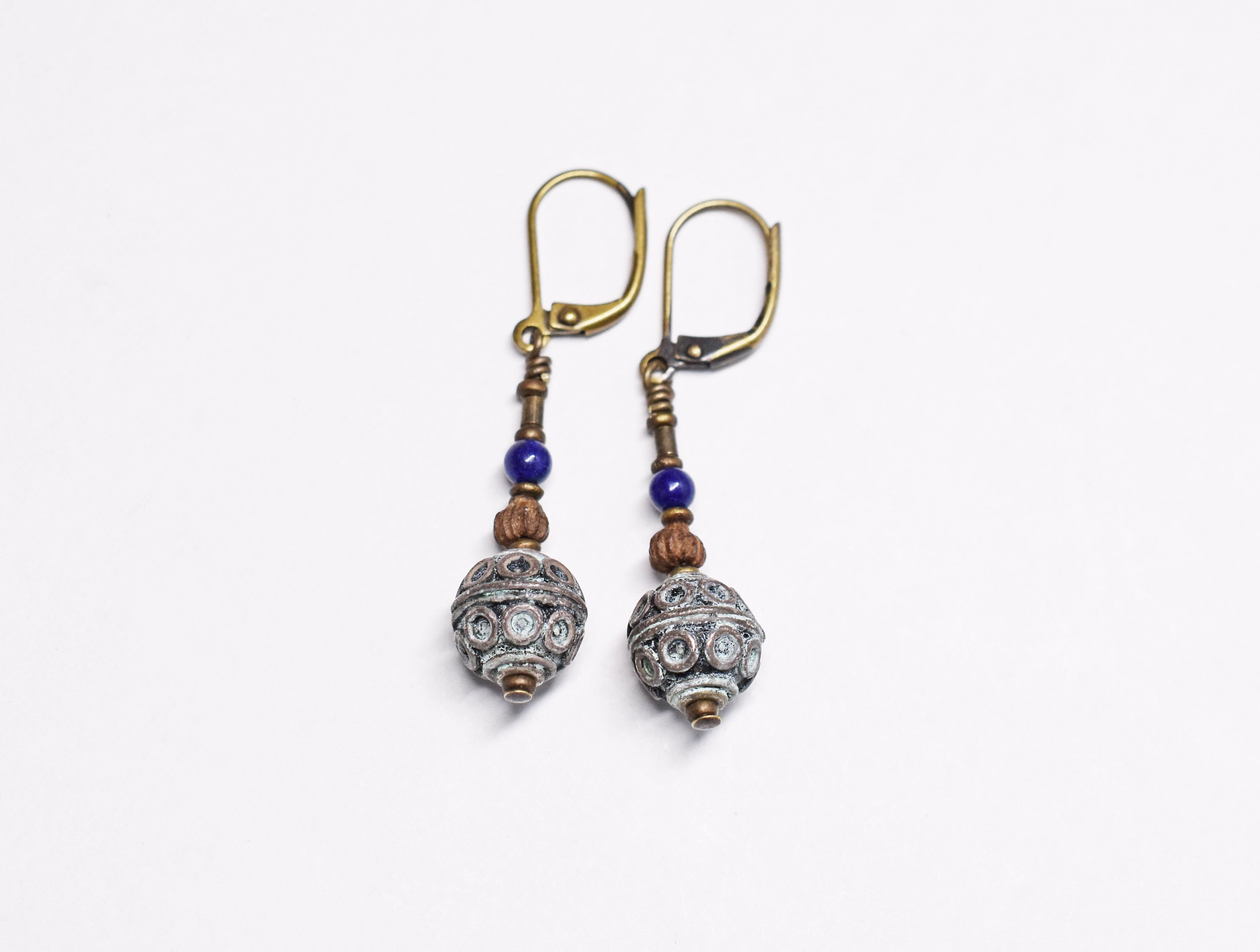 アフガニスタンのメタルパーツと、木の実、ラピスラズリを繋いだピアスです。