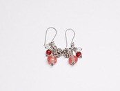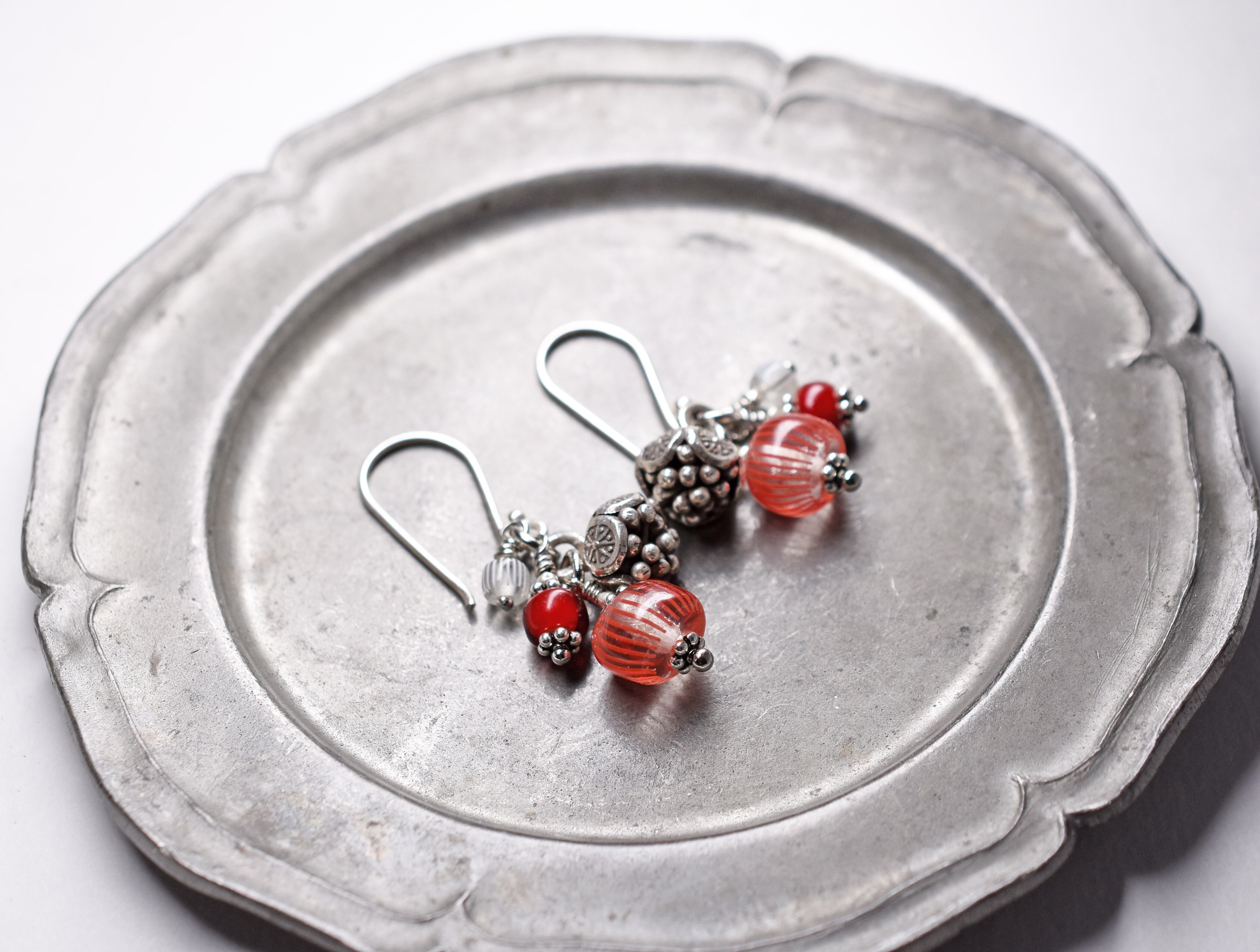 ストライプ模様のアンティークビーズと、木の実のような真っ赤なアンティークビーズ、小さなグーズベリー、カレンシルバーチャームを繋いだピアスです。