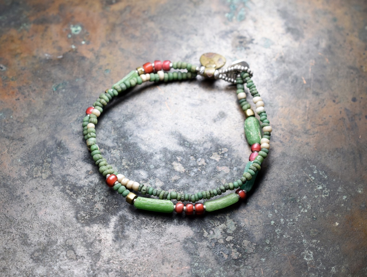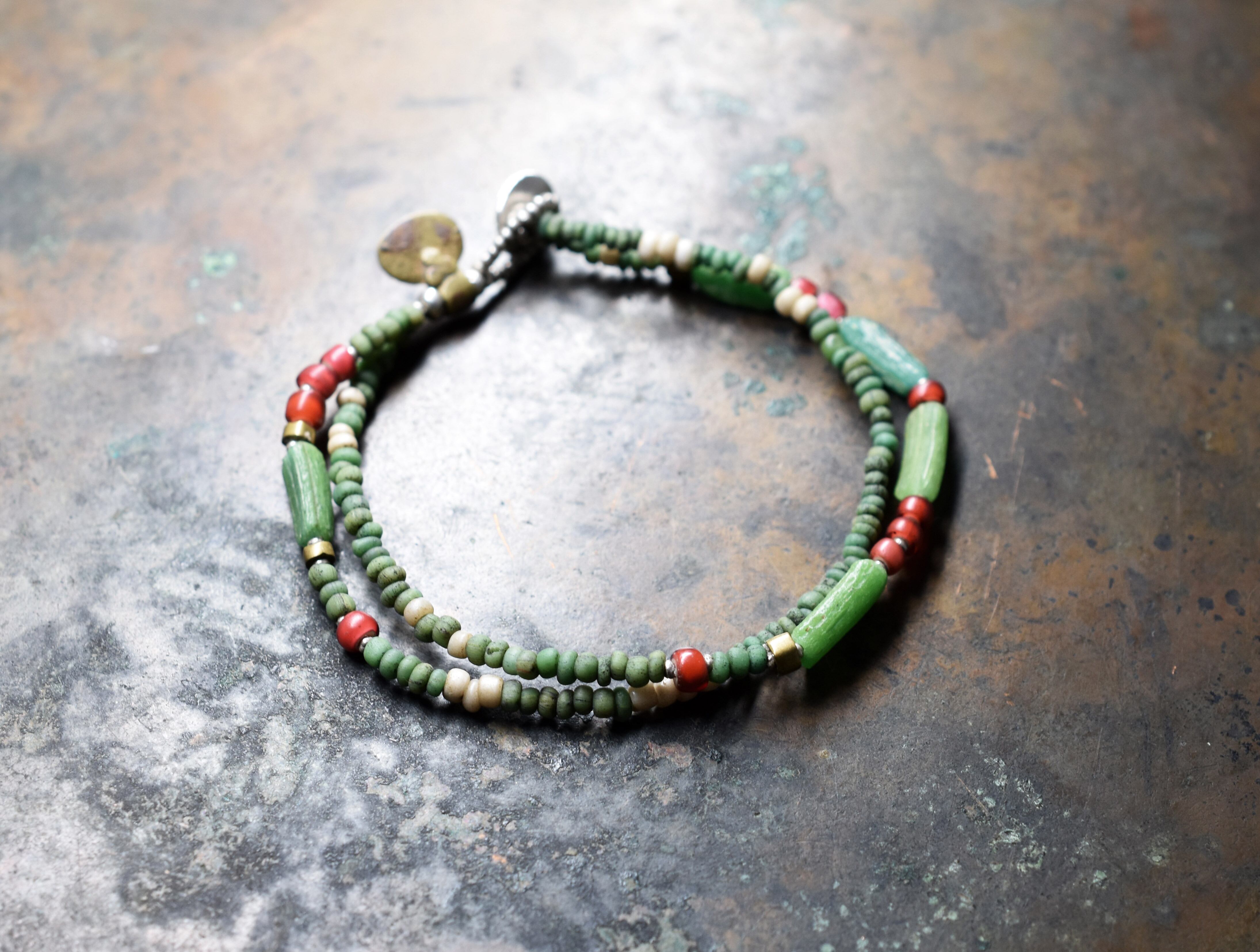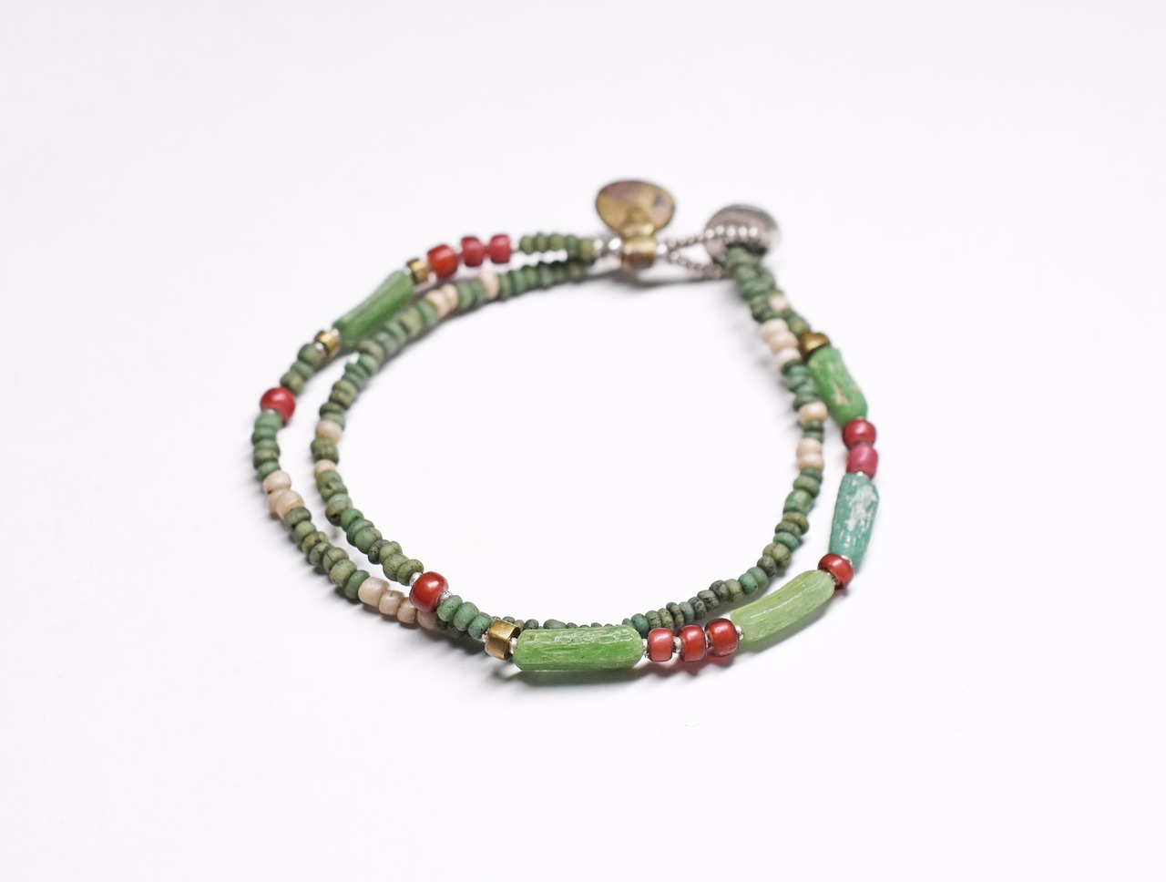 萌黄色のアンティークビーズと、ローマングラス、金赤ホワイトハーツを繋いだ2連のブレスです。