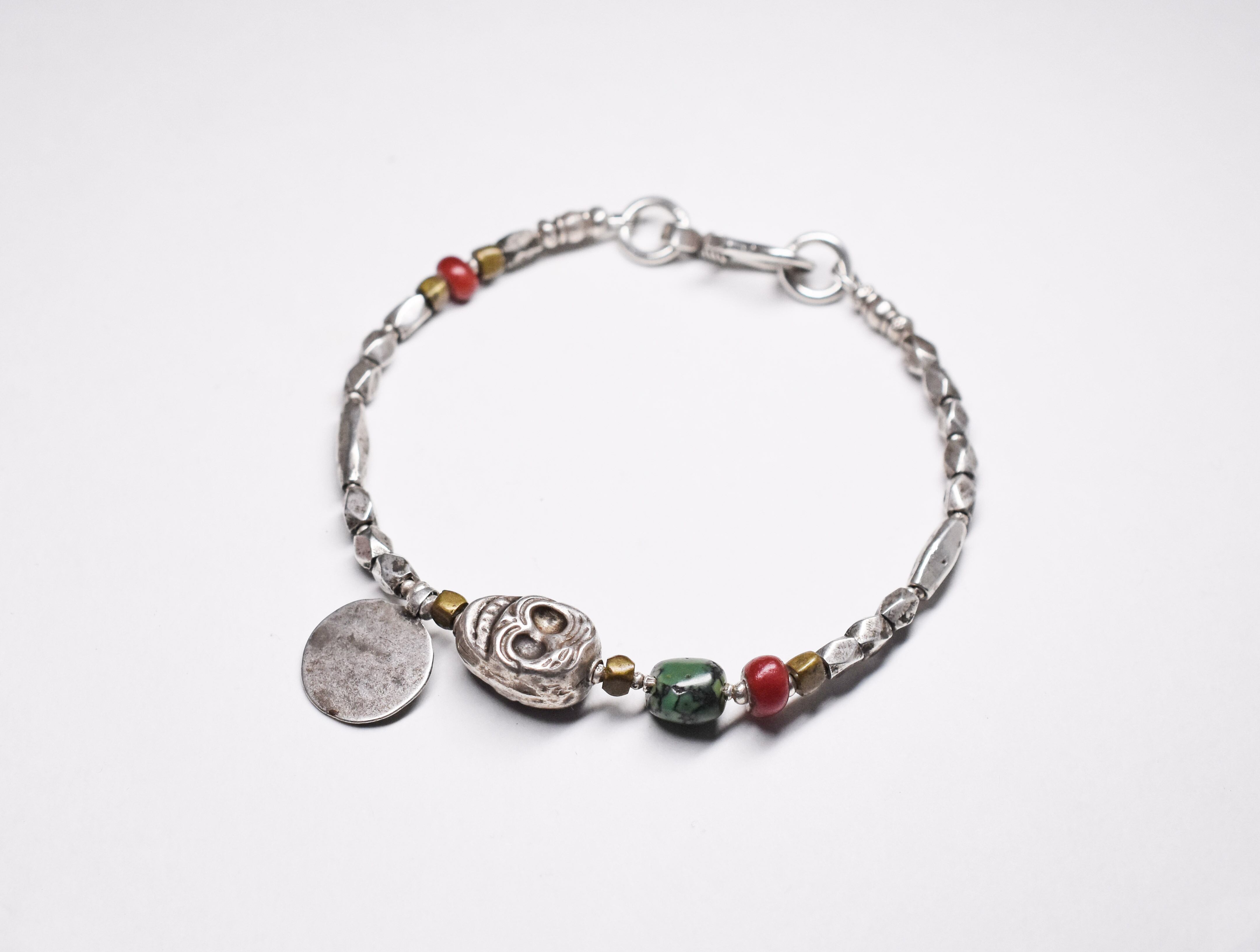oldチベタンミンゴォとoldチベタンターコイズ、金赤ホワイトハーツ、oldチンシルバー、oldオリッサブラスを繋いだスペシャルなブレスです。