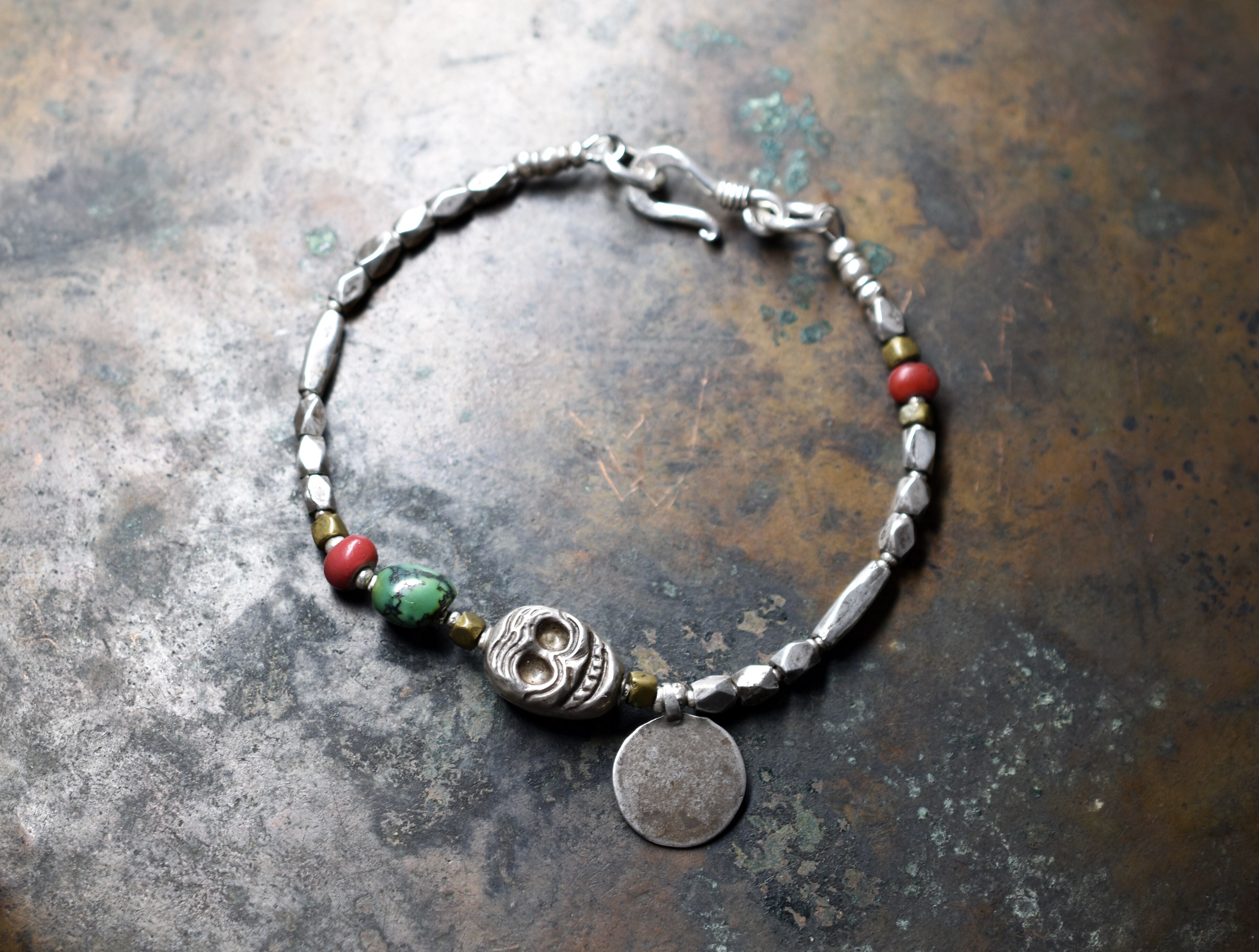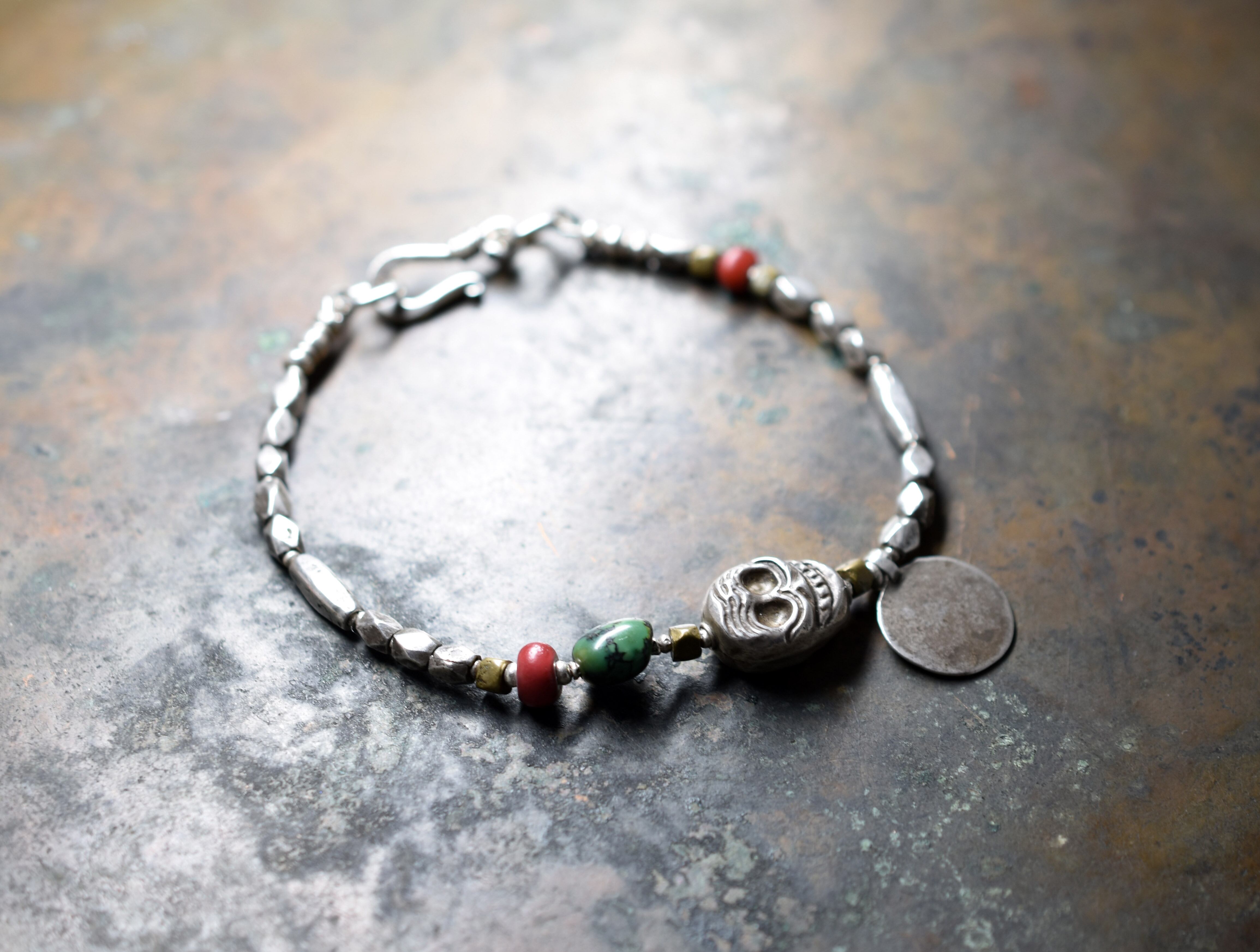 中央部分のスカルビーズはチベットから届いた古いシルバー製のパーツです。数珠に使われるカウンターのパーツとして含まれていたものです。