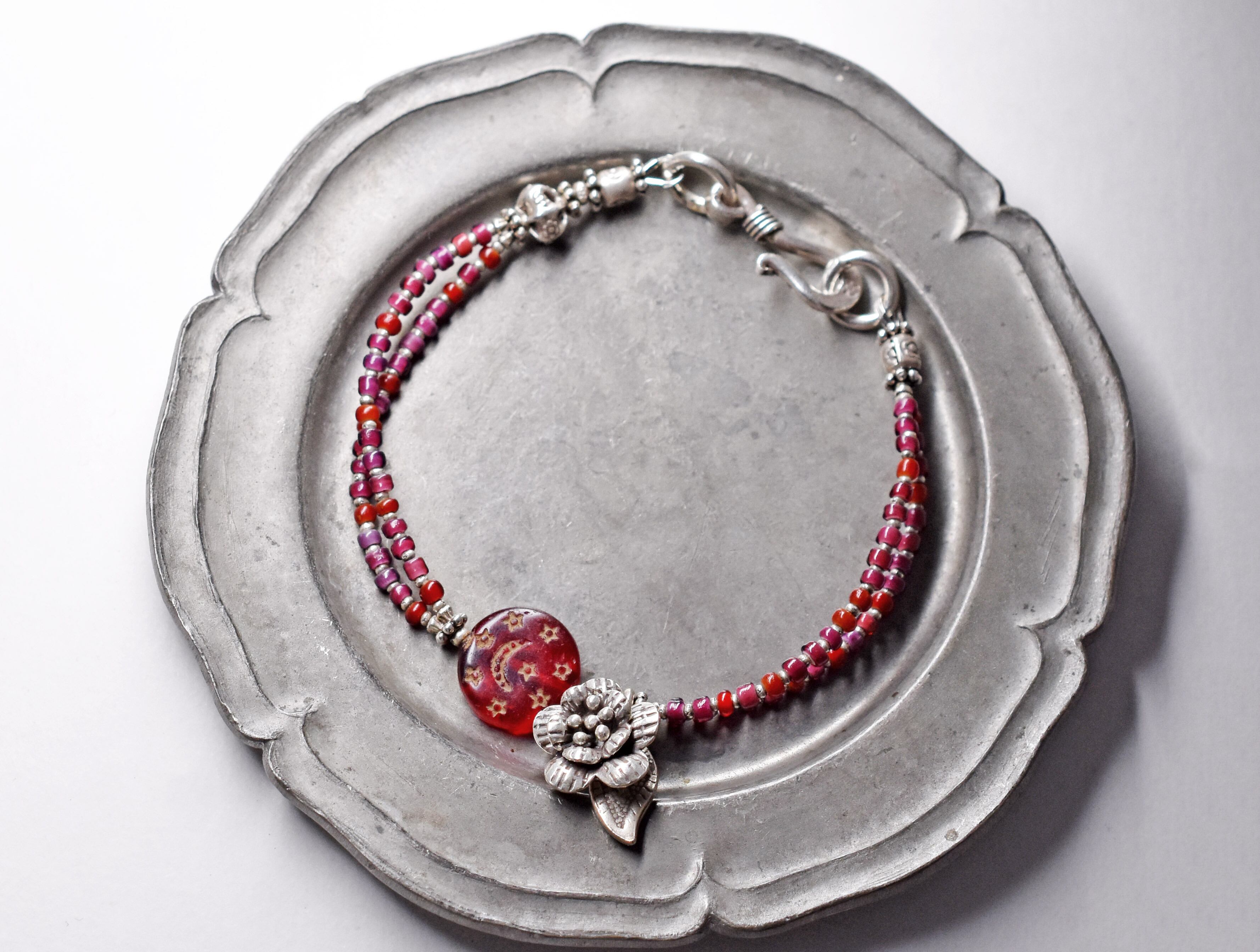 濃淡のある紫色や赤色のビーズはホワイトハーツと呼ばれるアンティークビーズです。