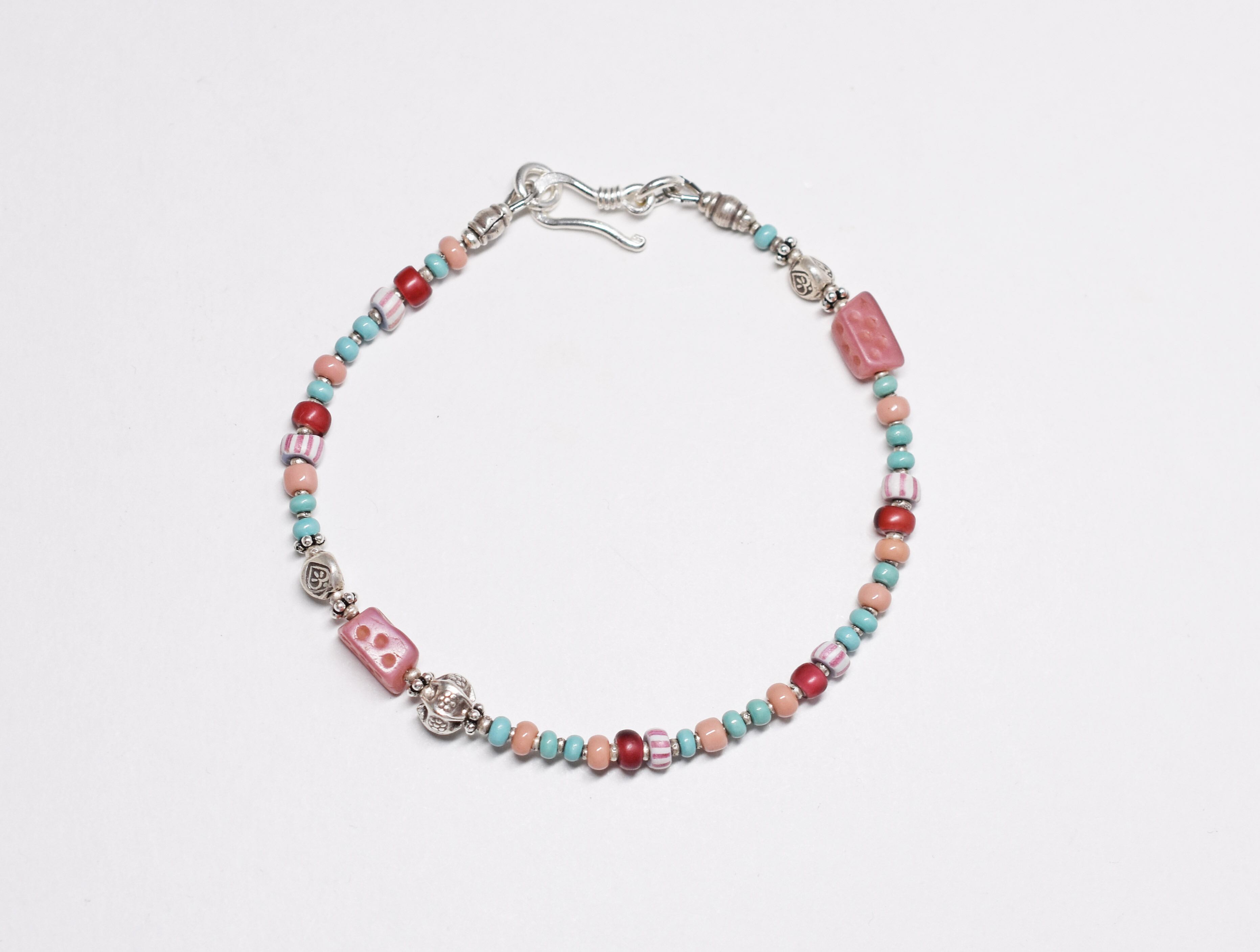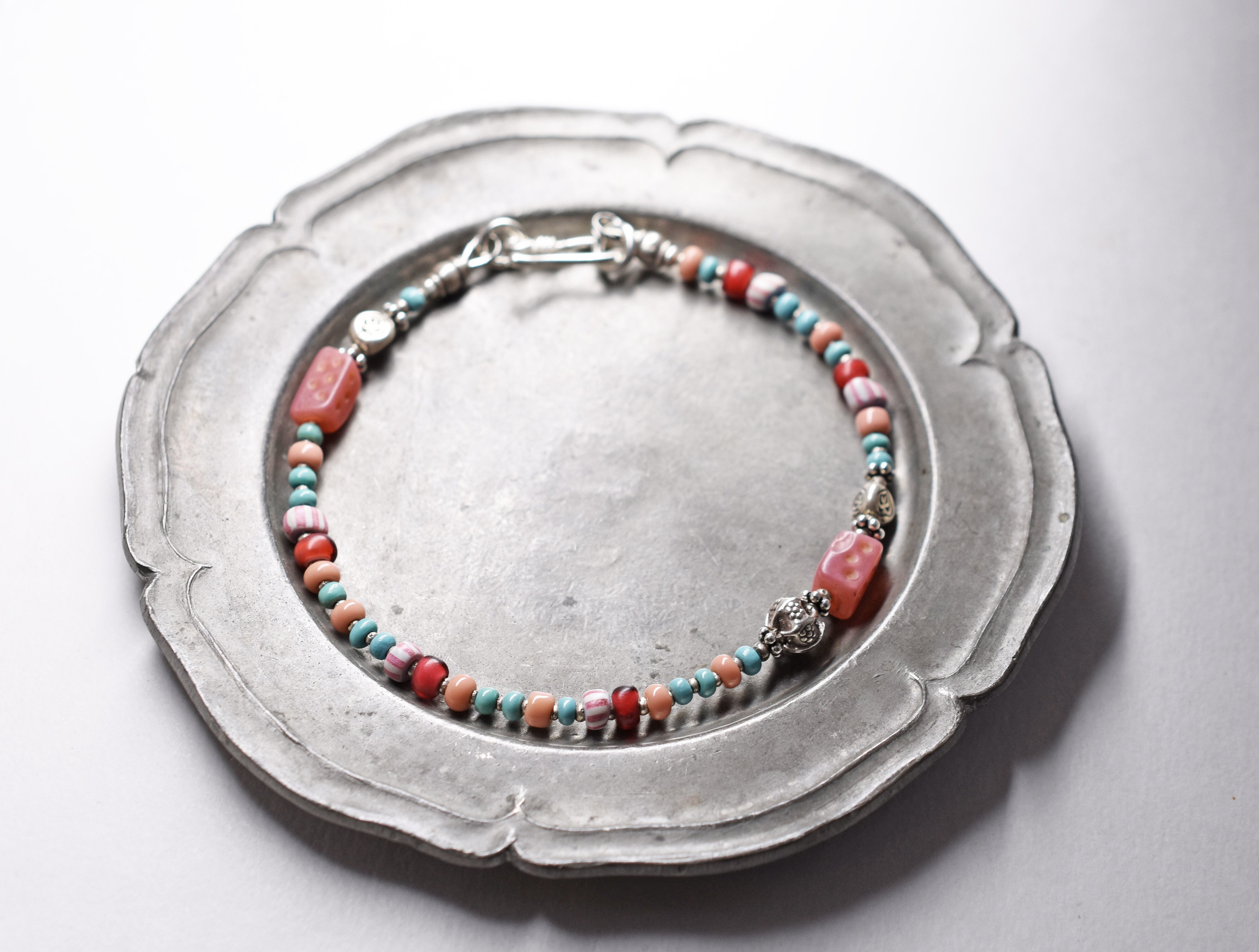 多彩なベネチアビーズと、ピンク色のダイスビーズ、カレンシルバーを繋いだブレスです。