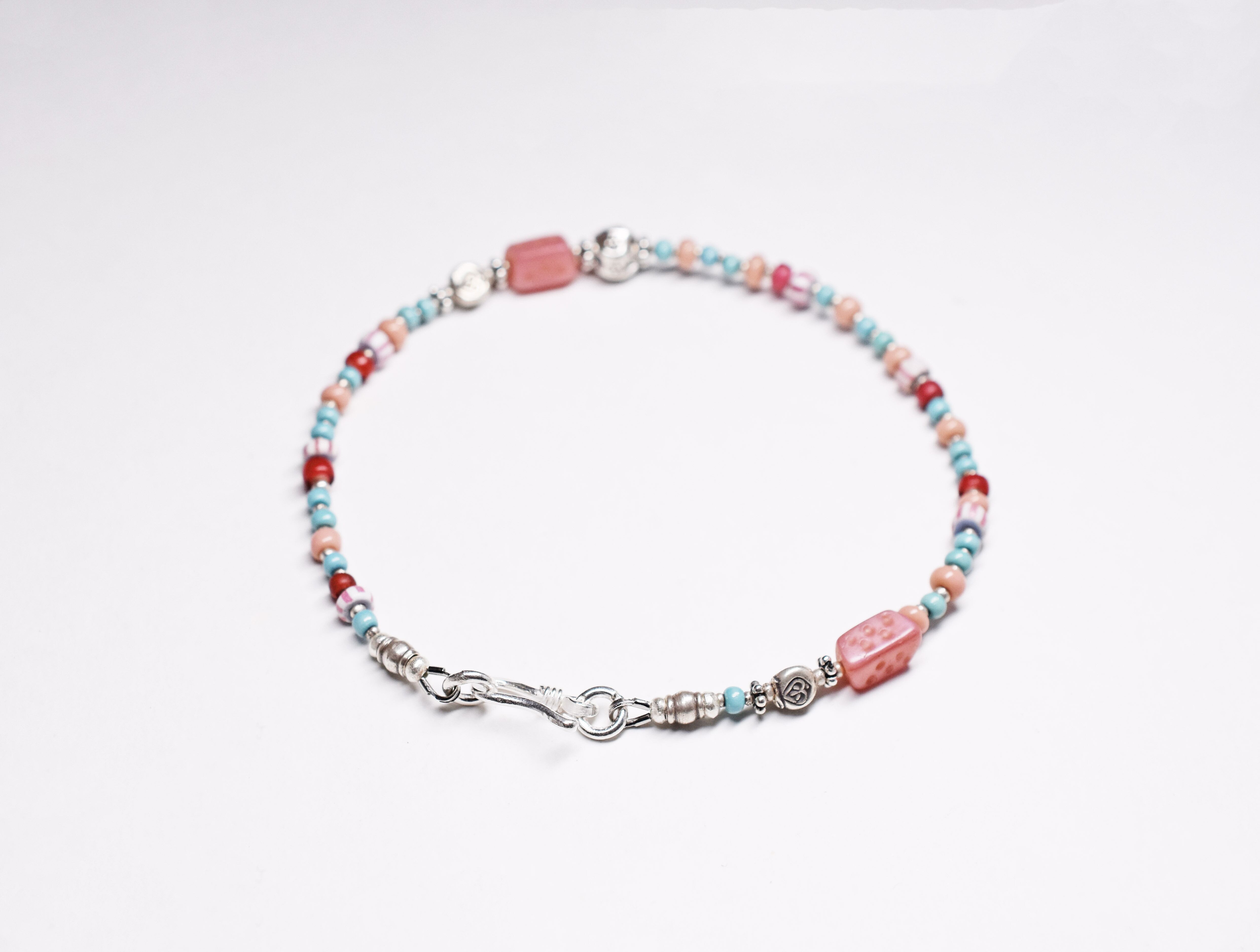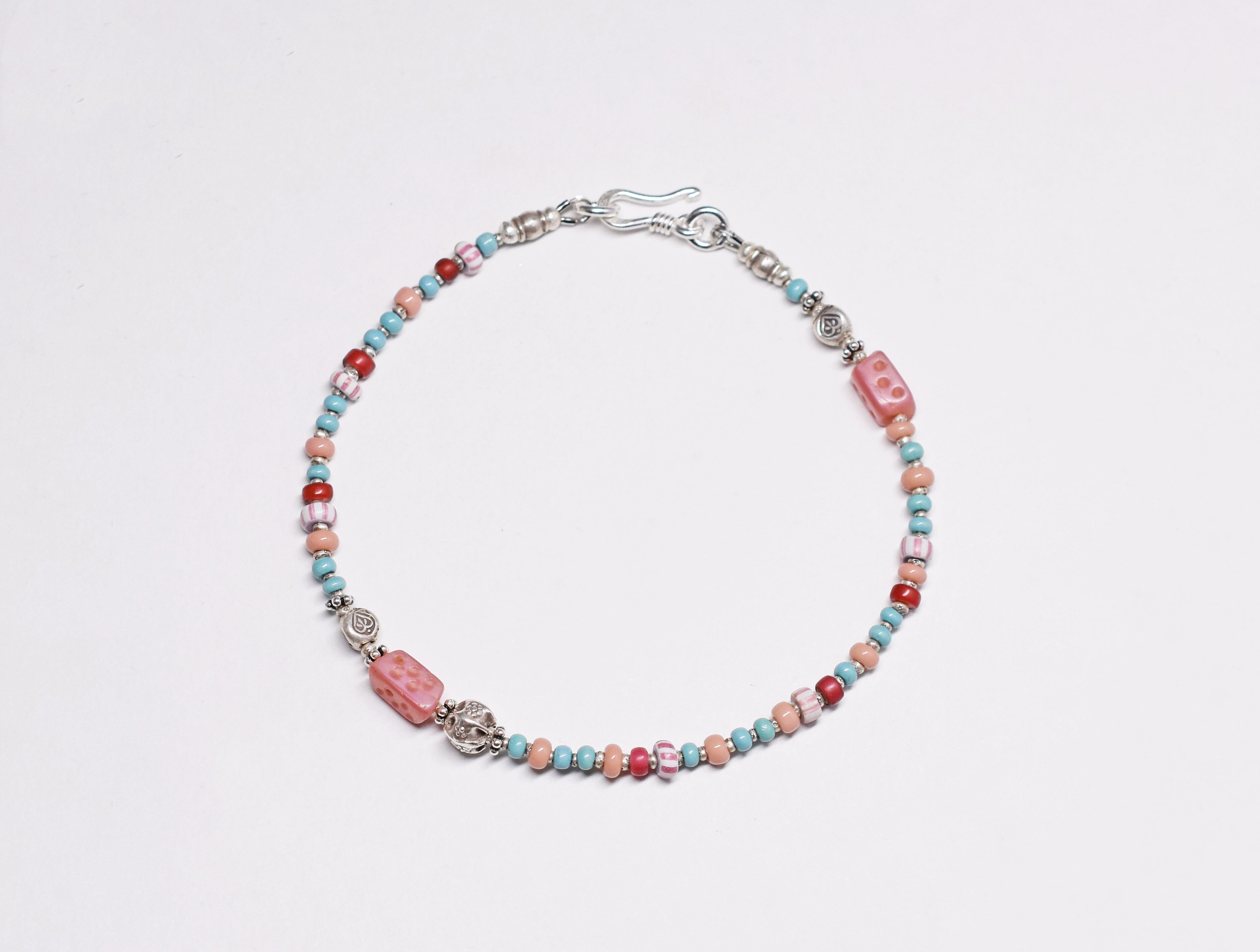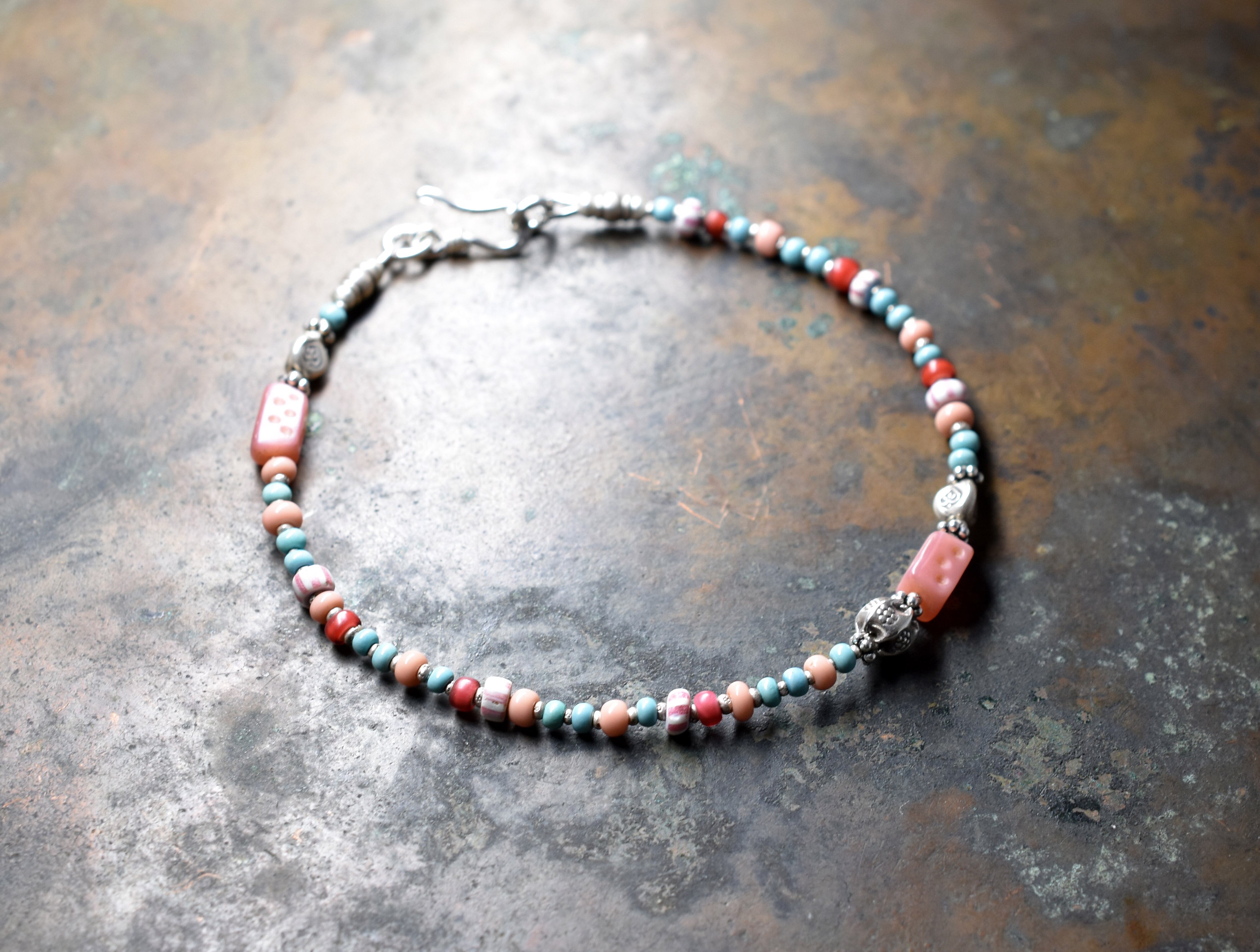 多彩なベネチアビーズと、ピンク色のダイスビーズ、カレンシルバーを繋いだアンクレットです。