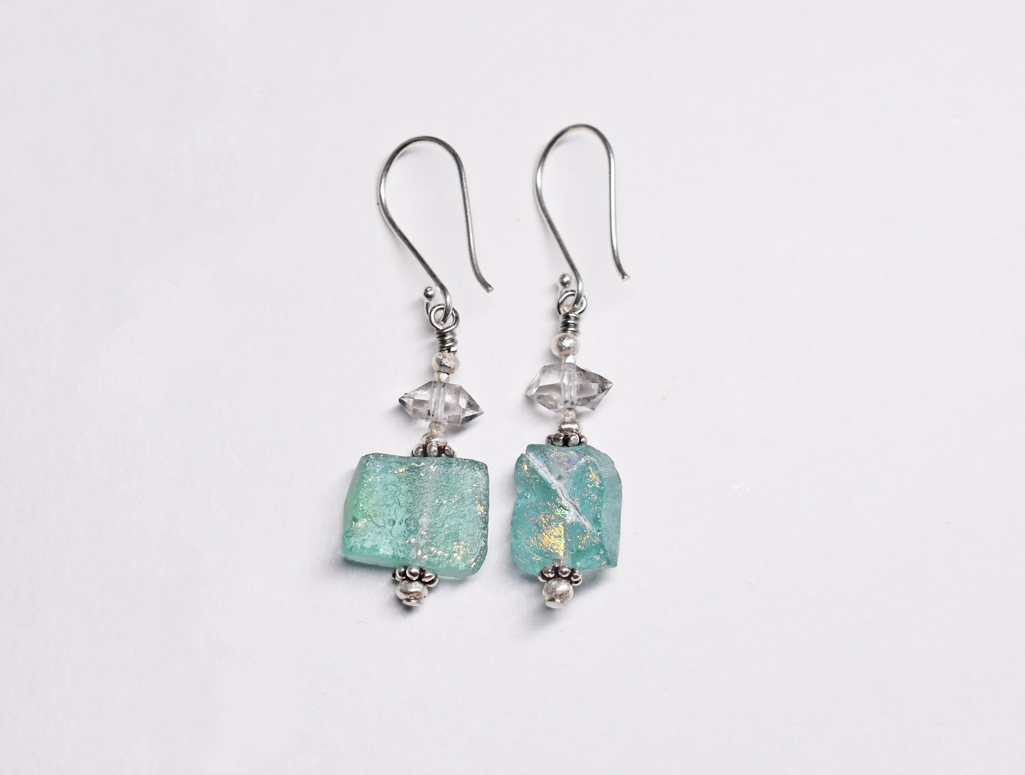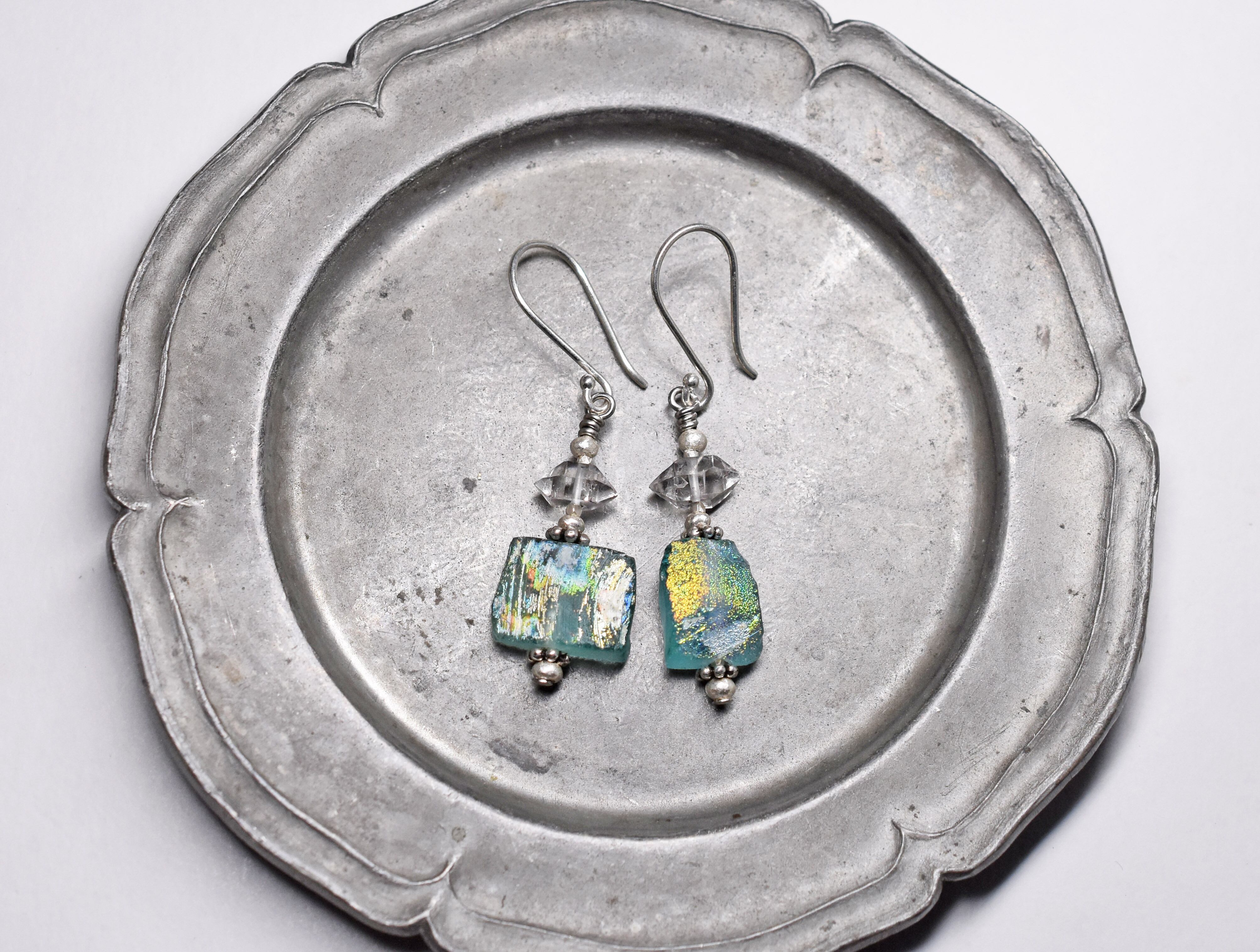 銀化したローマングラスと、ハーキマーダイヤモンドを繋いだピアスです。