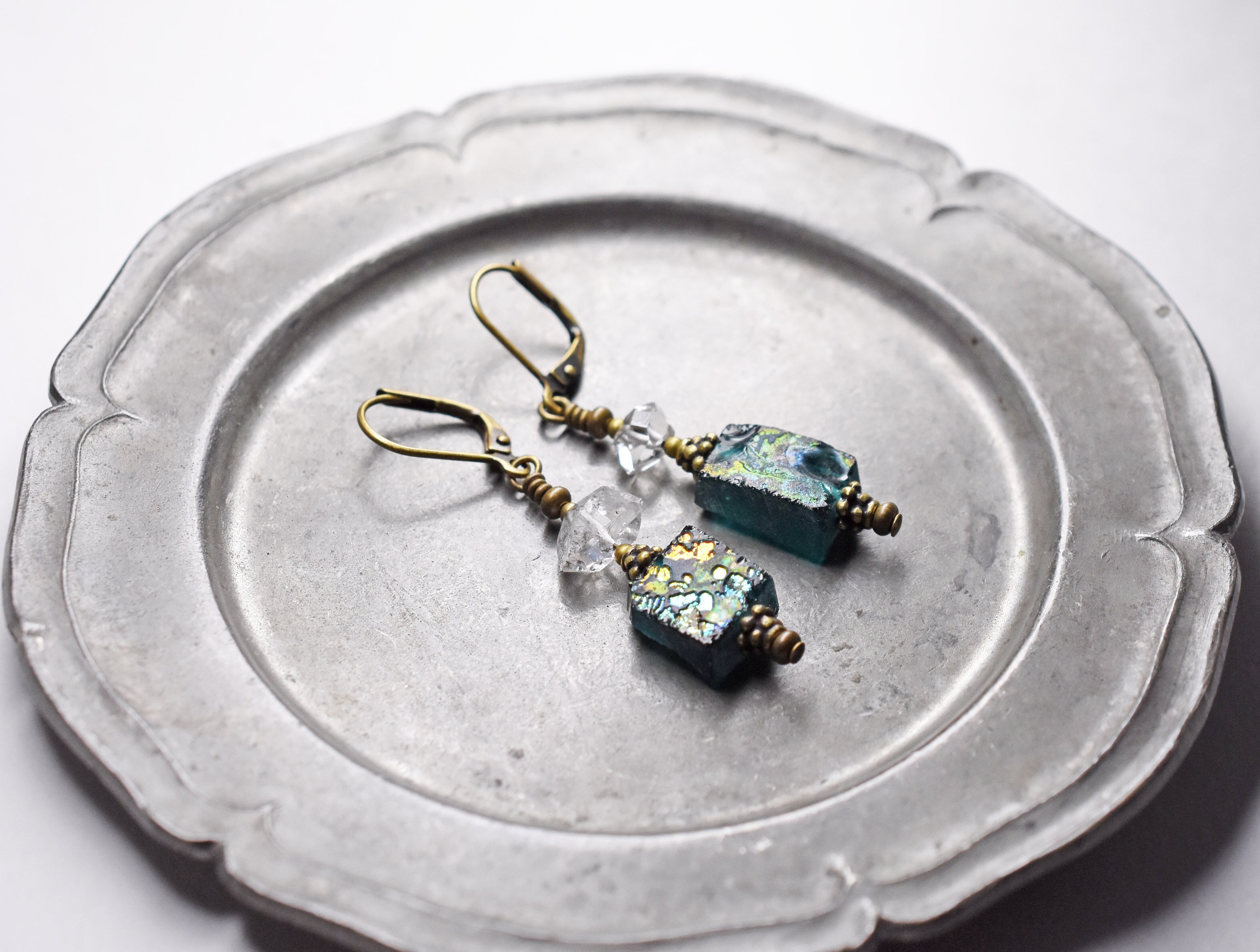 銀化ブルーグリーンローマングラスとハーキマーダイヤモンドのピアス