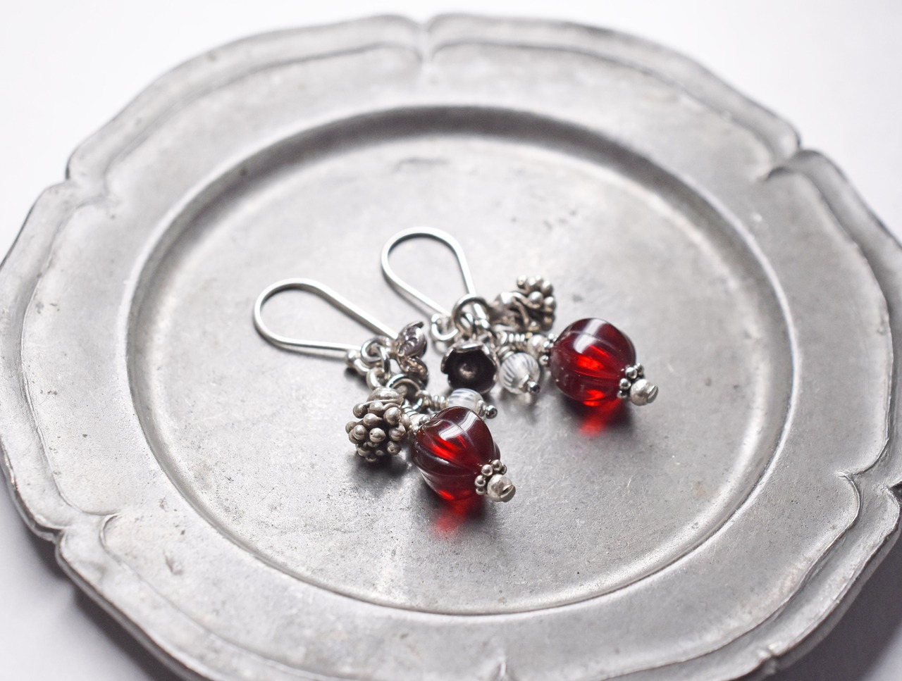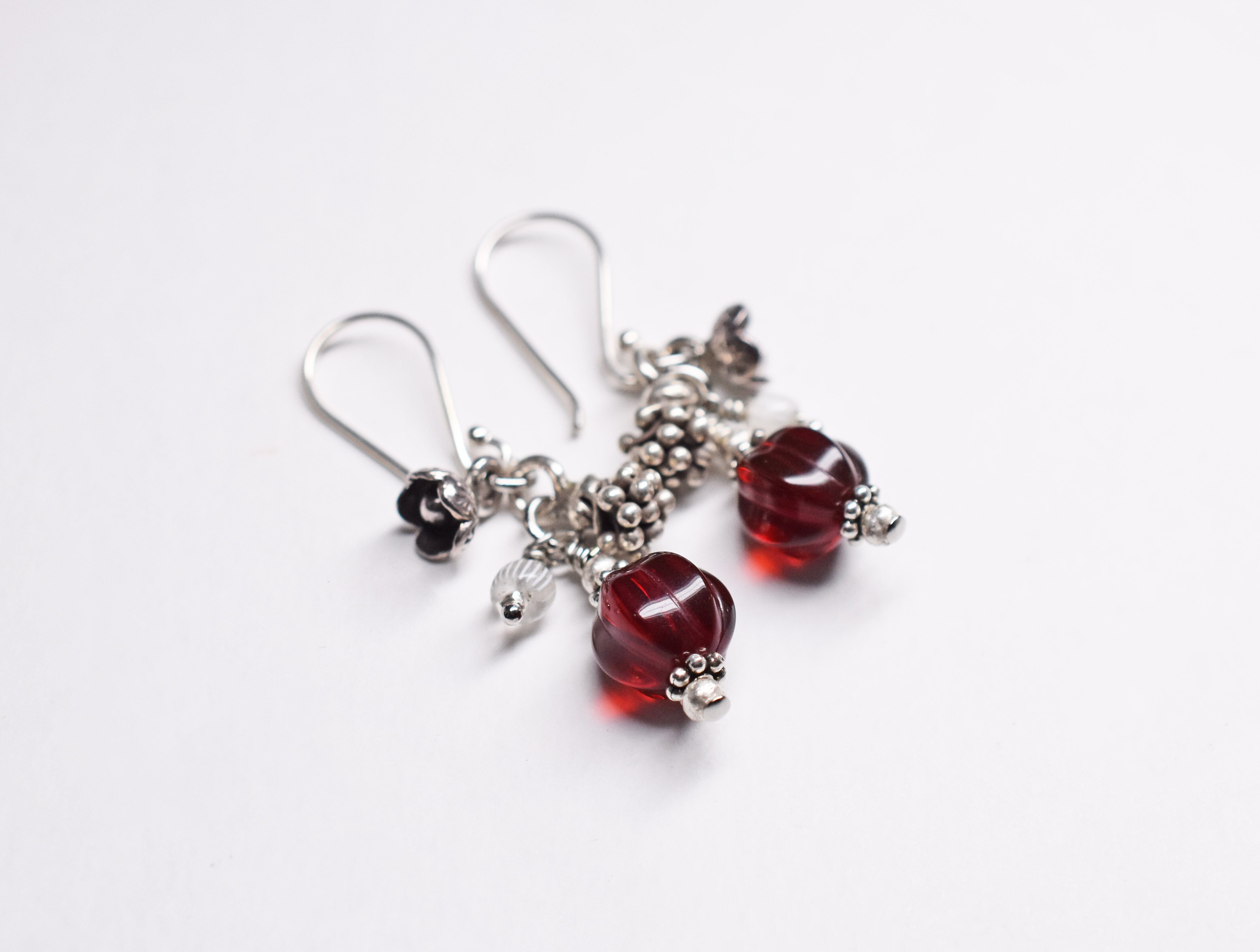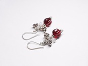 丸い深紅のドイツヴィンテージガラスビーズとカレンシルバーのお花&蕾ピアス