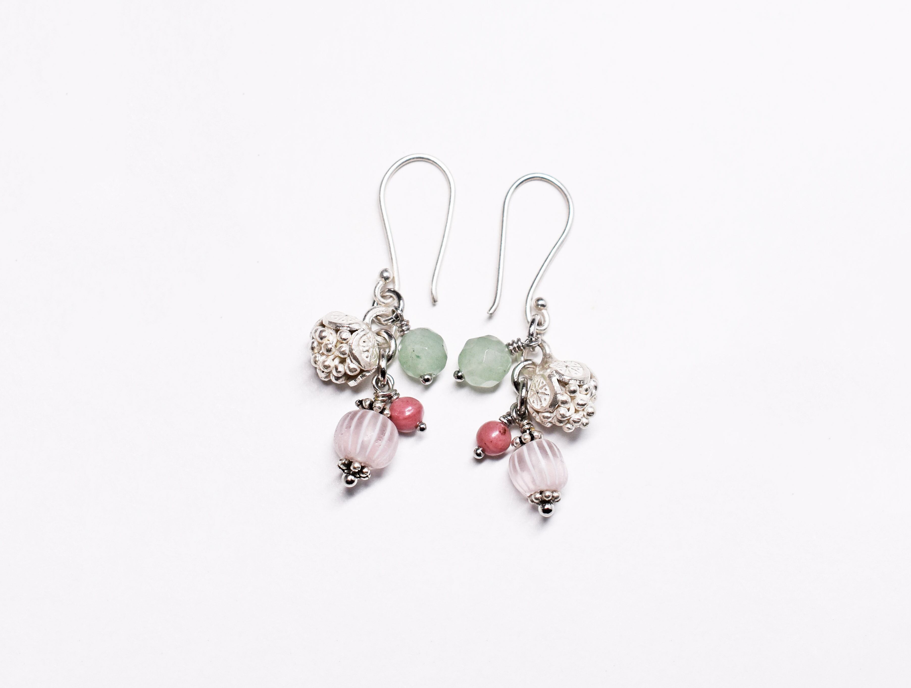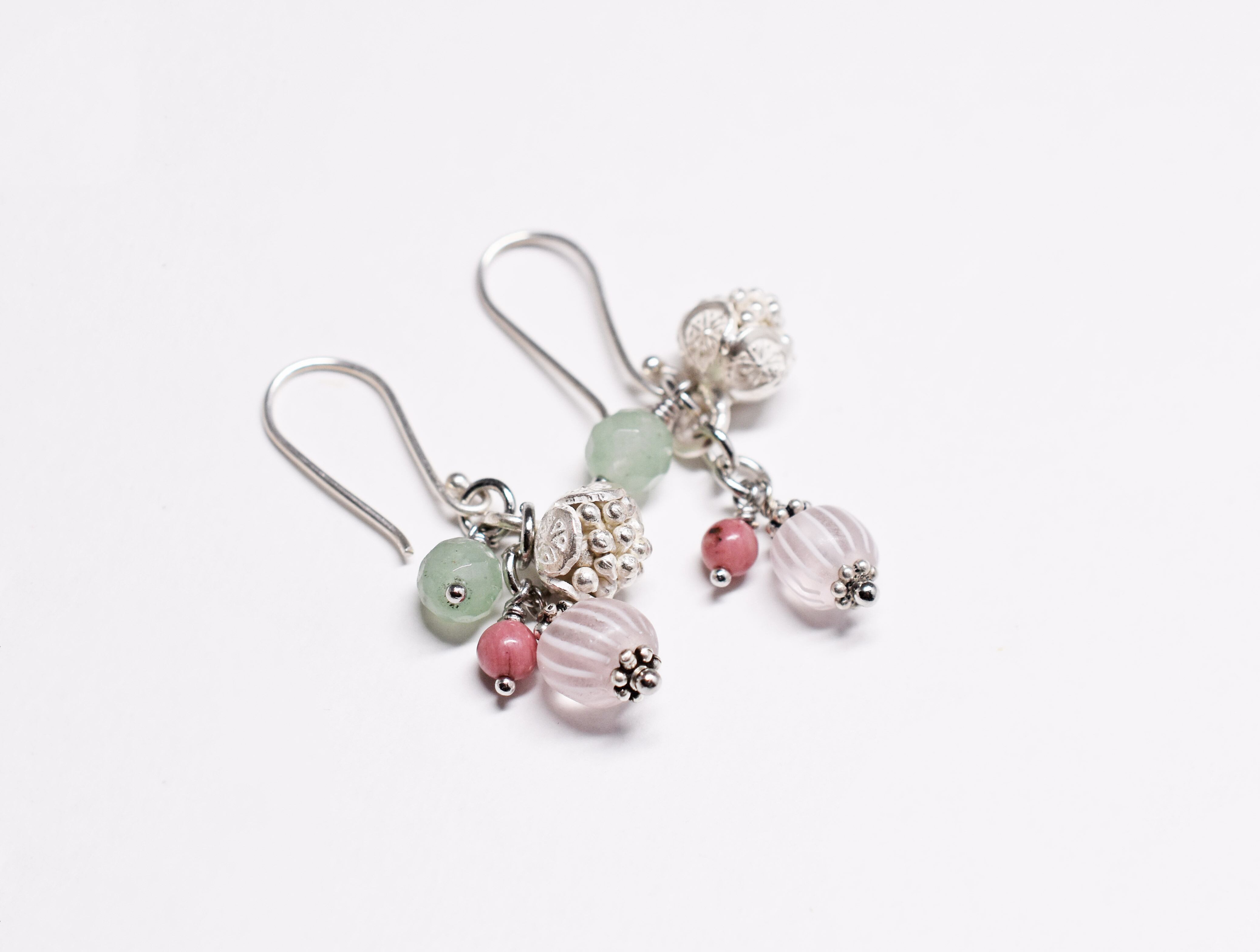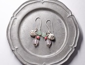 グーズベリーと、ロードナイト、グリーンアベンチュリン、カレンシルバーチャームを繋いだピアスです。