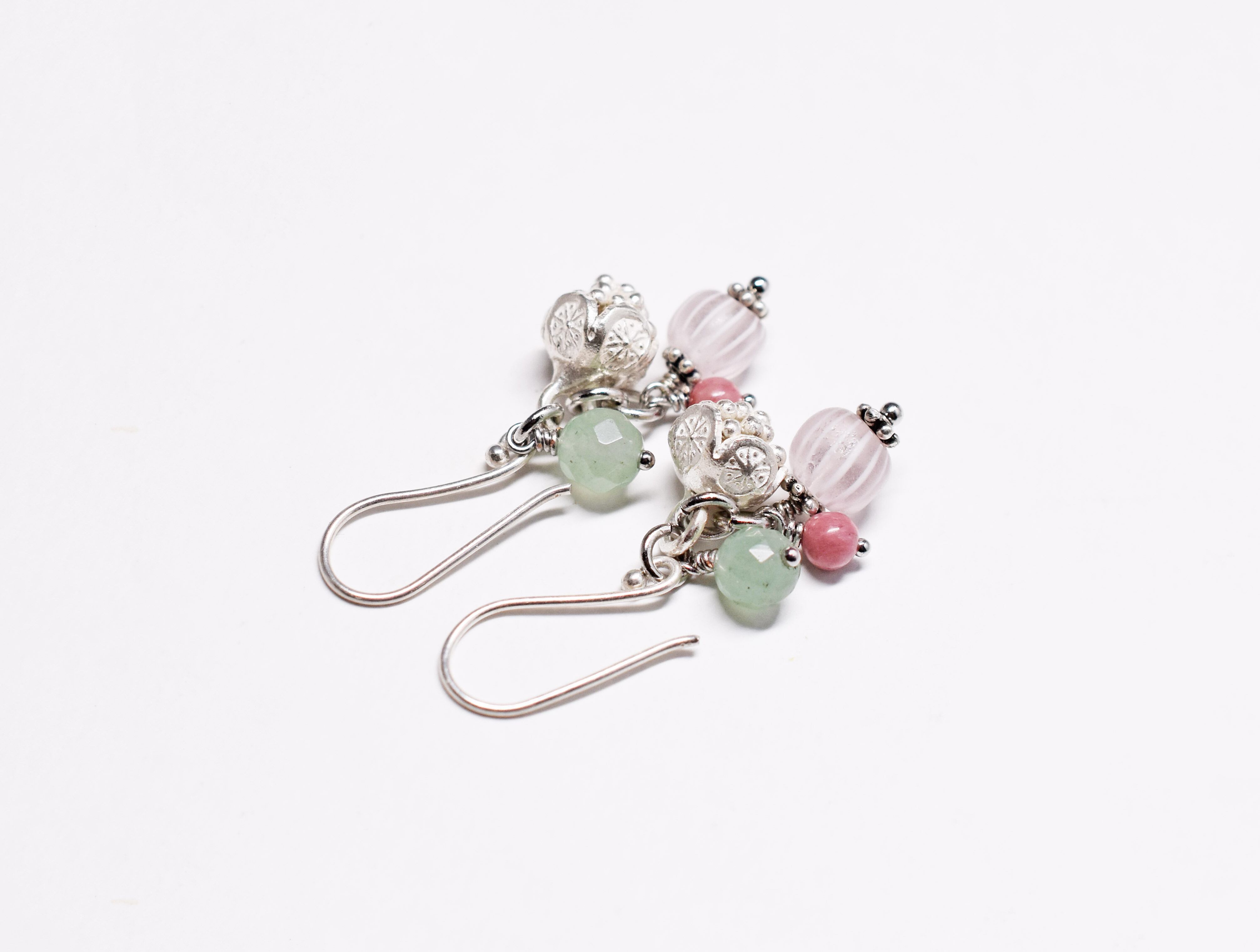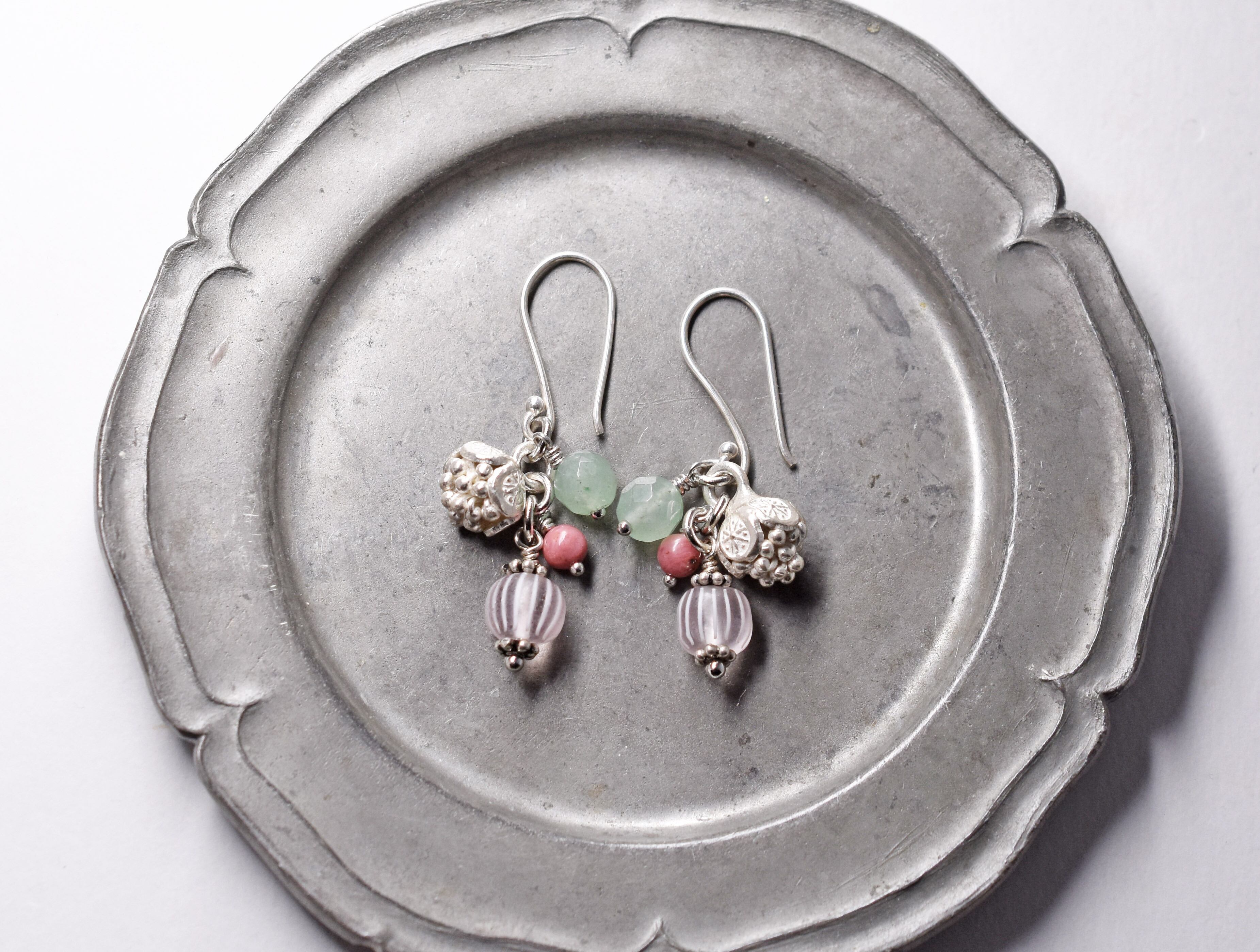 グーズベリー、ロードナイトとグリーンアベンチュリン、コロンと丸いお花カレンシルバーのピアス