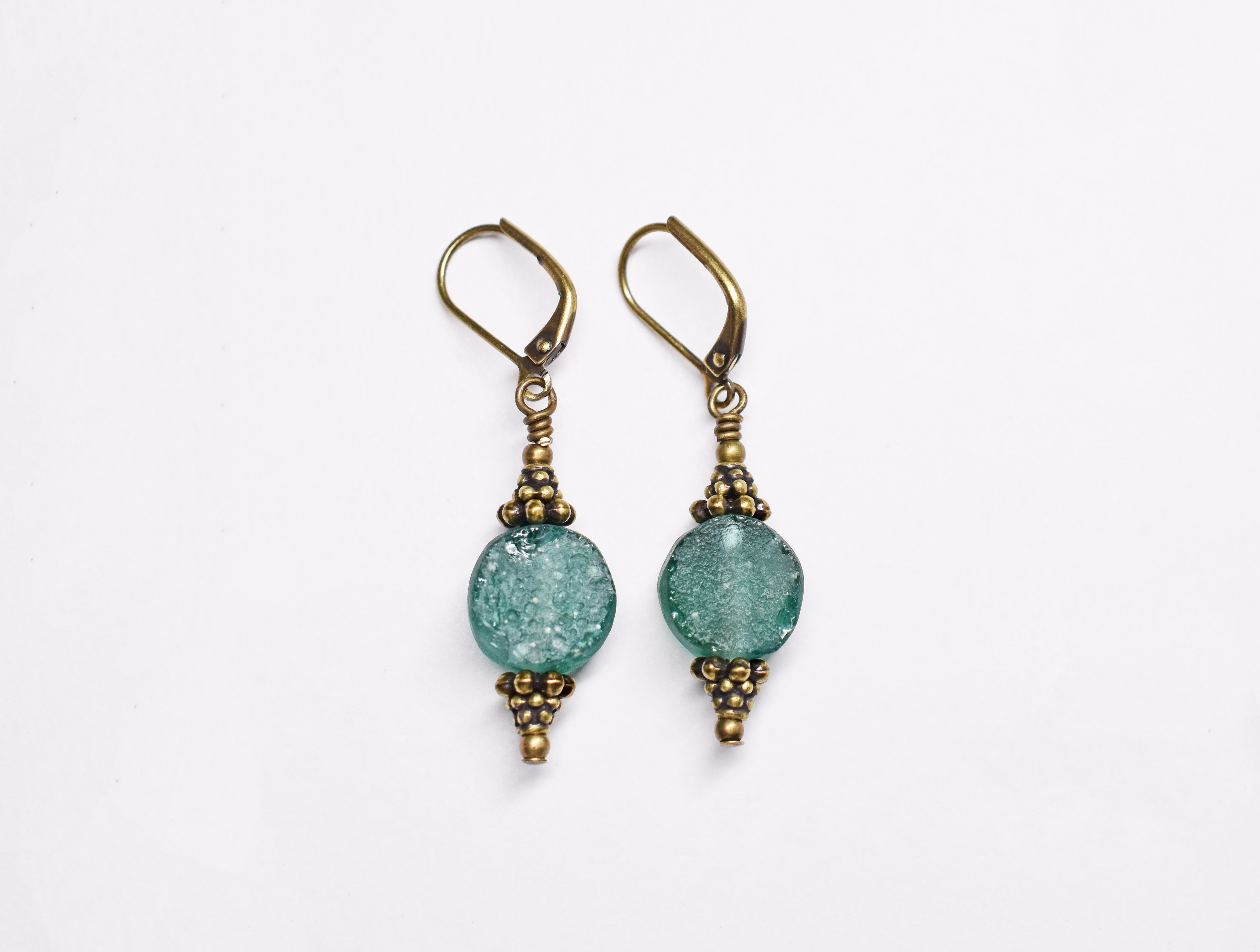 ぽってりとした厚みのあるローマングラスを繋いだピアスです。