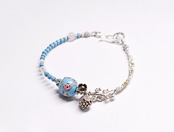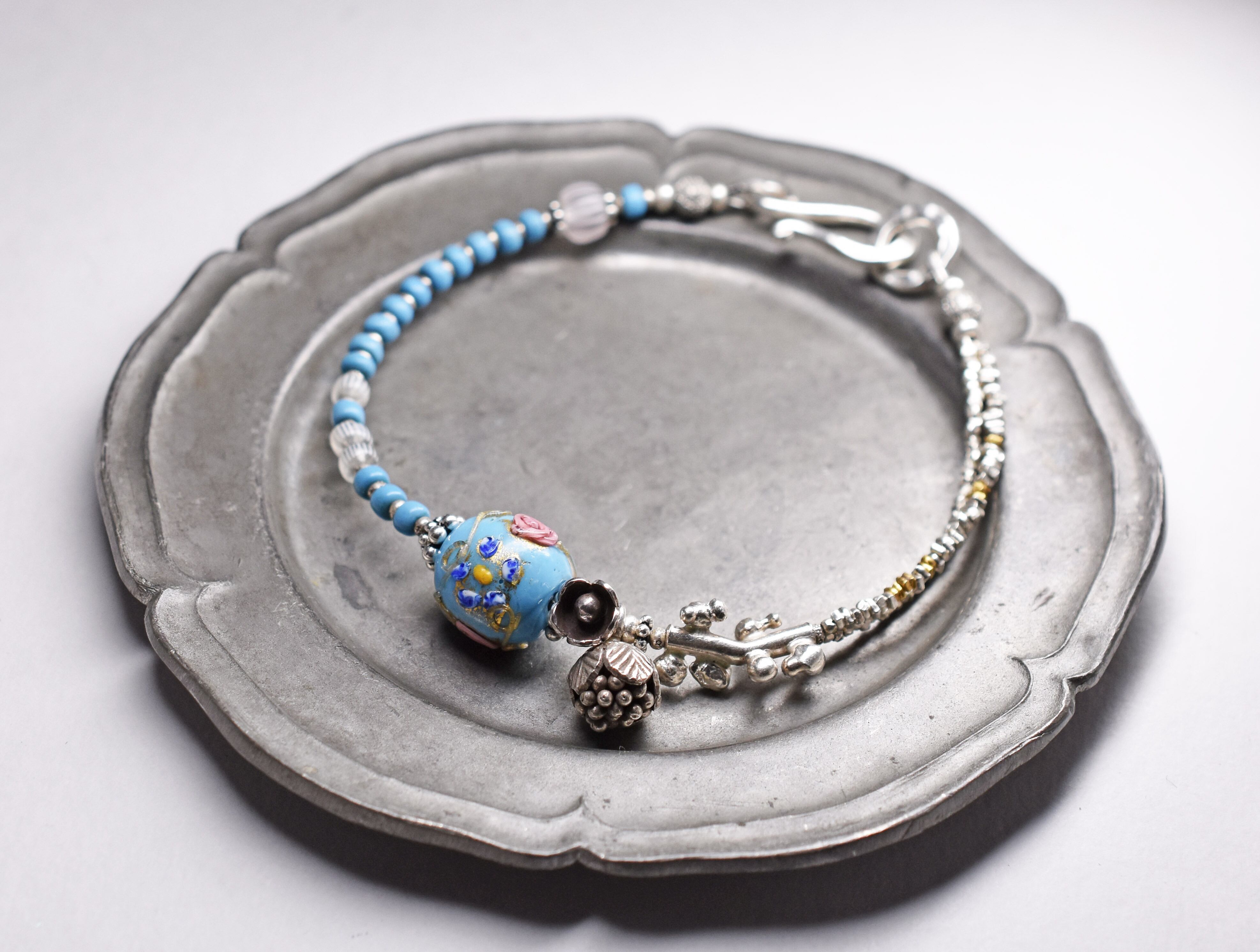 勿忘草と薔薇の空色ビーズのボタニカルなカレンシルバーのブレス