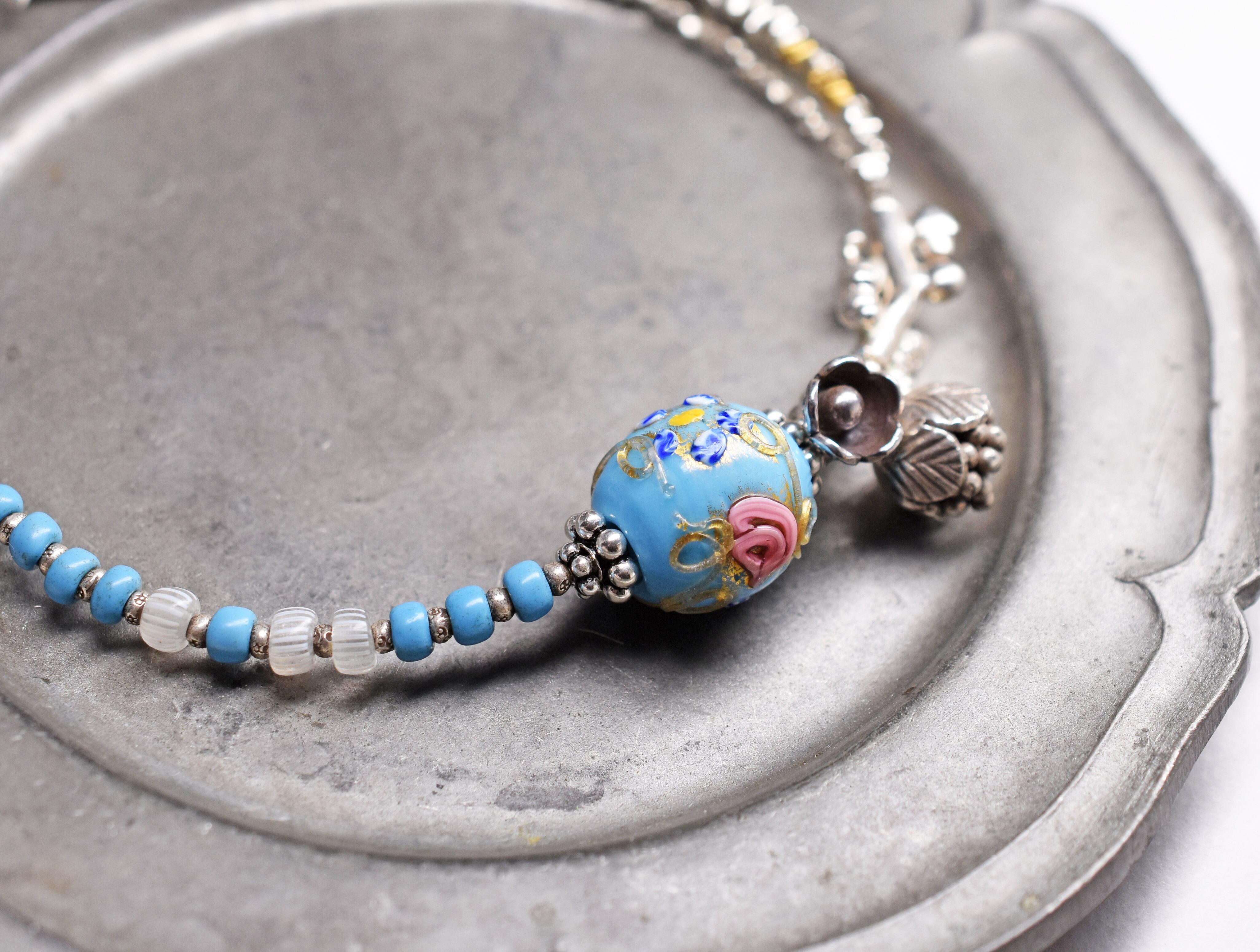 水色のビーズもベネチアのアンティークビーズです。少し不揃いでお饅頭のようなかたちが可愛いです(^^)