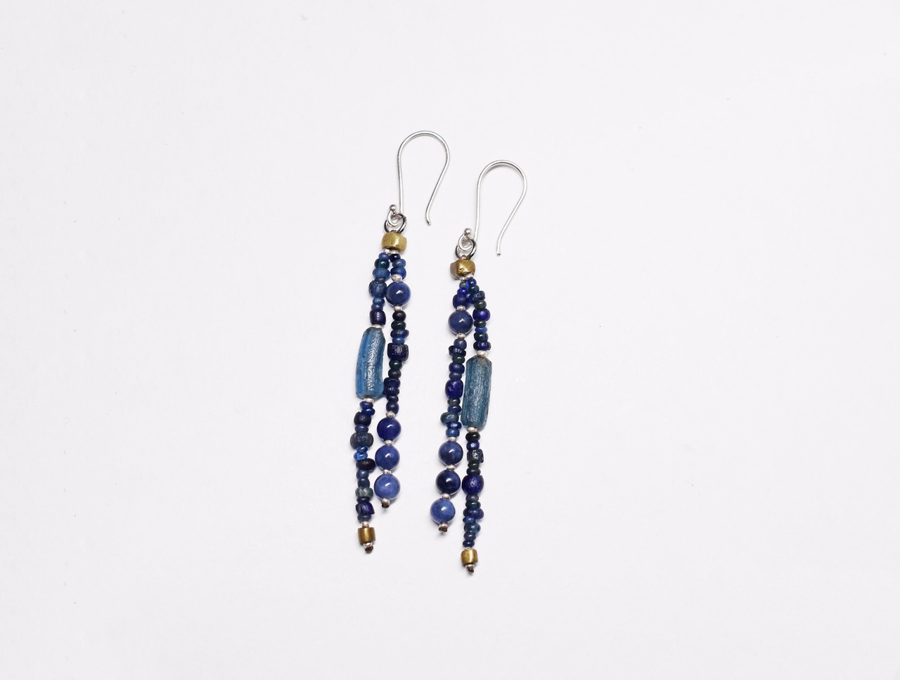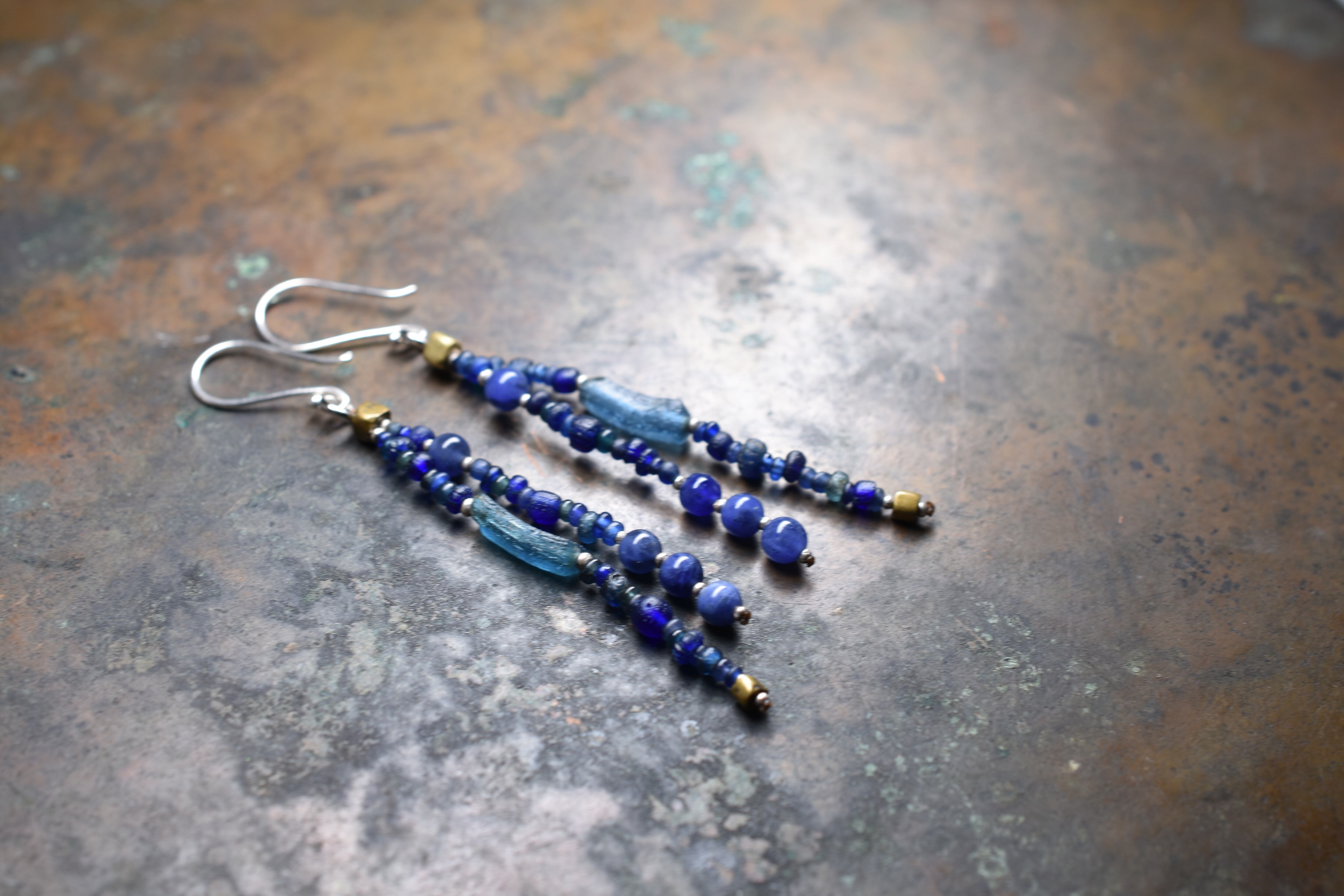 様々な時代、様々な色合いのブルーが楽しめる、オールブルーのちょっと長めのピアスです。