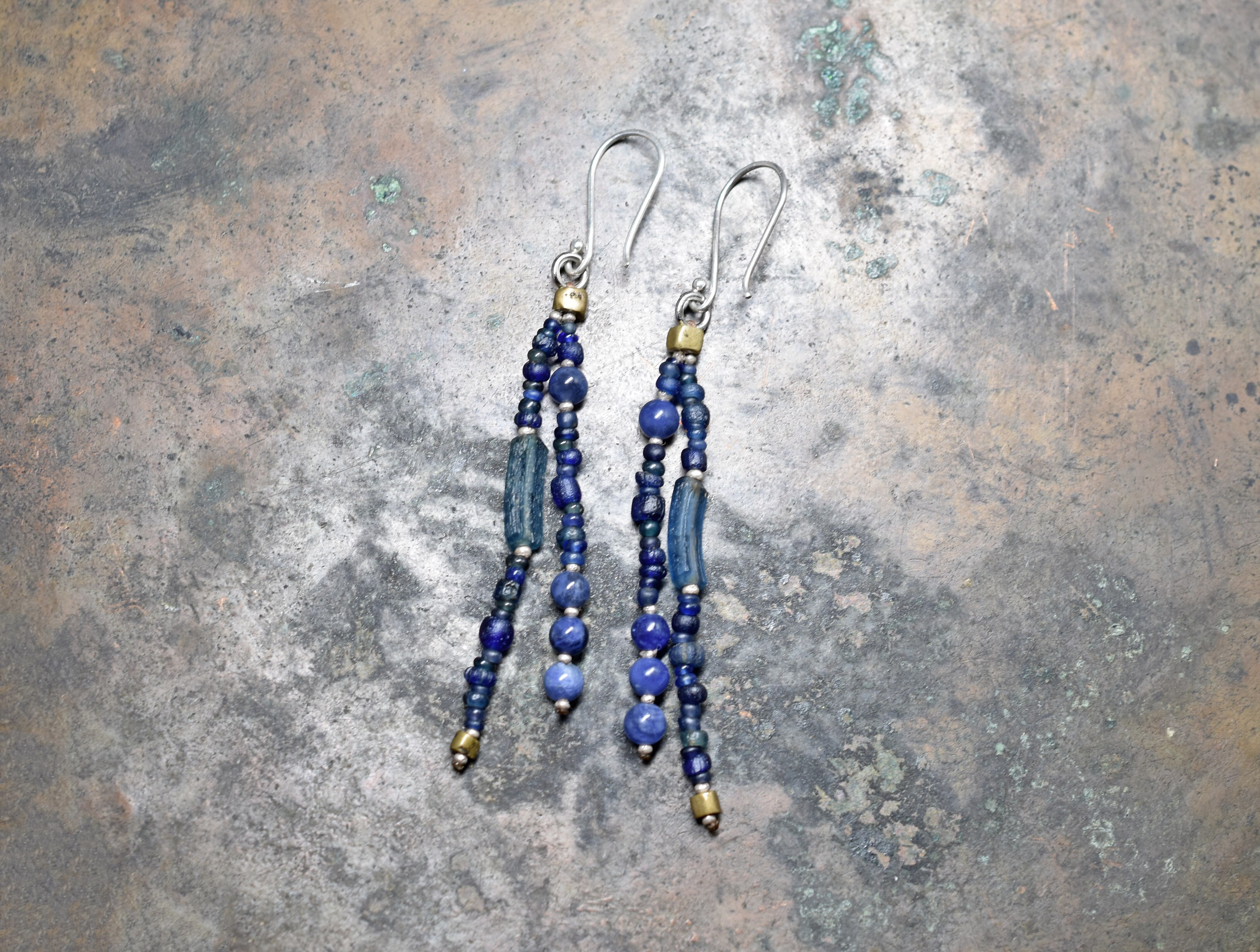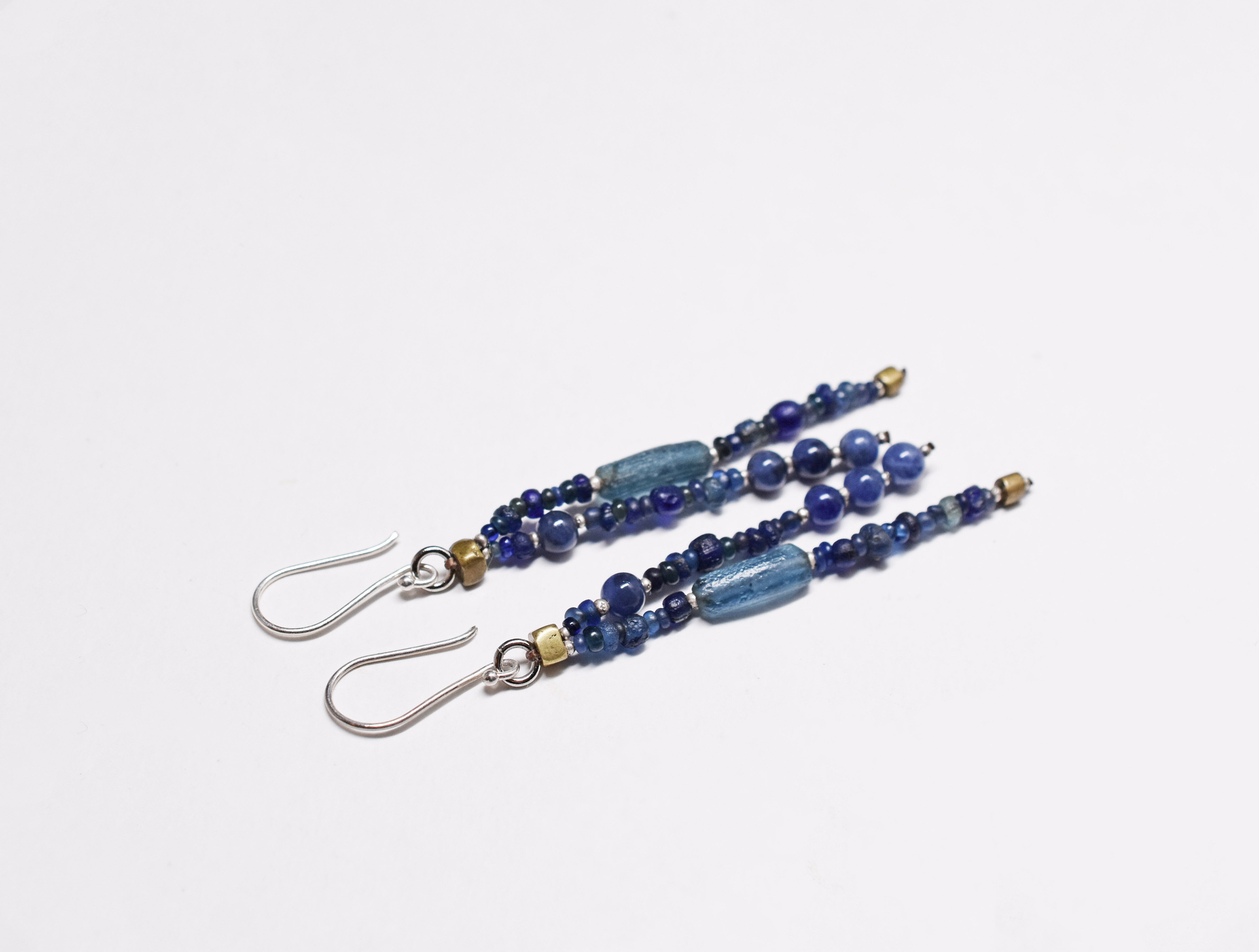 ローマングラスと発掘ビーズ、ソーダライトのオールブルー2連ピアス